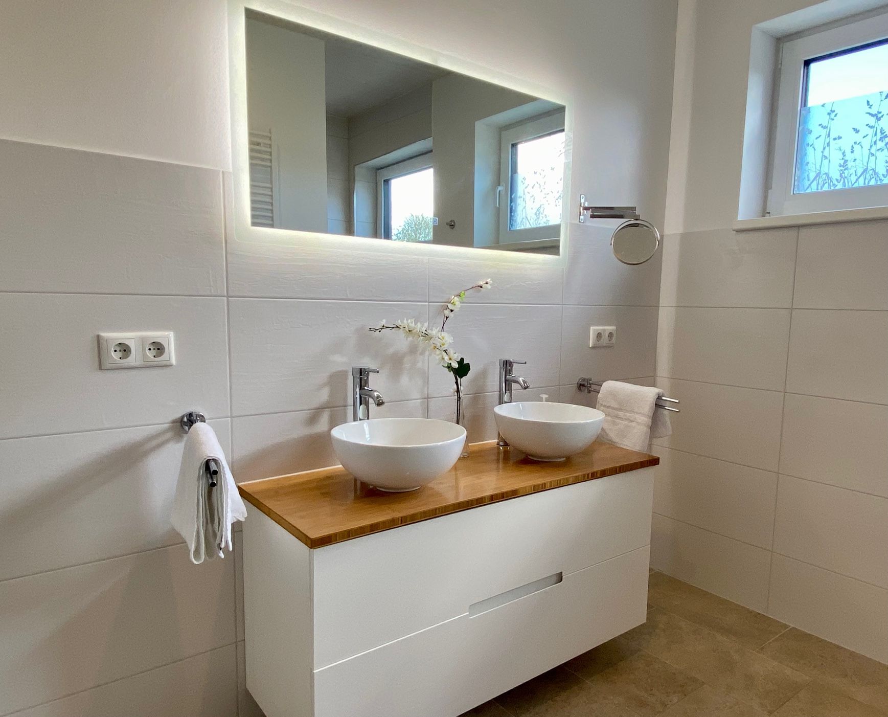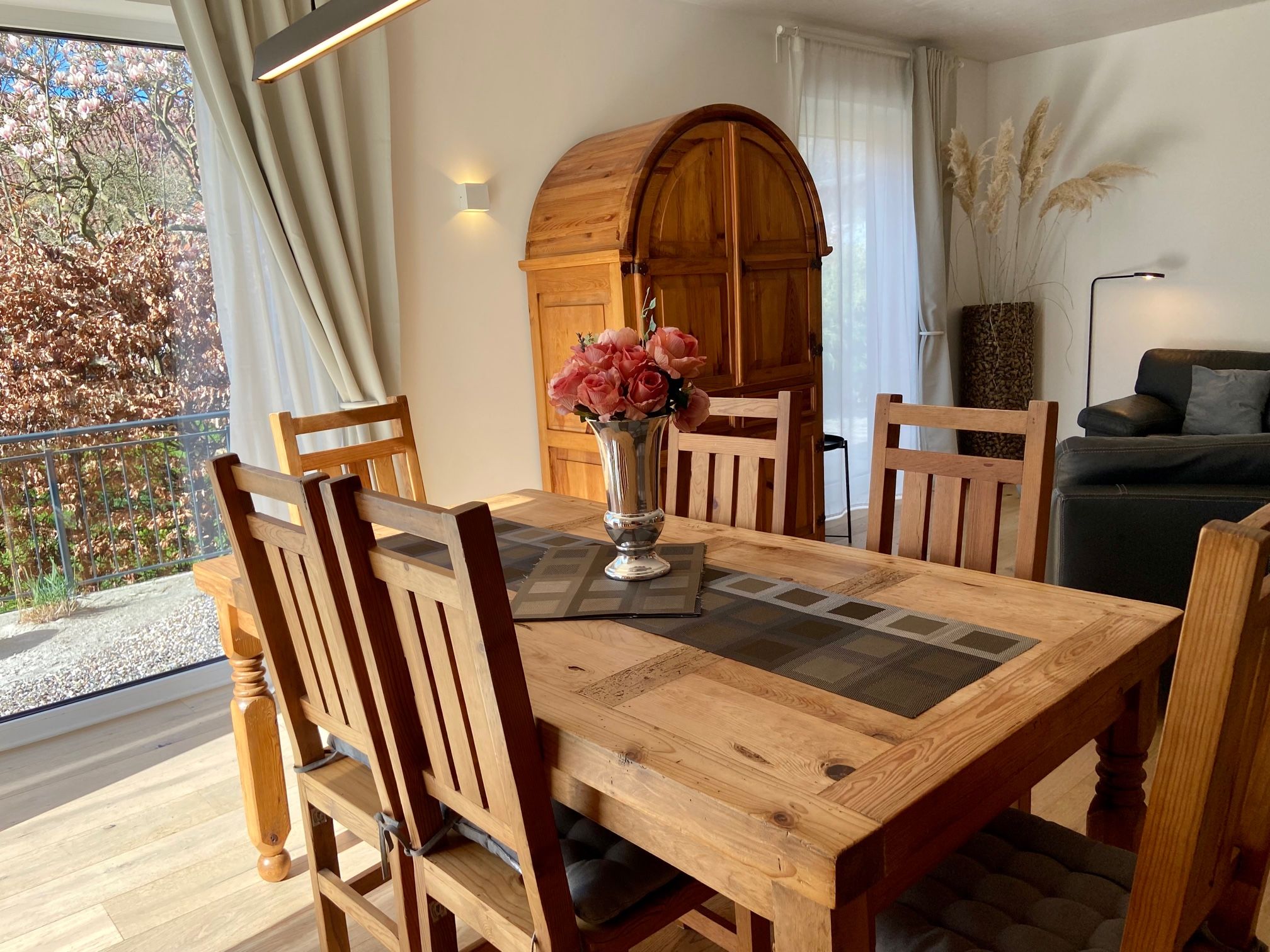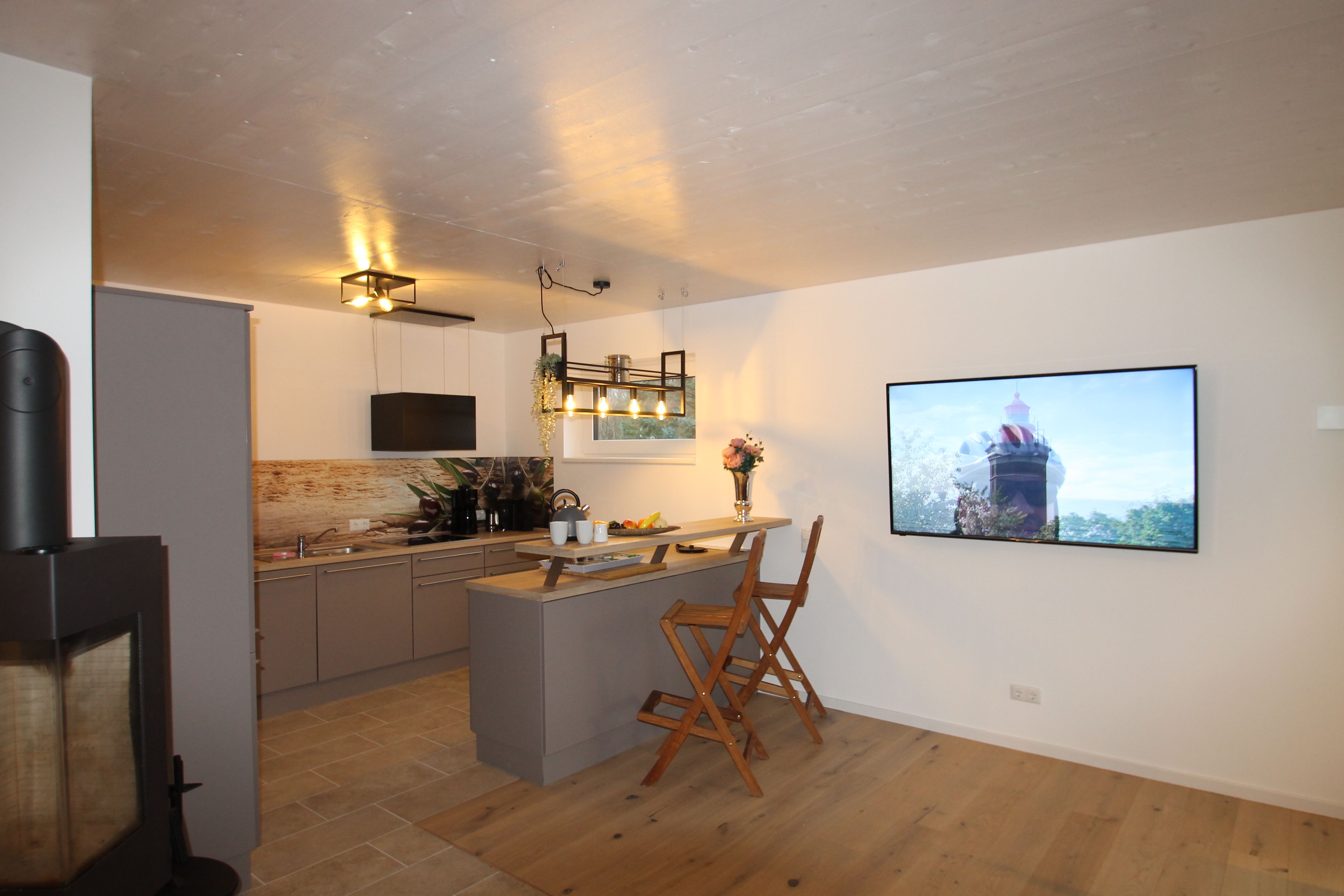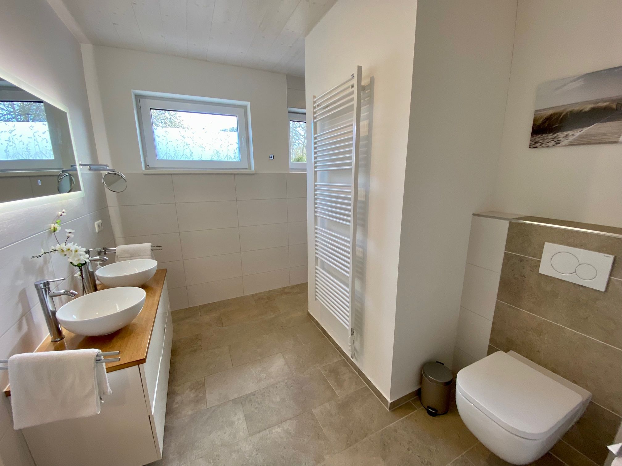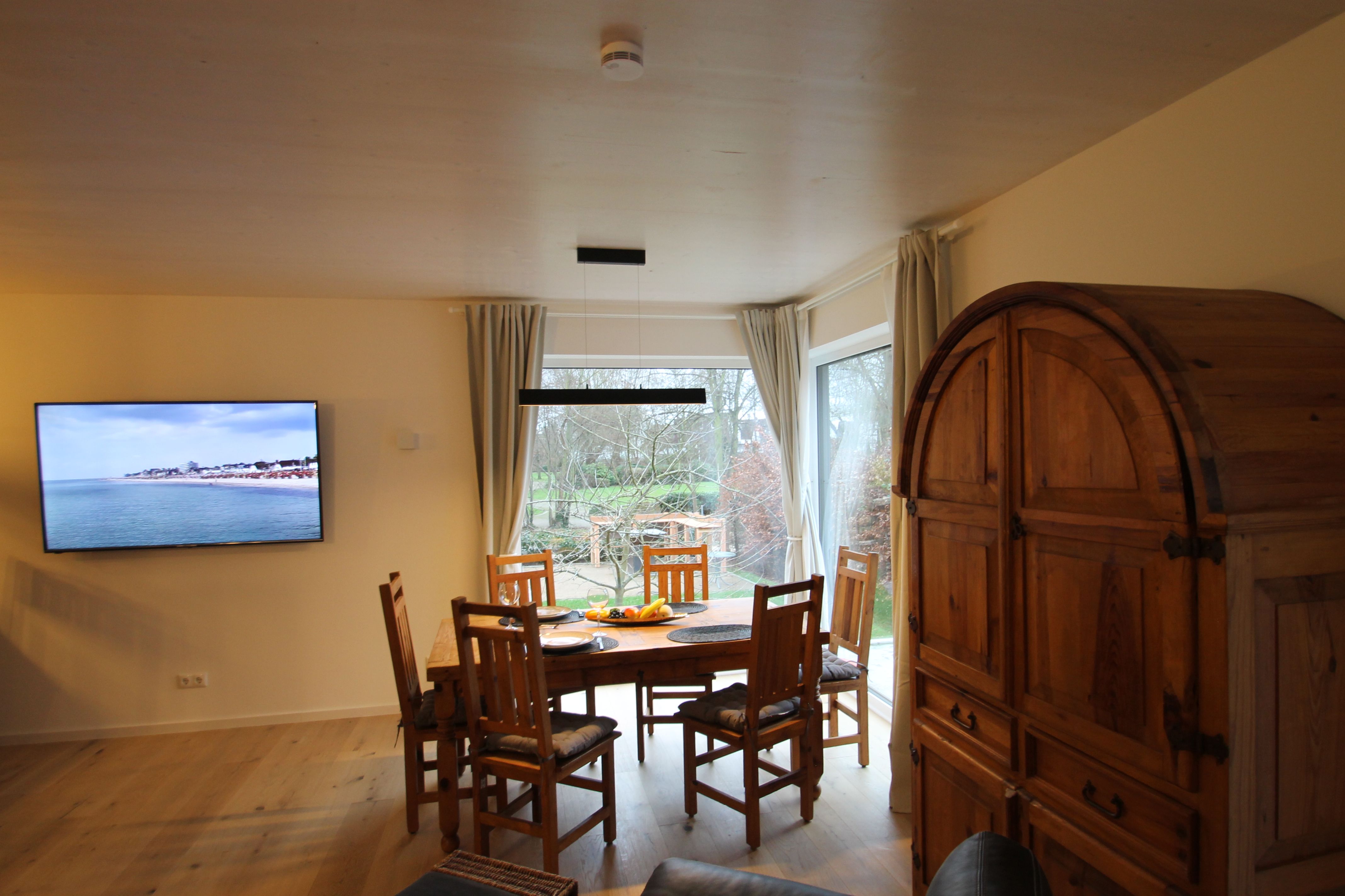 Sehr ruhig gelegene Ferienwohnung mit Blick zum Kurpark. Die Wohnung besticht durch die gelungene Verbindung zwischen Moderne und Klassik. Die mit hochwertiger Ausstattung eingerichtete Ferienwohnung wirkt durch den schönen, großen Esstisch aus massivem Eichenholz und die schöne Wohnzimmervitrine ganz besonders edel. Ein Fernseher mit dem Maß 75 Zoll ist das Highlight für perfekte Sport-Events und Spielfilme. Der Wohnraum - mit Kaminofen, der im Winter neben der Fußbodenheizung zusätzlich wohlige Wärme spendet - ist zur Küche hin offen gestaltet und lädt zu ausschweifenden Kochabenden ein. Zwei Schlafzimmer - jeweils mit Doppelbett (1 x 180x200 cm) und Flachbildschirm bieten 4 Personen wohligen Schlaf. Ein Wohlfühlbad mit bodengleicher Dusche und ein Gäste-WC sind Teil dieser sehr schönen Neubau-Ferienwohnung. Auf der eigenen Terrasse haben Sie die Möglichkeit, im Strandkorb zu entspannen. Auf dem rückwärtigen Grundstück ist ein fester Grillplatz für die Hausgäste eingerichtet. Der PKW-Stellplatz befindet sich direkt am Haus. Durch ein Gartentor gelangt man in wenigen Minuten zu Fuß direkt zum Kurpark und zum schönen Hauptstrand von Dahme. Der Anlegeplatz für Ihren Traumurlaub in Dahme! Ihre mitgebrachten Fahrräder können Sie im Garten abstellen. Ein gemütlicher Grillplatz im Garten lädt zum Verweilen ein. Und sollten Sie doch mal arbeiten wollen, finden Sie im Schlafzimmer einen Schreibtisch mit LAN-Kabel. Der WLAN-Anschluss ist inklusive.