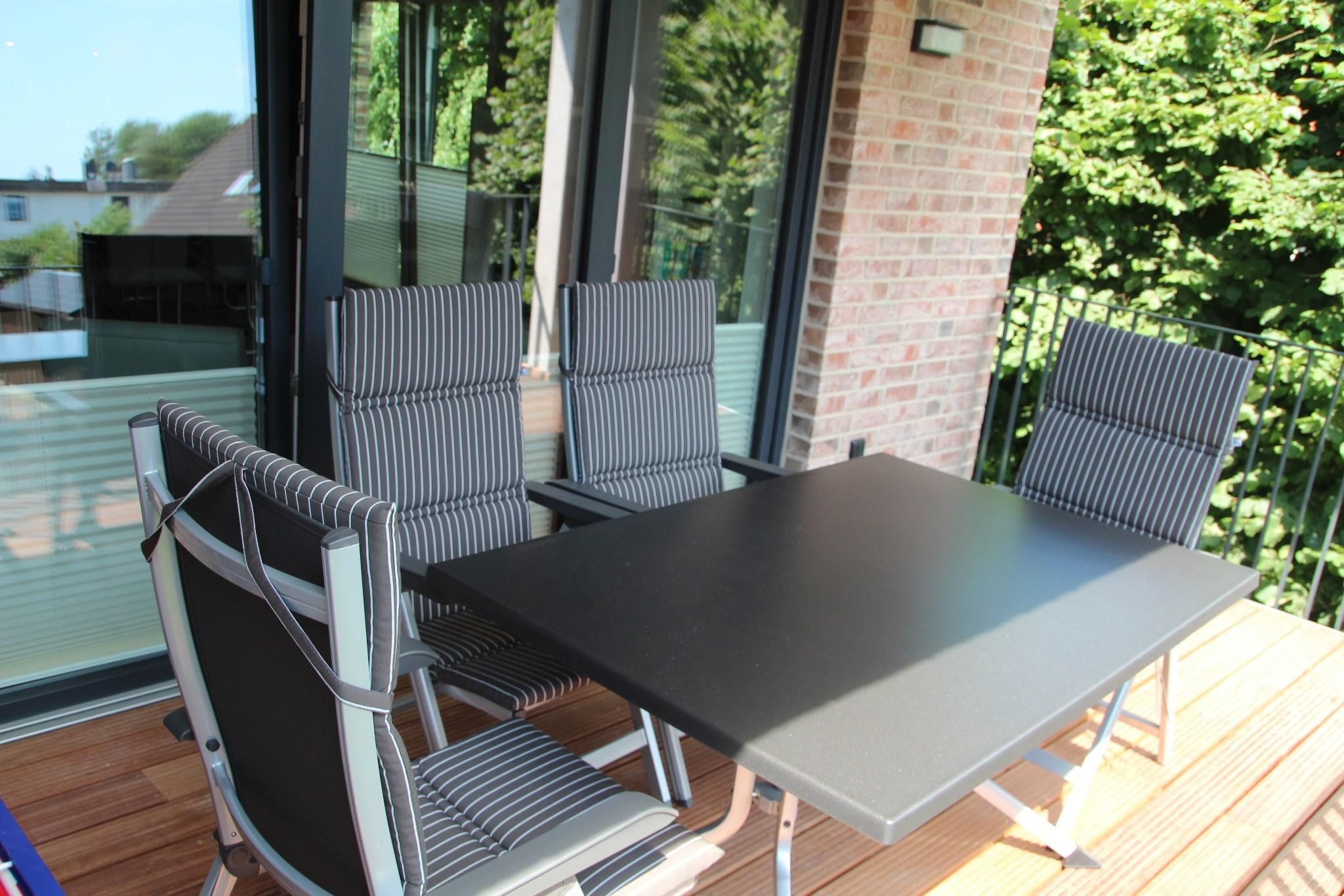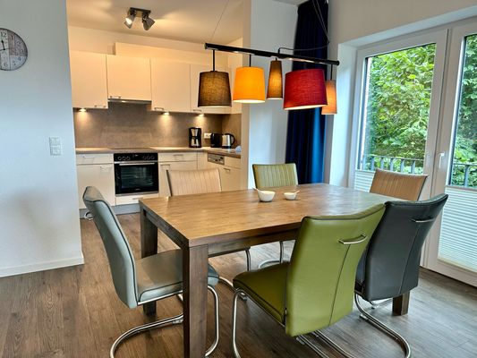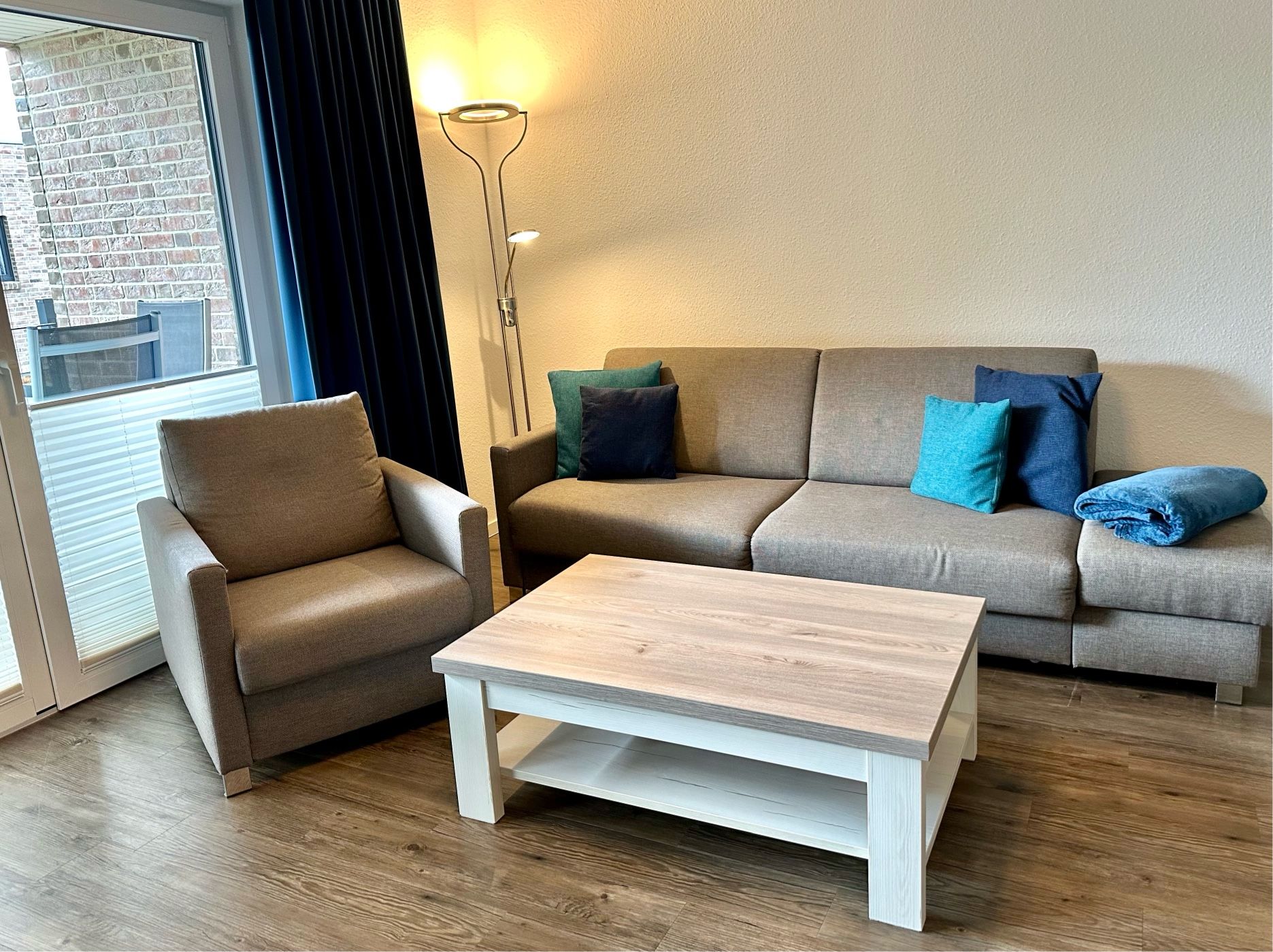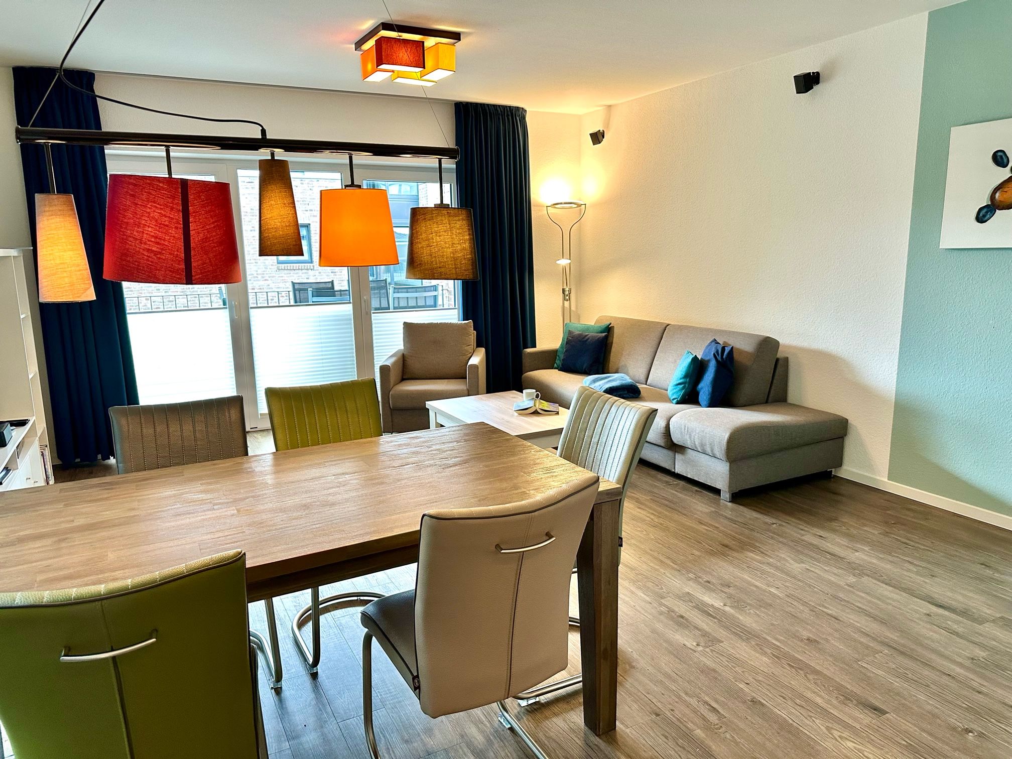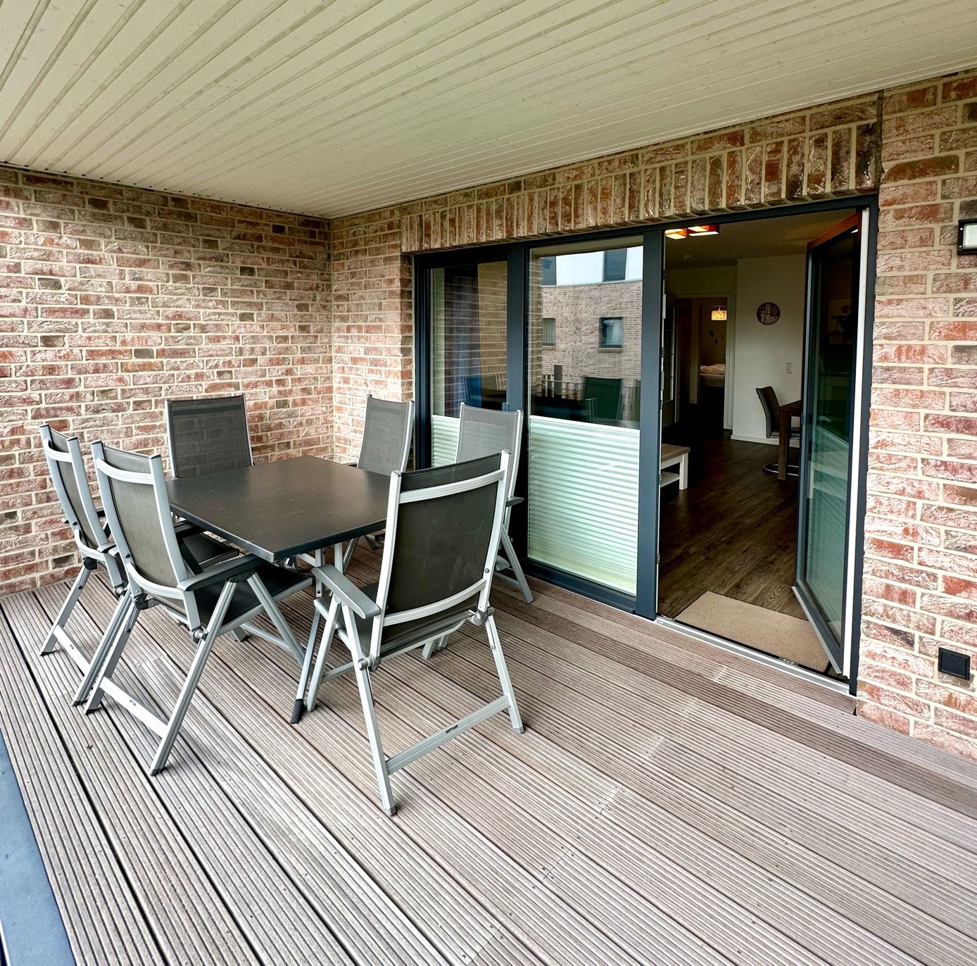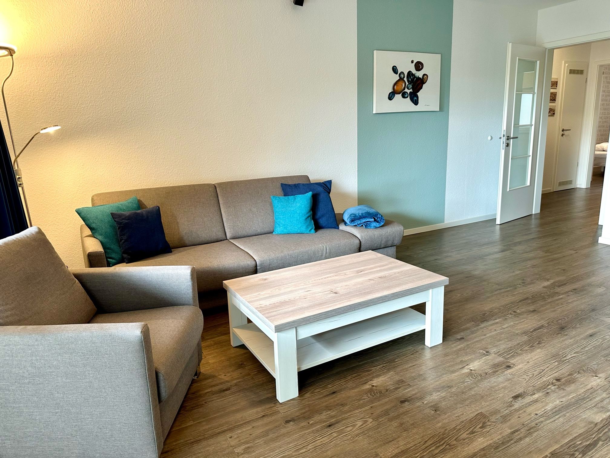 Die Wohnung befindet sich im ersten Obergeschoss einer kleinen, gepflegten Wohnanlage und bietet auf 88 m² viel Raum für bis zu sechs Personen. Zwei gemütliche Schlafzimmer (eins mit hochwertigem Boxspringbett, eins mit zwei Einzelbetten) und ein großzügiges Wohn-/Esszimmer mit Schlafcouch und offener, voll ausgestatteter Küche sorgen für Wohlfühlatmosphäre. Der möblierte Balkon mit Gartenblick lädt zu entspannten Stunden ein – vielleicht mit einem Glas Wein nach einem Tag am Meer?