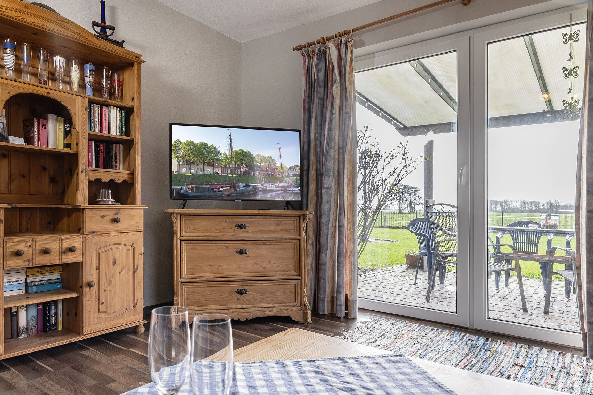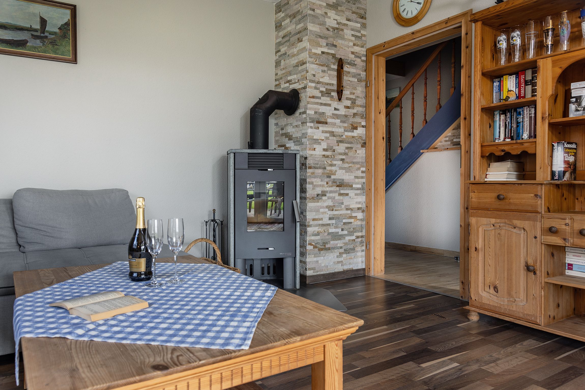 Wohnzimmer mit Kaminofen, Sat-TV, Radio, Ausgang zur überdachten Südterrasse mit unverbautem Blick auf die Felder.