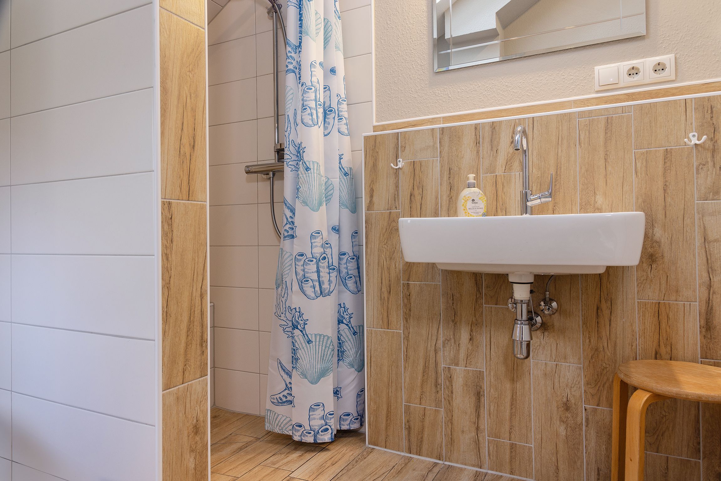 Große separate Küche mit Kinderhochstuhl, Bad mit Dusche und WC, ein Schlafzimmer mit Doppelbett.