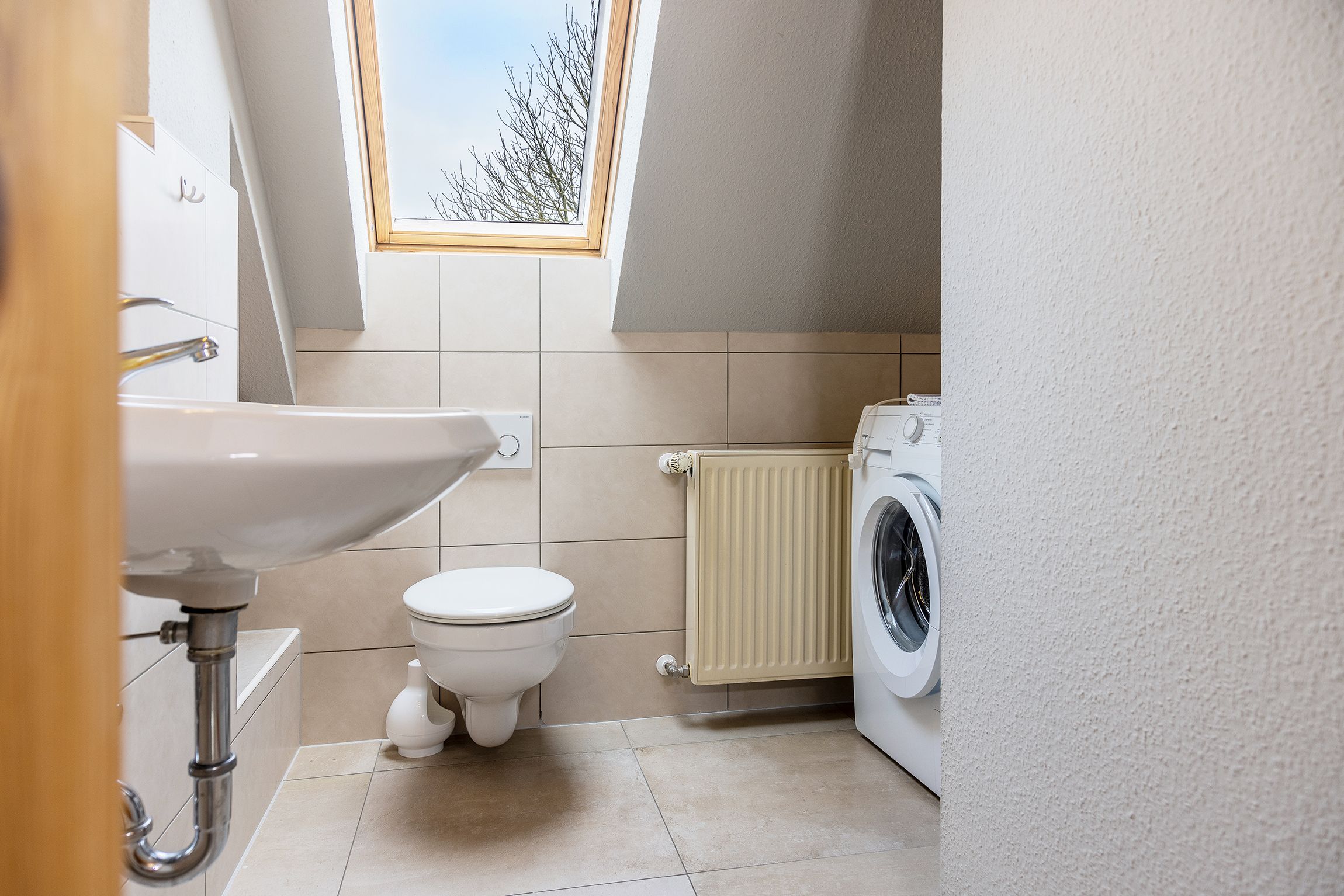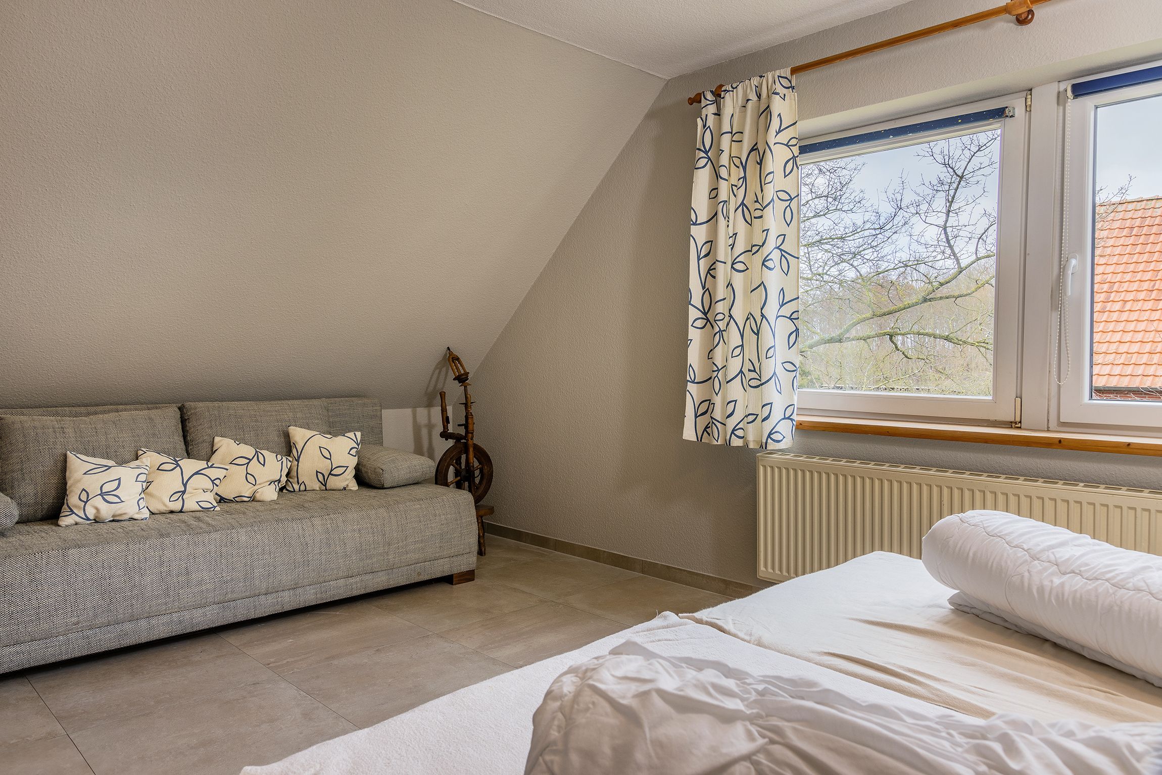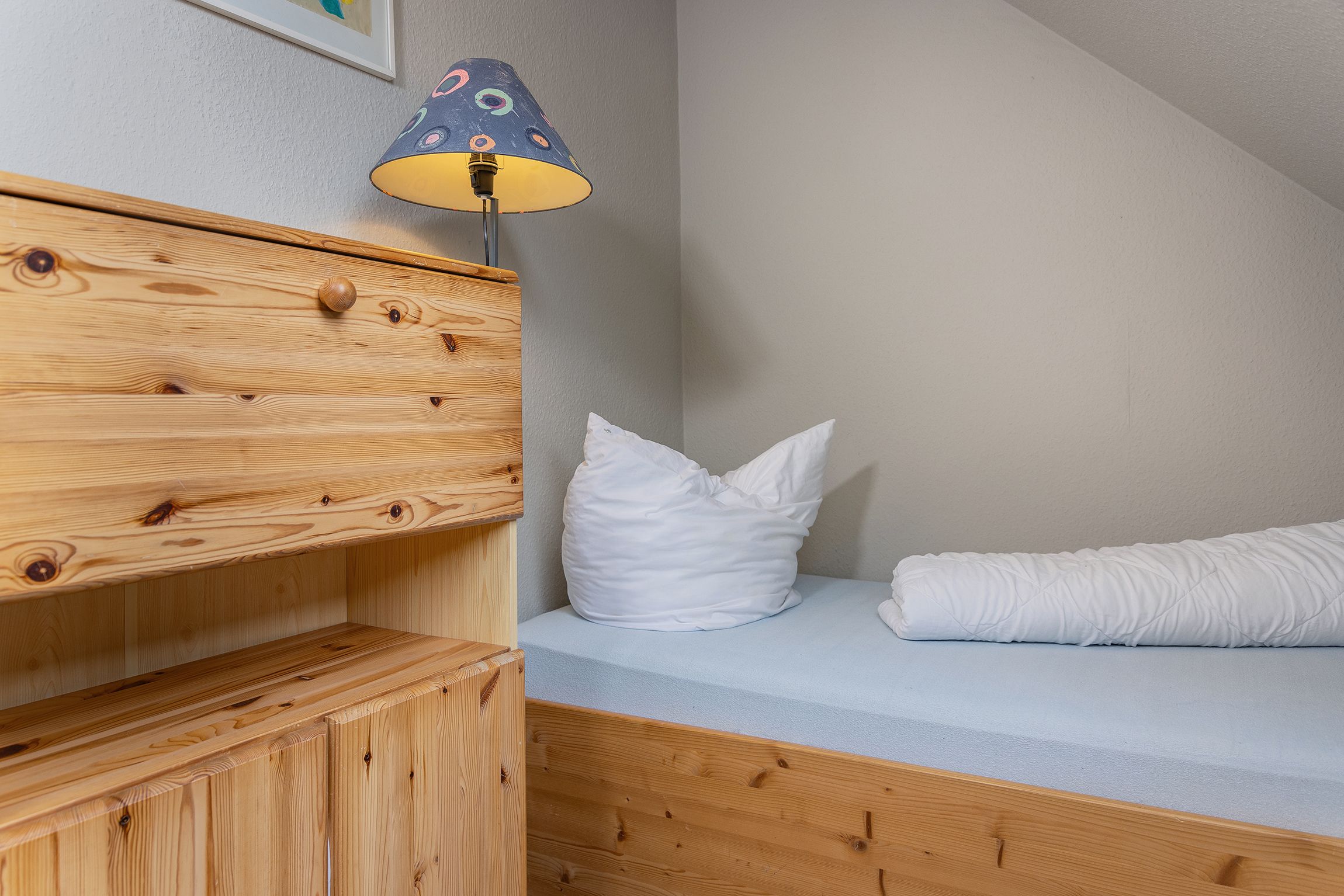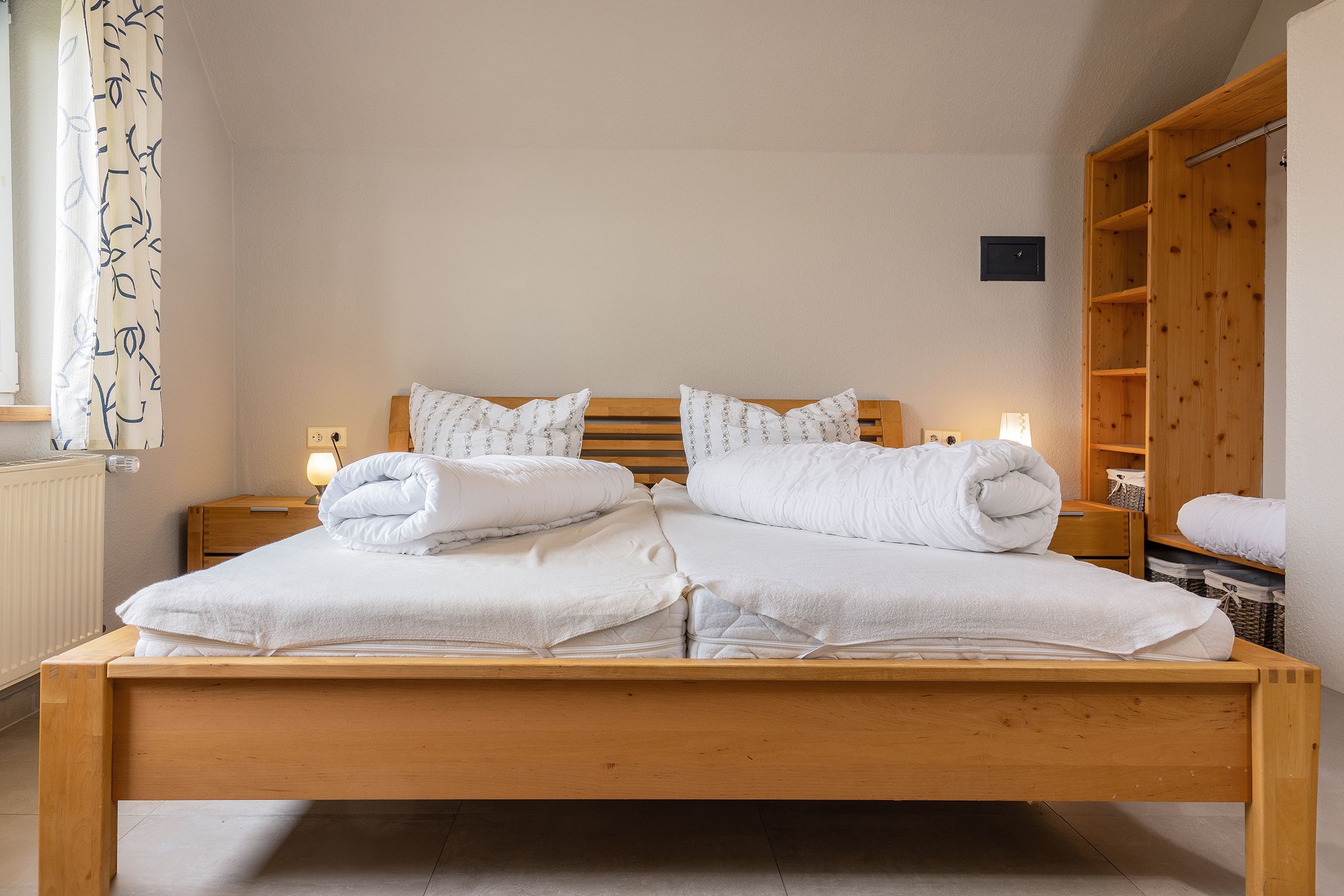 1 großes Schlafzimmer mit Doppelbett und mit Wohnplatz, 1 Schlafzimmer mit Einzelbett, zustellbares Kinderreisebett, Gäste WC, Waschmaschine.