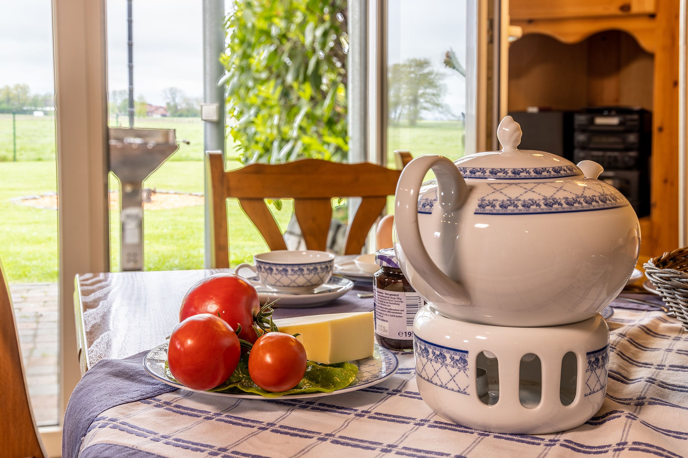 Wohn-/Essbereich mit Sat- TV, Radio, Kaminofen, angrenzende komplette Küchenzeile, Ausgang zur überdachten Südterrasse.