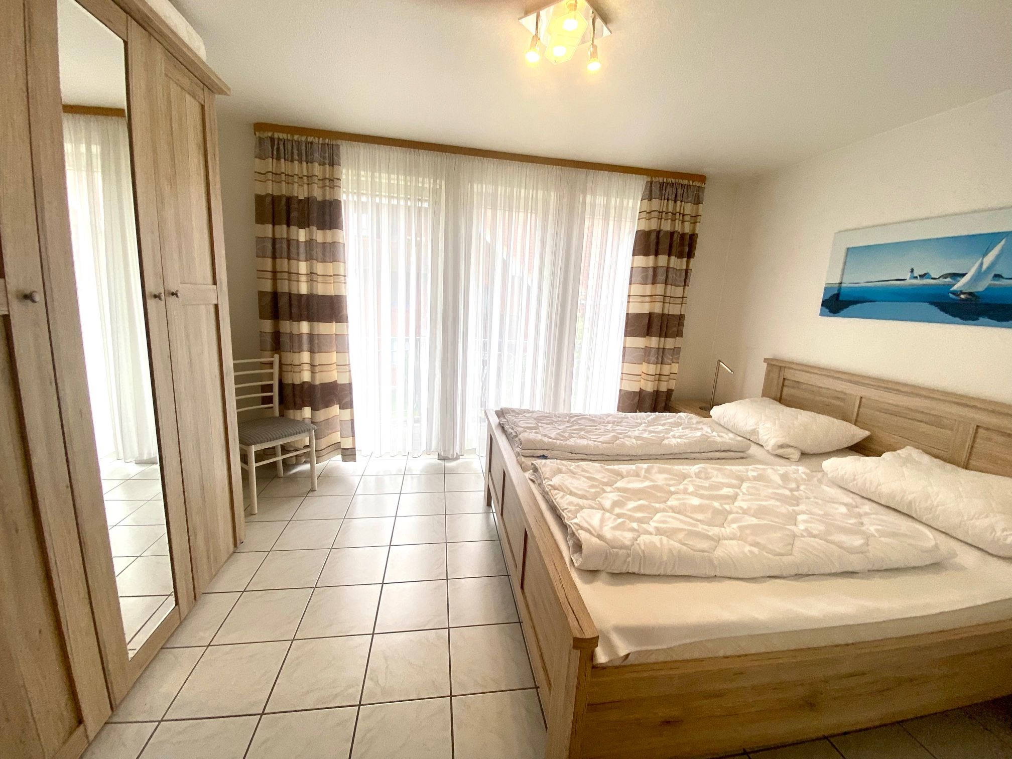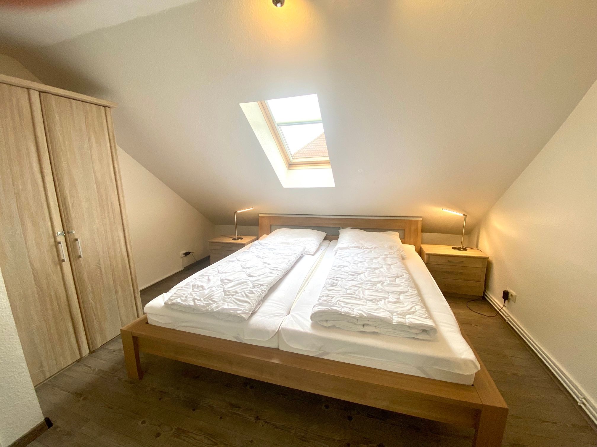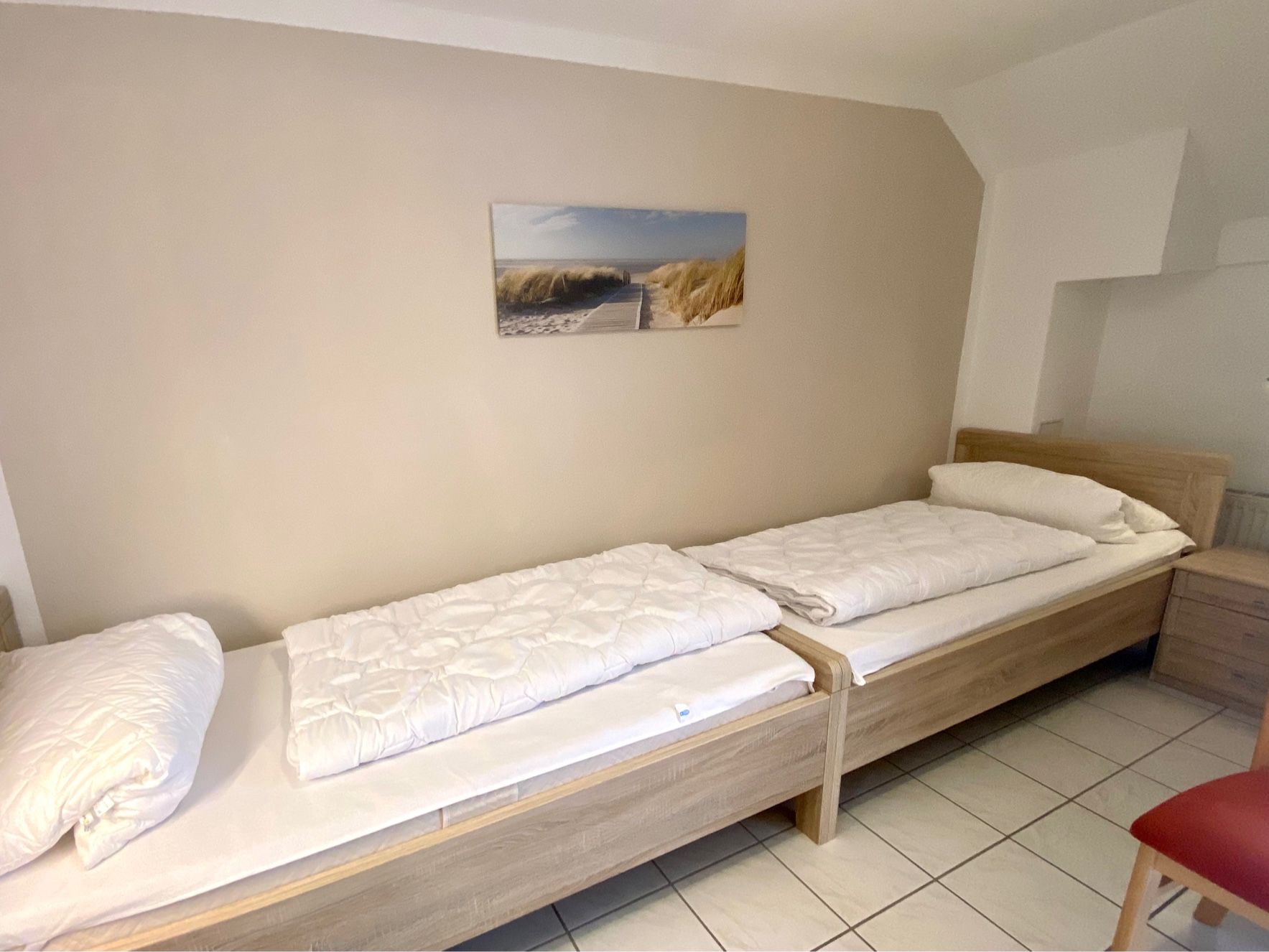 Hier mieten Sie ein tolles Reihenhaus in der Langen Wiese, nur wenige Minuten vom Strand entfernt. Das Haus hat im Erdgeschoss ein Wohn- / Esszimmer mit Zugang zur eingezäunten Terrasse, eine separate komplett ausgestattete Küche und ein Gäste-WC. Im 1.OG befindet sich das Duschbad, ein Schlafzimmer mit Doppelbett ( 90x200 cm) und Zugang zum kleinen Balkon. Das zweite Schlafzimmer ist ein Durchgangszimmer mit zwei Einzelbetten (90x190 cm) . Von hier gelangen Sie ins Dachgeschoss, wo sich das dritte Schlafzimmer mit einem Doppelbett (90x200 cm) befindet. Dieses Reihenmittelhaus liegt in strandnaher Lage und der PKW-Stellplatz befindet sich direkt vor dem Haus. Auch eine größere Familie findet hier ausreichend Schlafmöglichkeiten. Bis zu zwei liebgewonnene Vierbeiner dürfen Sie hier gerne begleiten! Außenrollläden sorgen für Schlafkomfort.