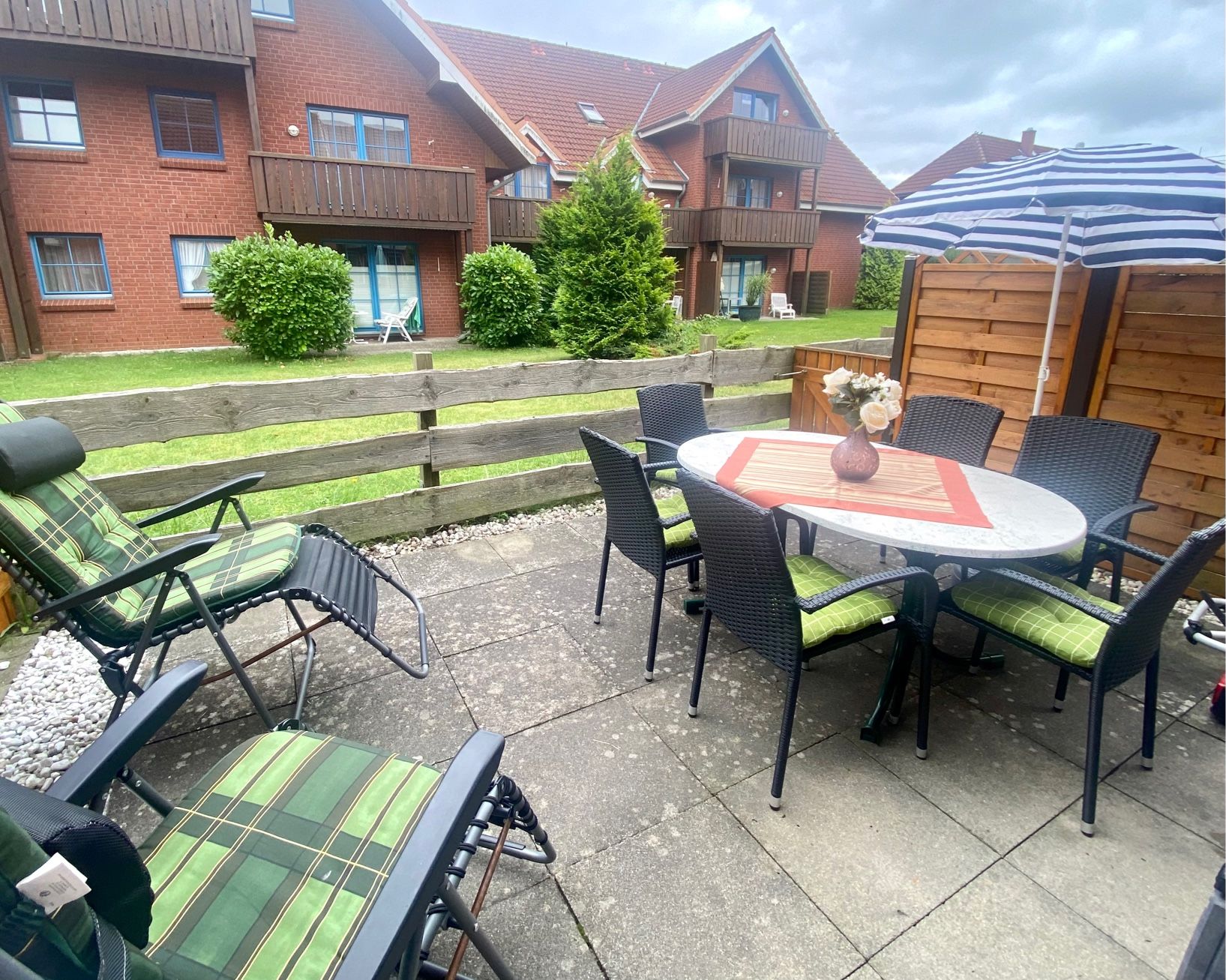Das Apartment verfügt sowohl über einen kleinen Balkon als auch eine Terrasse. Auf den bereitgestellten Gartenmöbeln können Sie wunderbar die frische Ostseeluft genießen, entspannen oder Ihre Mahlzeiten im Freien einnehmen. Ein privater Parkplatz steht direkt an der Unterkunft zur Verfügung, sodass Sie Ihr Fahrzeug jederzeit sicher abstellen können.