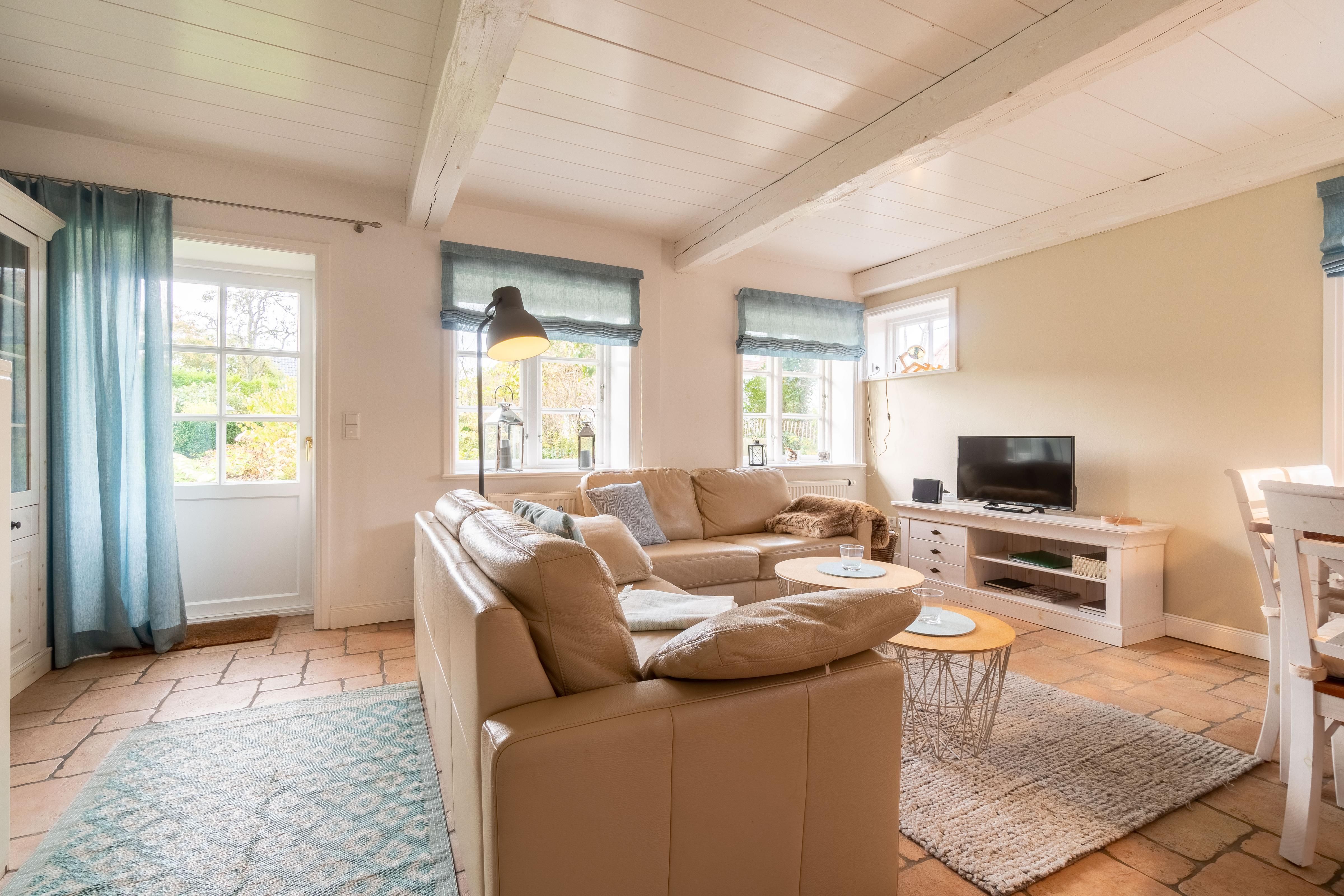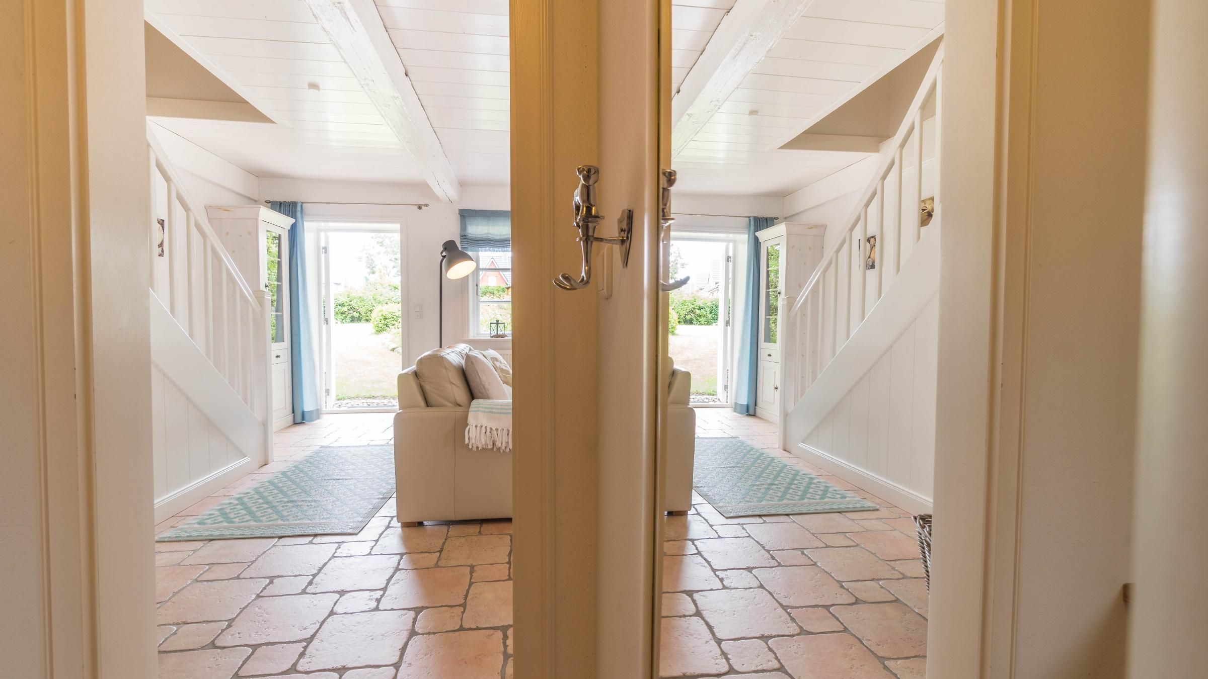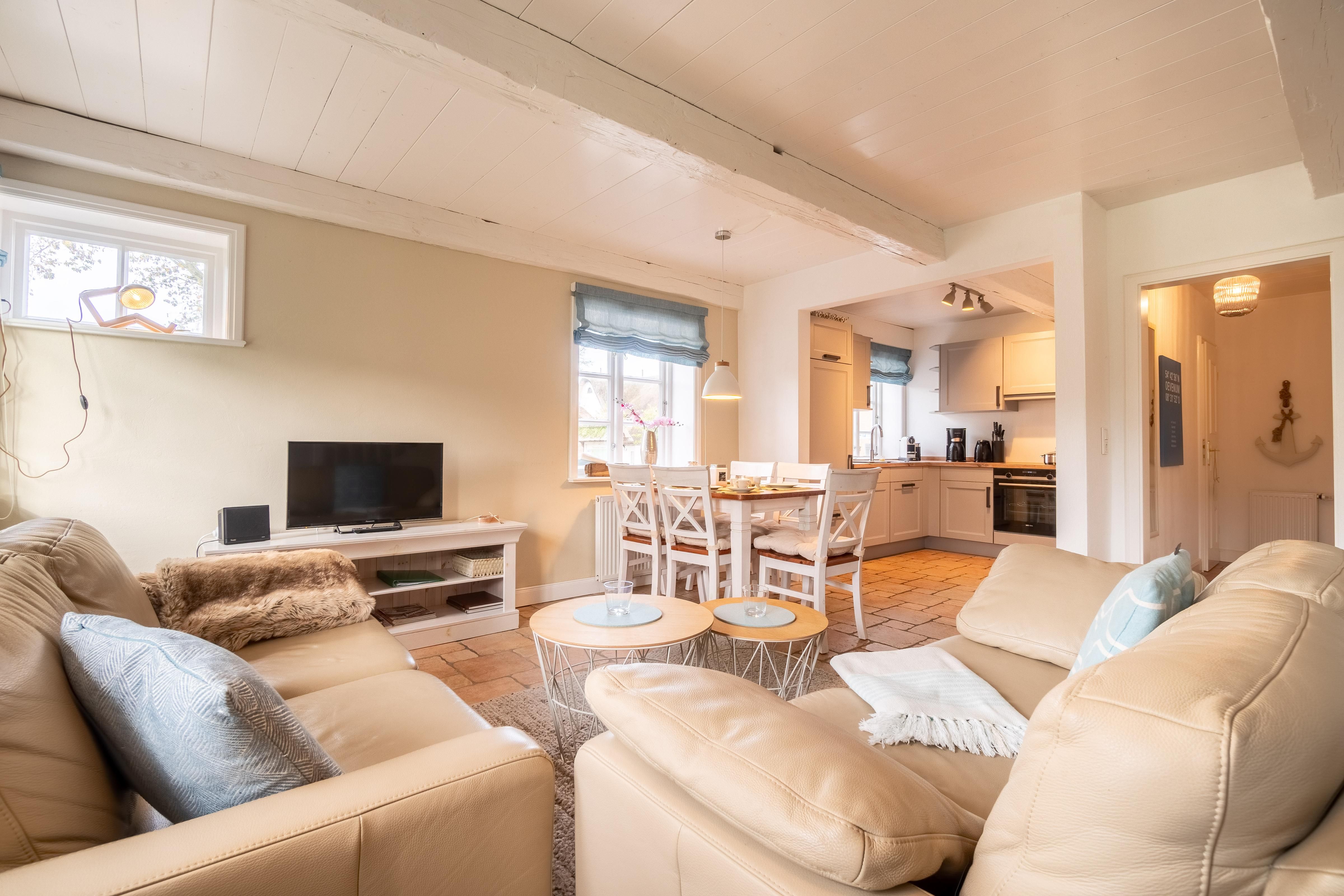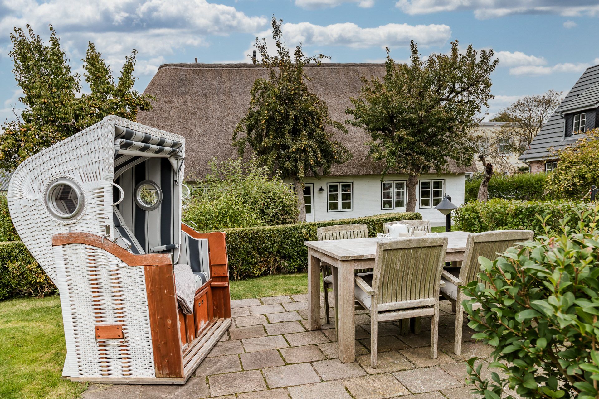Das Schulmeisterhaus ist aufgeteilt in zwei Ferienwohnungen, die sich jeweils über das Erd- und Obergeschoss erstrecken. Links ist die Ferienwohnung "Große Pause" gelegen und rechts die "Kleine Ferien". Ein wunderschöner Garten mit alten Obstbäumen, von denen Sie sich selbstverständlich bedienen können, rundet das Ambiente ab. Jeder Ferienwohnung ist ein eigener Terrassenplatz zugeordnet, welcher neben dem Gartenmobiliar auch über einen Sonnenschirm und einen eigenen Strandkorb verfügt. Auch ein eigener Wohnungs-PKW-Stellplatz ist direkt am Haus gegeben.