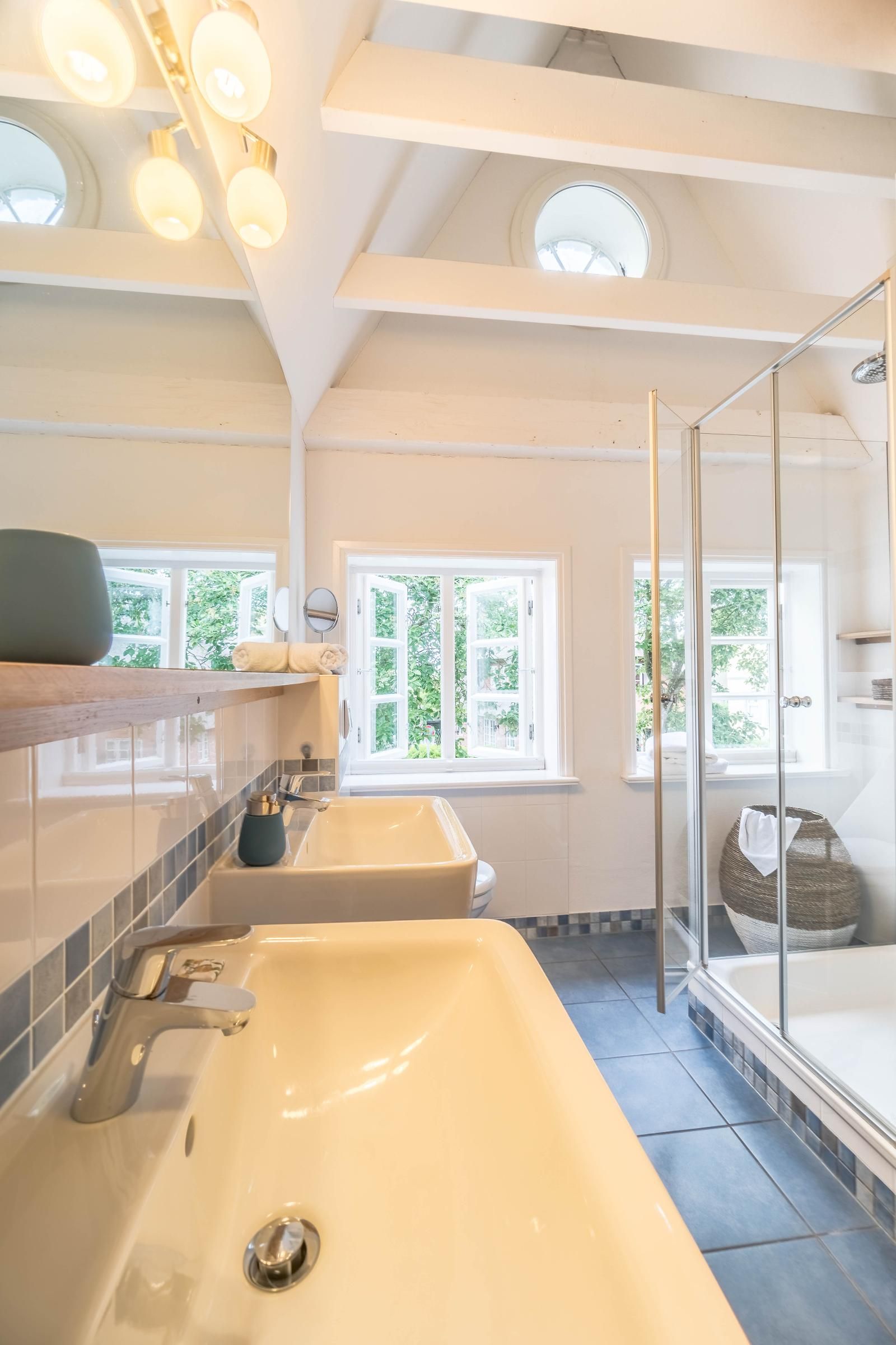Die Wohnung 2 „Kleine Pause“ erstreckt sich über die komplette rechte Haushälfte und über zwei Etagen. Auch hier befindet sich im Erdgeschoss der großzügige, helle Wohnbereich mit der offenen Küche. Die vielen Fenster lassen sehr viel Licht in die Wohnung und vom Wohnbereich aus kommen Sie auch direkt in den schönen Garten. Ebenfalls ist im Erdgeschoss noch ein Gäste-WC vorhanden. Über die offene Holztreppe erreichen Sie das Obergeschoss mit den beiden Schlafzimmern und dem großen Badezimmer mit Dusche.