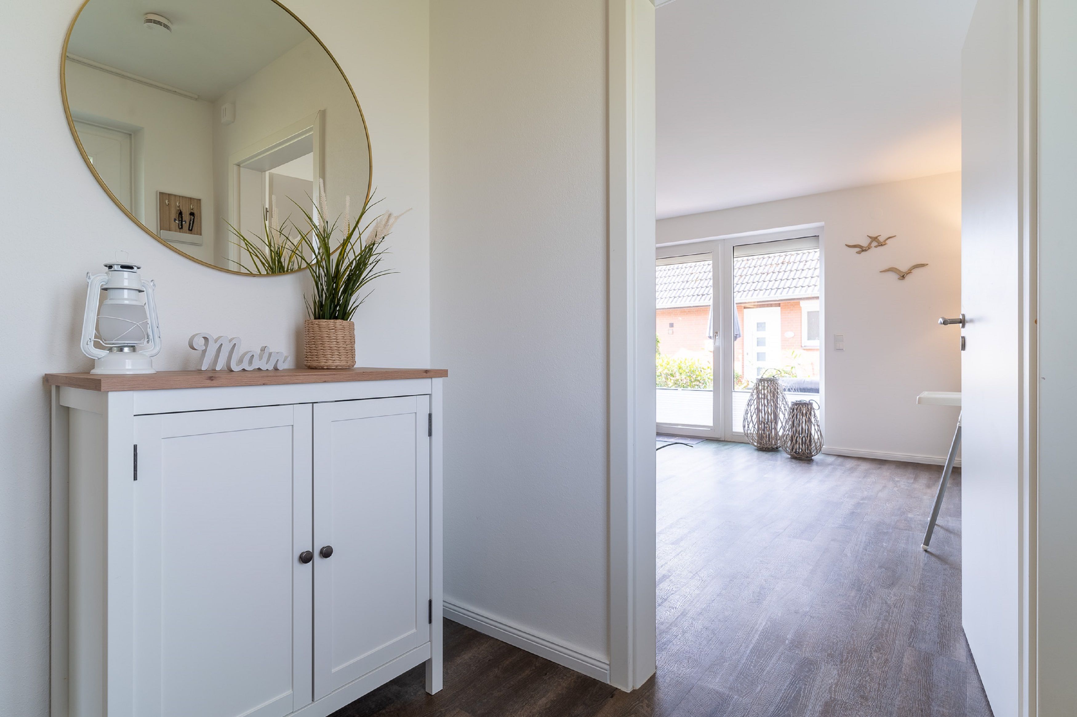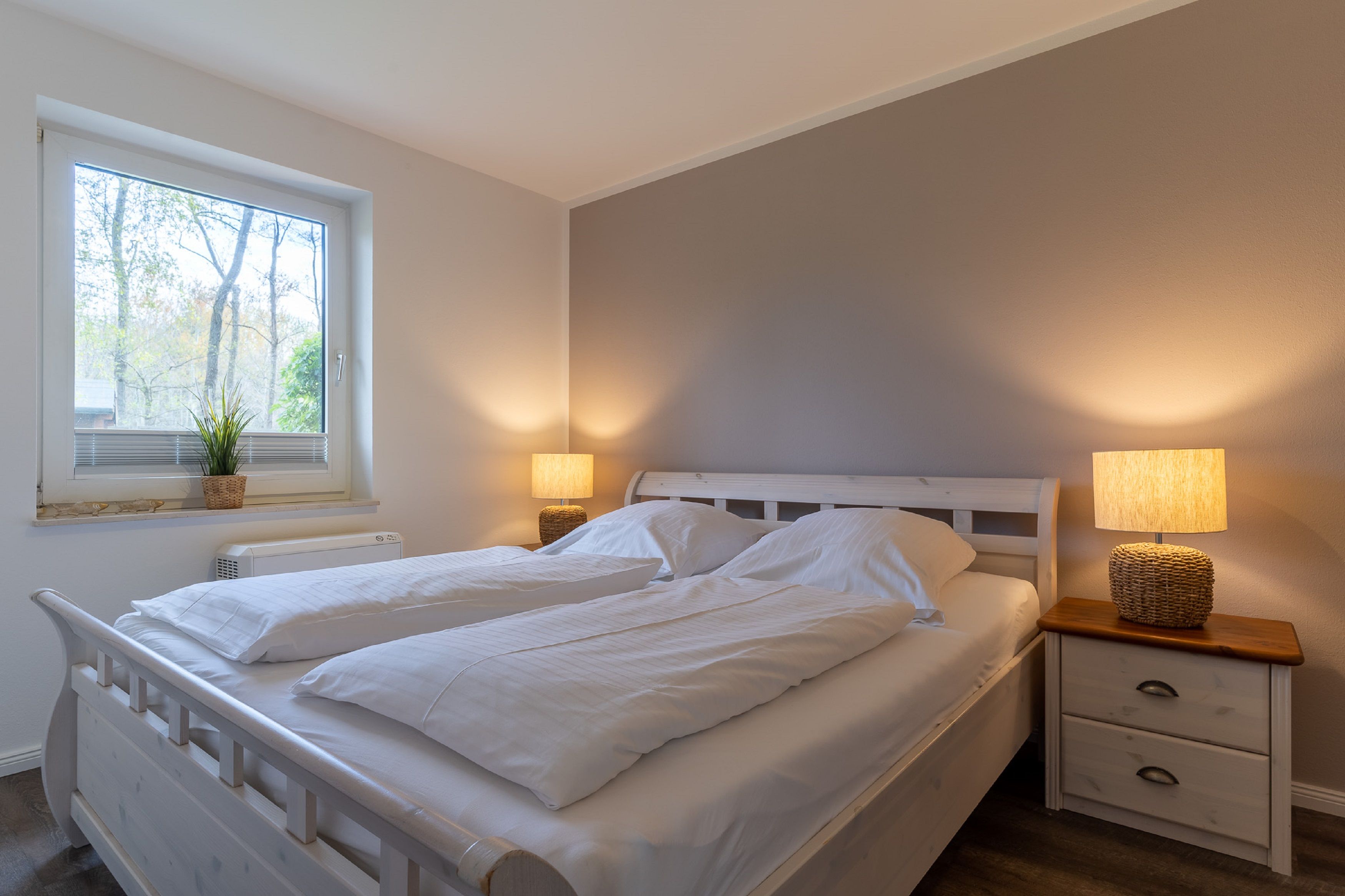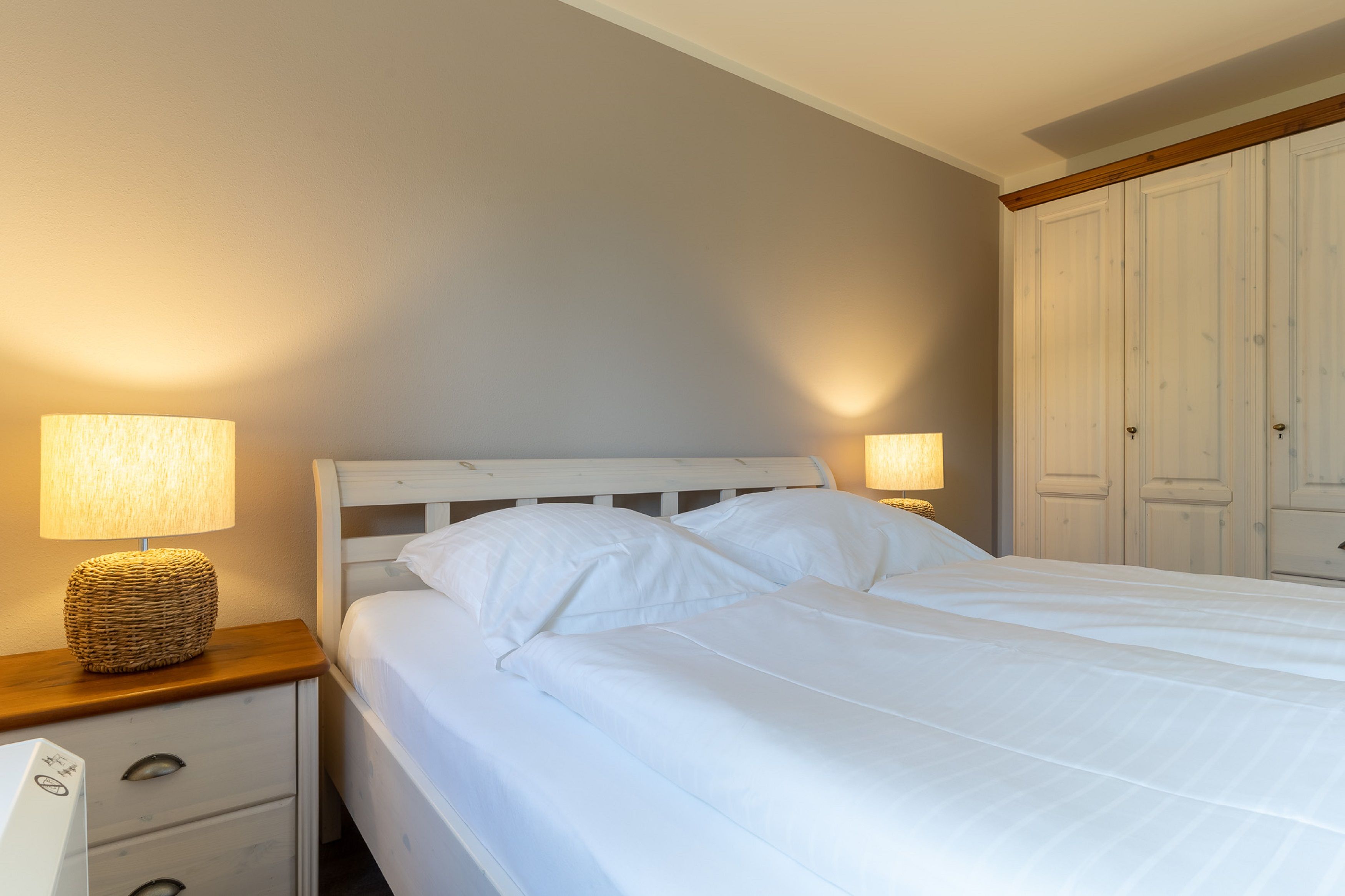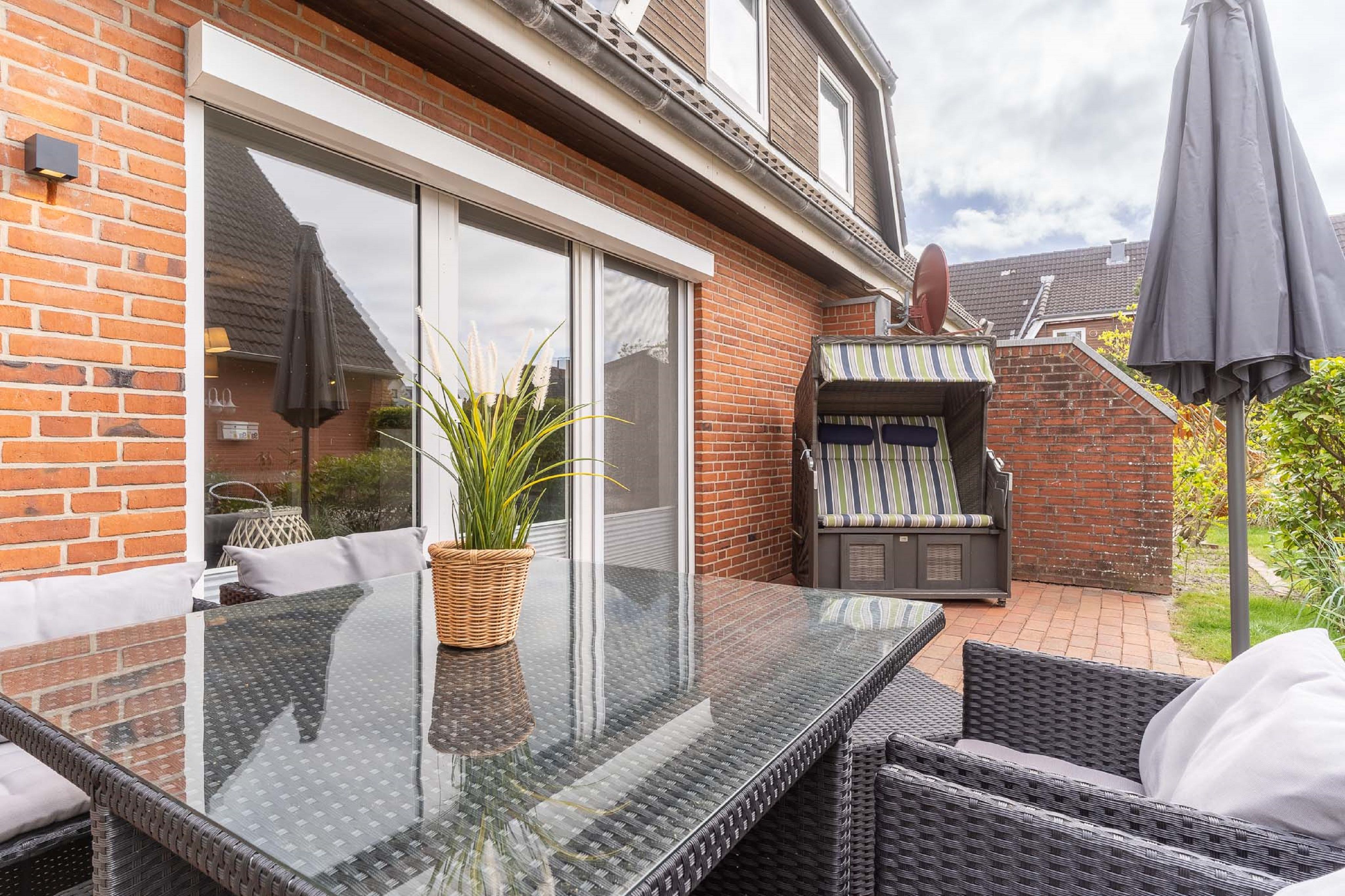 Das Schlafzimmer verfügt über ein Doppelbett, das Badezimmer über eine ebenerdige Dusche und WC. Ein Flur sowie eine Terrasse mit Gartenmöbeln und Strandkorb (April - Oktober) komplettieren die Wohnung.