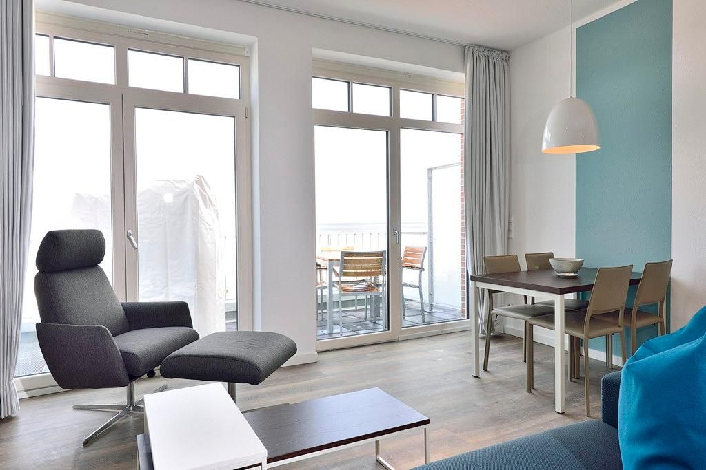 Nach einem erholsamen Urlaubstag lässt sich auf dem nordseitig gelegenen Balkon mit Meerblick herrlich entspannen. Neben Gartenmöbeln für 4 Personen steht euch hier auch ein eigener Strandkorb zur Verfügung.