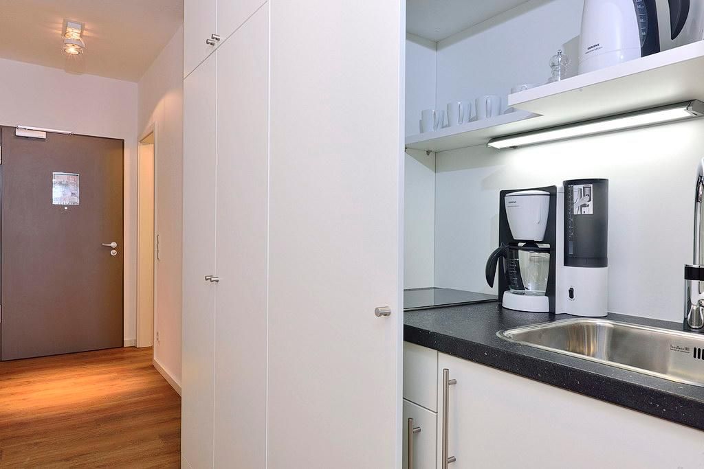 Das barrierearme Apartment ist mit einer kleinen, aber feinen Pantryküche ausgestattet. Diese verfügt u. a. über ein Gefrierfach, eine Kaffeemaschine, einen Toaster und einen Wasserkocher. Im stilvollen Badezimmer befinden sich eine große, begehbare Dusche sowie ein Waschtisch mit Föhn und Kosmetikspiegel.
