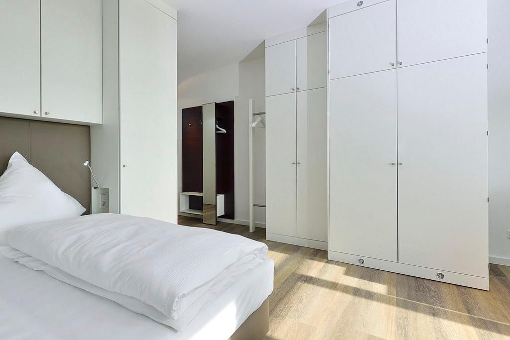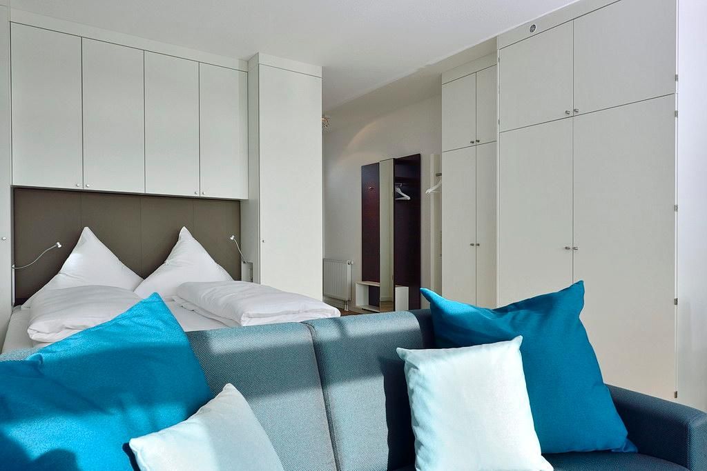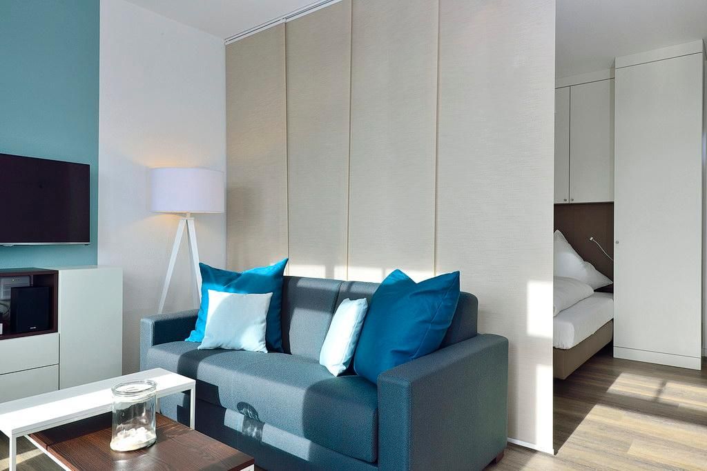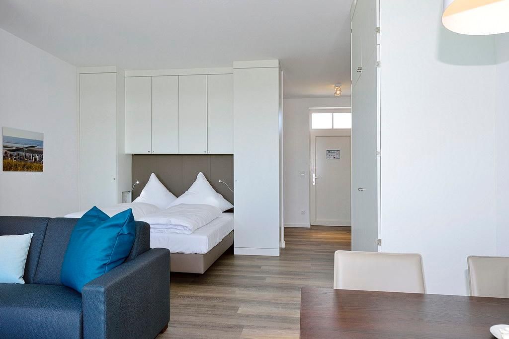 Das moderne Apartment verfügt über ein Wohn-/Schlafzimmer mit Doppelbett und Einzelschlafcouch, einen großen Flatscreen-TV und eine HiFi-Anlage. Der Schlafbereich mit dem Doppelbett lässt sich durch ein Schiebeelement vom Wohnbereich separieren. Ein Kinderbett kann gegen Entgelt im Wohnbereich aufgestellt werden.