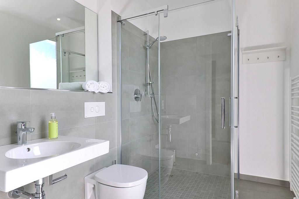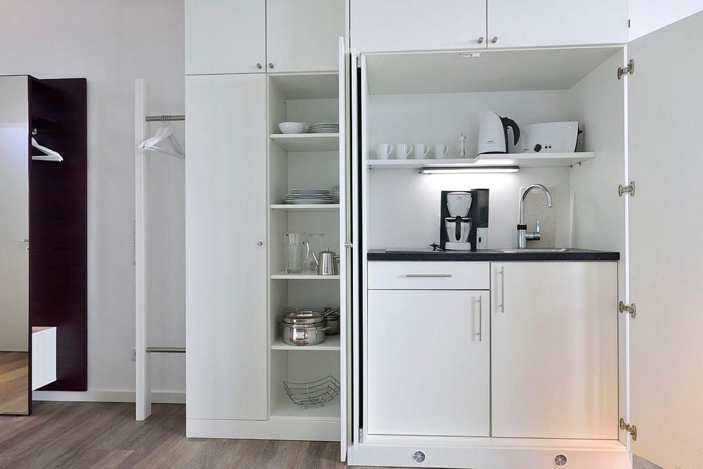 Das barrierearme Apartment ist mit einer kleinen, aber feinen Pantryküche ausgestattet. Diese verfügt u. a. über ein Gefrierfach, eine Kaffeemaschine, einen Toaster und einen Wasserkocher. Im stilvollen Badezimmer befinden sich eine große, begehbare Dusche sowie ein Waschtisch mit Föhn und Kosmetikspiegel.