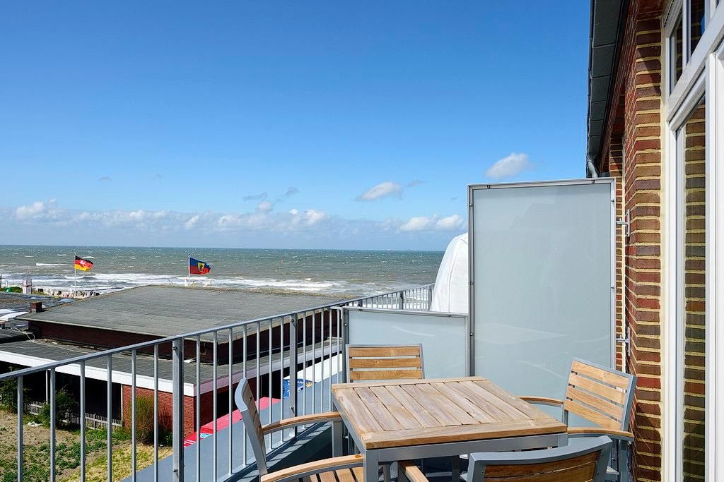 Auf dem sonnigen Balkon entspannt ihr im eigenen Strandkorb und genießt den Blick auf das Meer. Hier stehen euch auch Gartenmöbel für 4 Personen zur Verfügung.