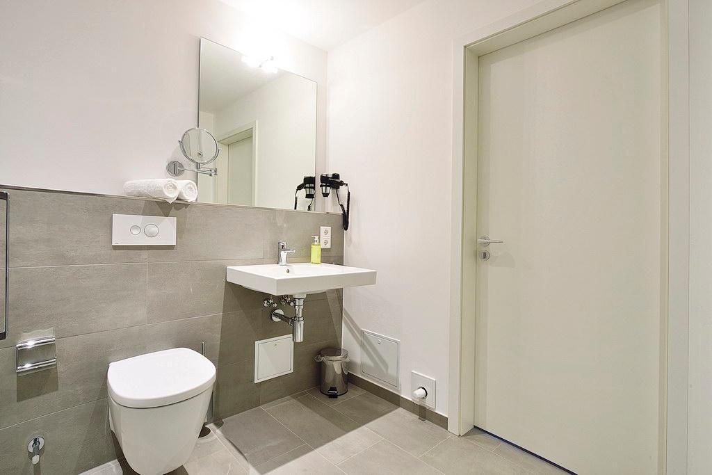 Das barrierearme Apartment ist mit einer kleinen, aber feinen Pantryküche ausgestattet. Diese verfügt u. a. über ein Gefrierfach, eine Kaffeemaschine, einen Toaster und einen Wasserkocher. Im stilvollen und großzügigen Badezimmer befinden sich eine große, begehbare Dusche sowie ein Waschtisch mit Föhn und Kosmetikspiegel.