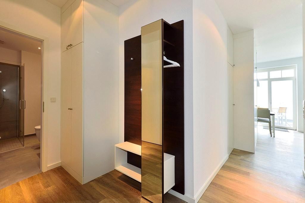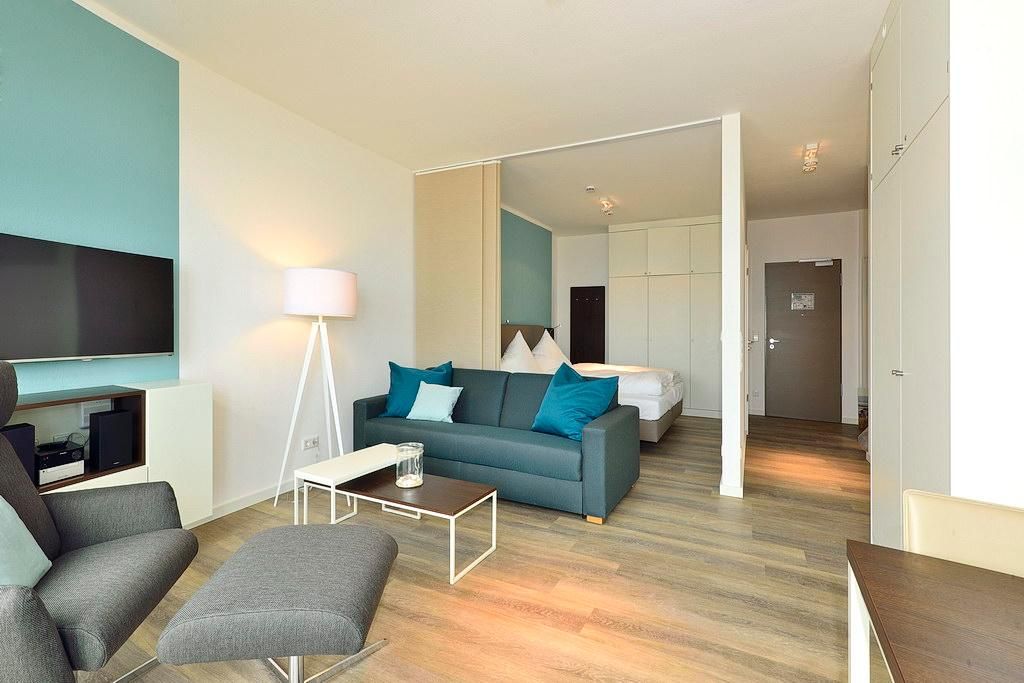 Das barrierearme Apartment ist mit einer kleinen, aber feinen Pantryküche ausgestattet. Diese bietet euch u. a. ein Gefrierfach, eine Kaffeemaschine, einen Toaster und einen Wasserkocher. Im stilvollen Badezimmer befinden sich eine große, begehbare Dusche sowie ein Waschtisch mit Föhn und Kosmetikspiegel. Das moderne Apartment verfügt über ein Wohn-/Schlafzimmer mit Doppelschlafcouch und Doppelbett. Der Schlafbereich mit dem Doppelbett lässt sich durch ein Schiebeelement vom Wohnbereich separieren. Im Wohnbereich stehen euch ein großer Flatscreen-TV und eine HiFi-Anlage zur Verfügung. Nach einem erlebnisreichen Urlaubstag lässt sich auf dem großen Balkon mit Meerblick herrlich entspannen. Hier stehen euch neben einem Strandkorb auch Gartenmöbel für 4 Personen zur Verfügung.