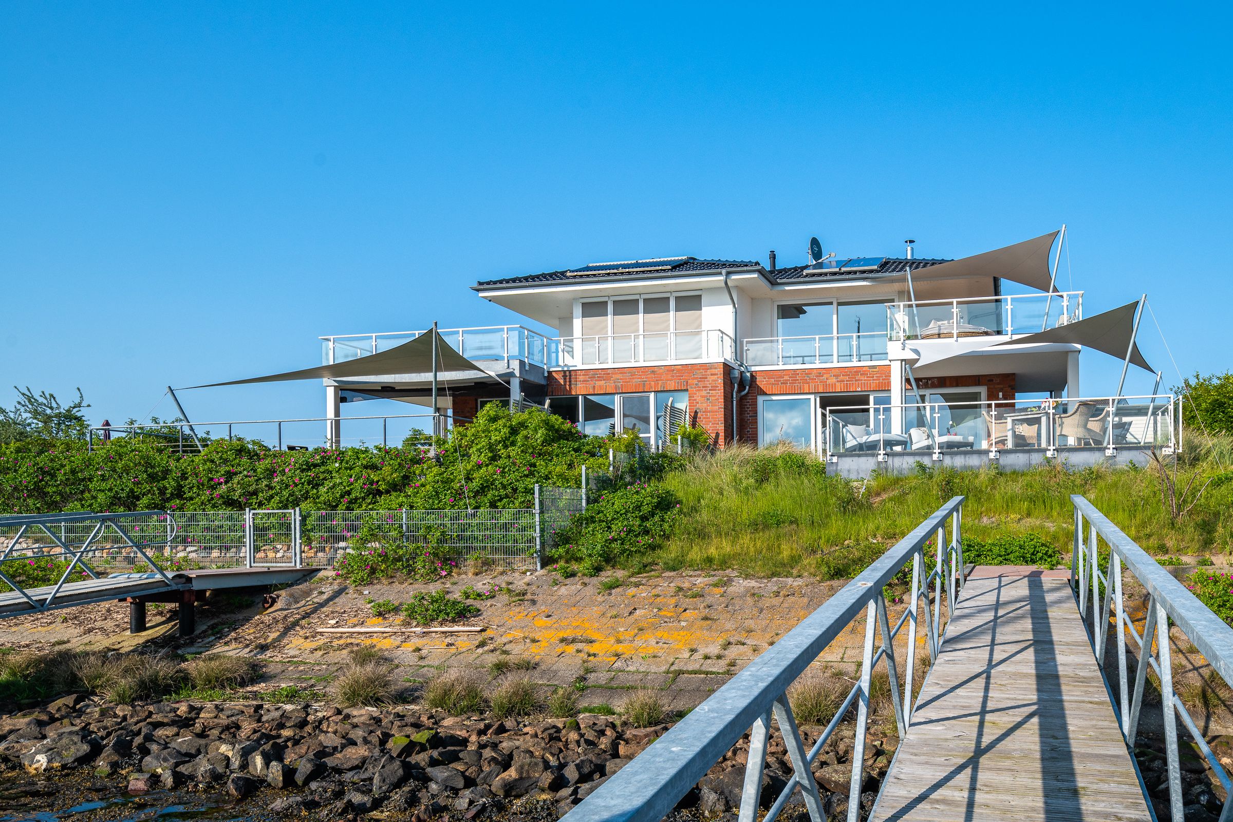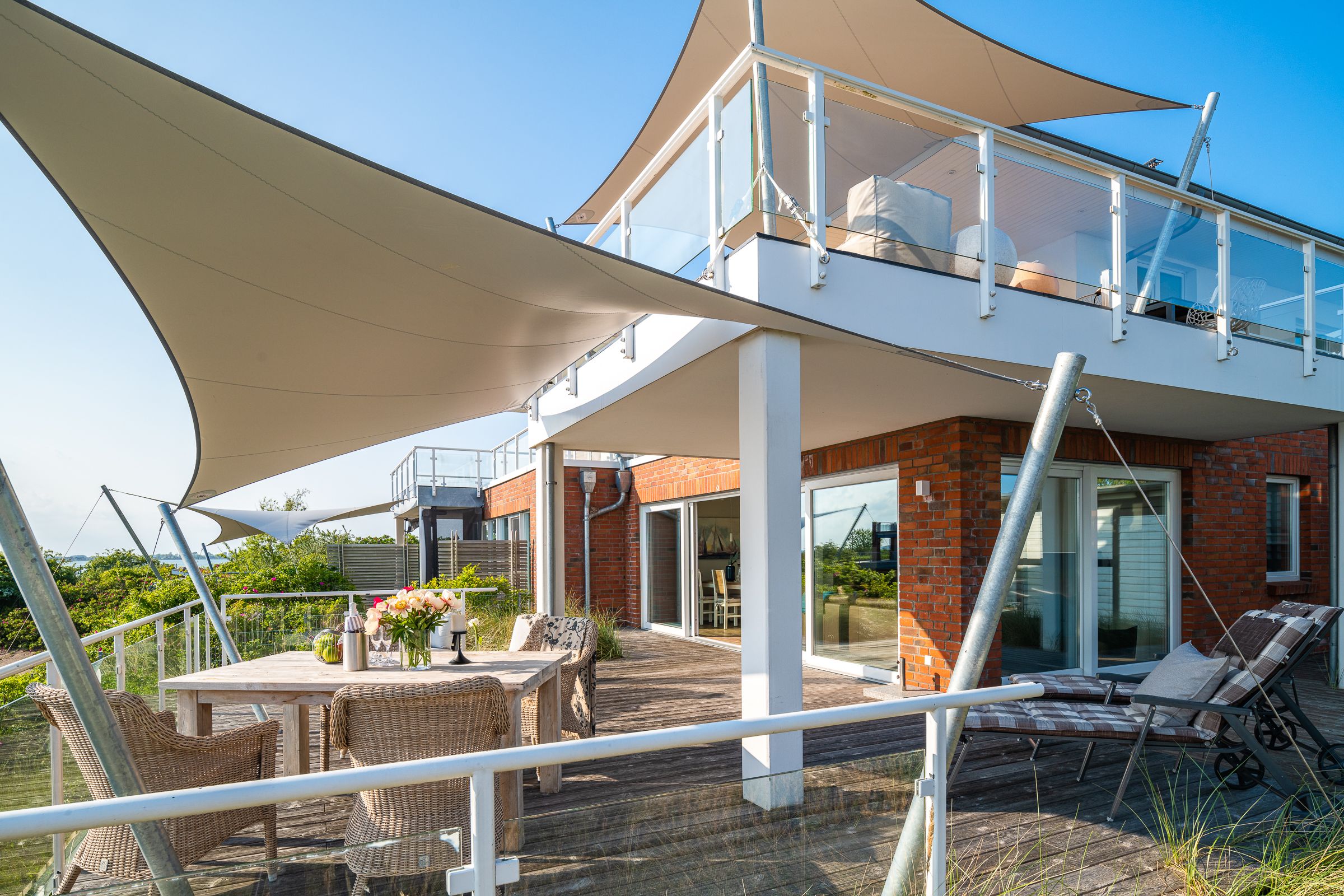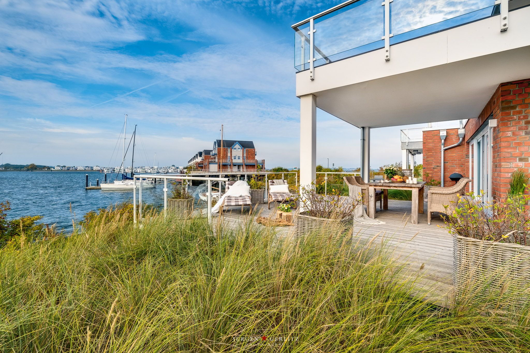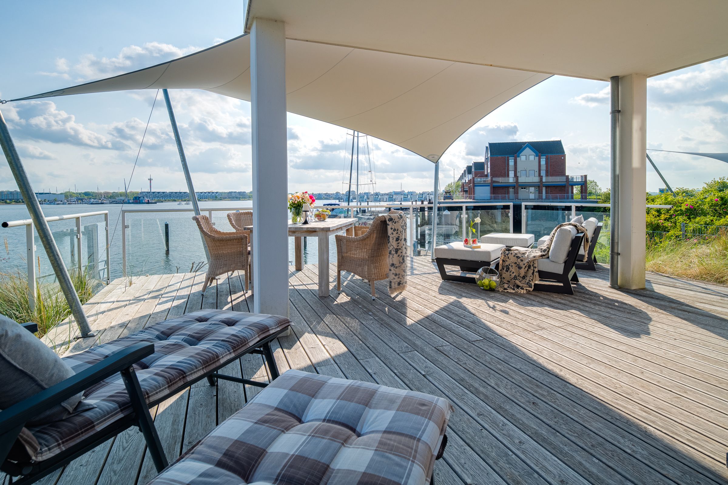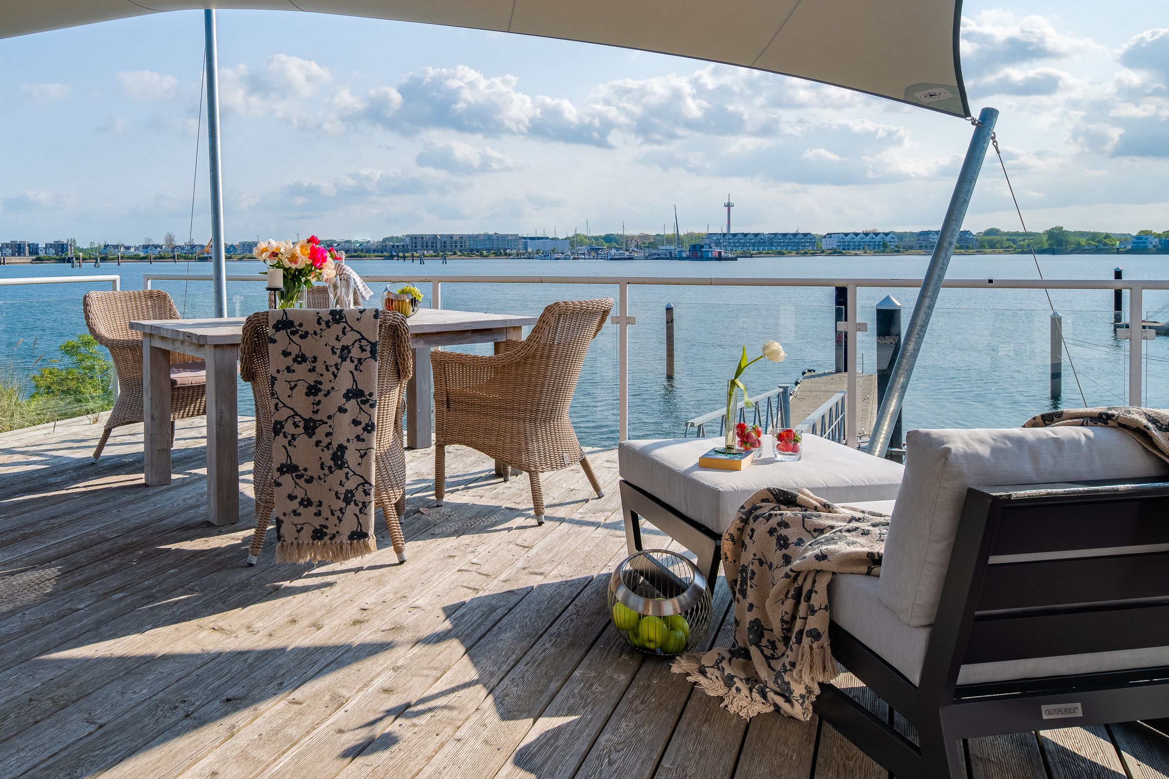 Die großzügige, teilweise überdachte Terrasse in Südwestausrichtung bietet einen idealen Rahmen für Mahlzeiten bei Sonnenaufgang und Sonnenuntergang. Die Terrasse ermöglicht vielfältige Aktivitäten, wie Sonnenbaden, Kaffeetrinken oder Grillen, und bietet stets eine schöne Aussicht auf den Yachthafen.