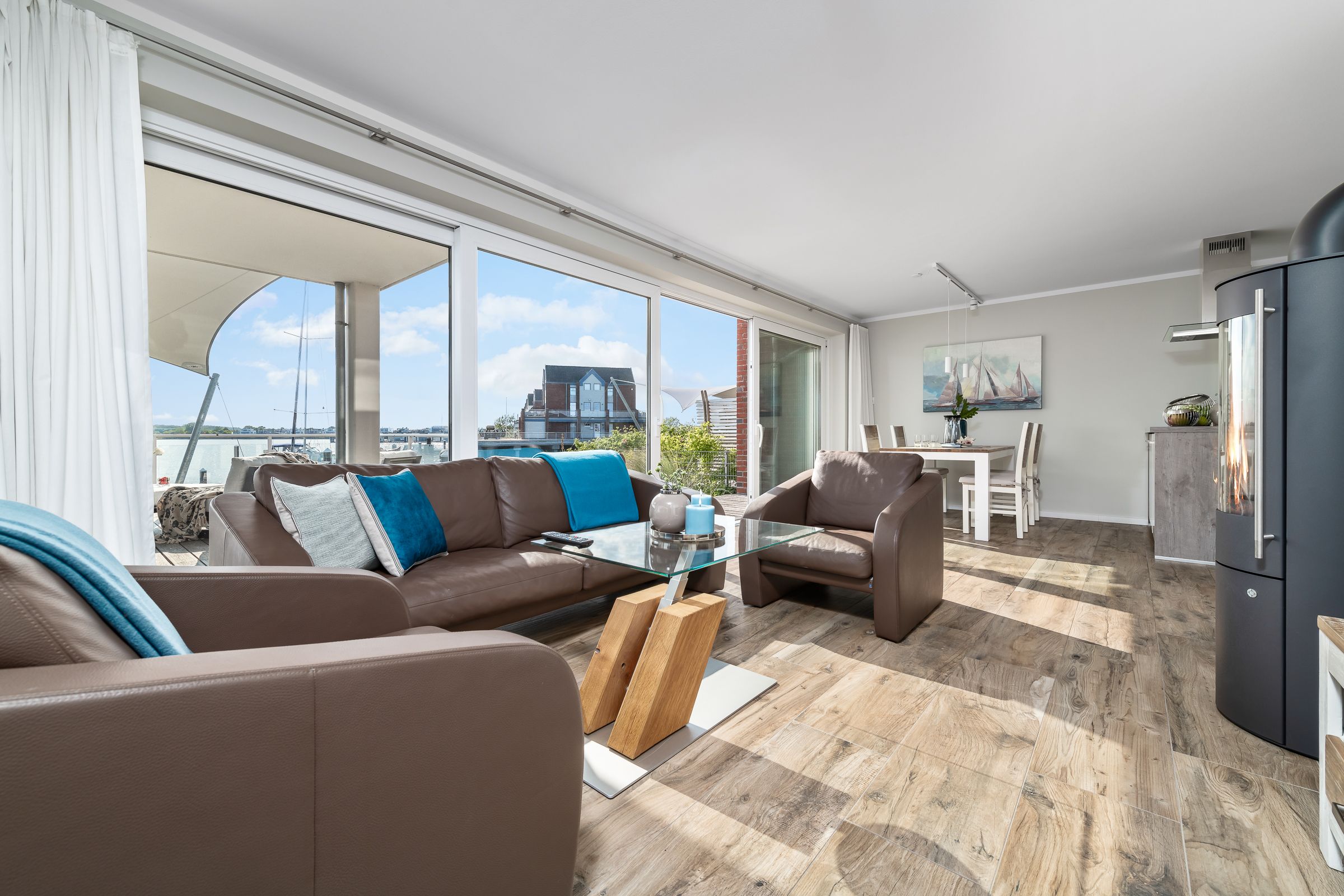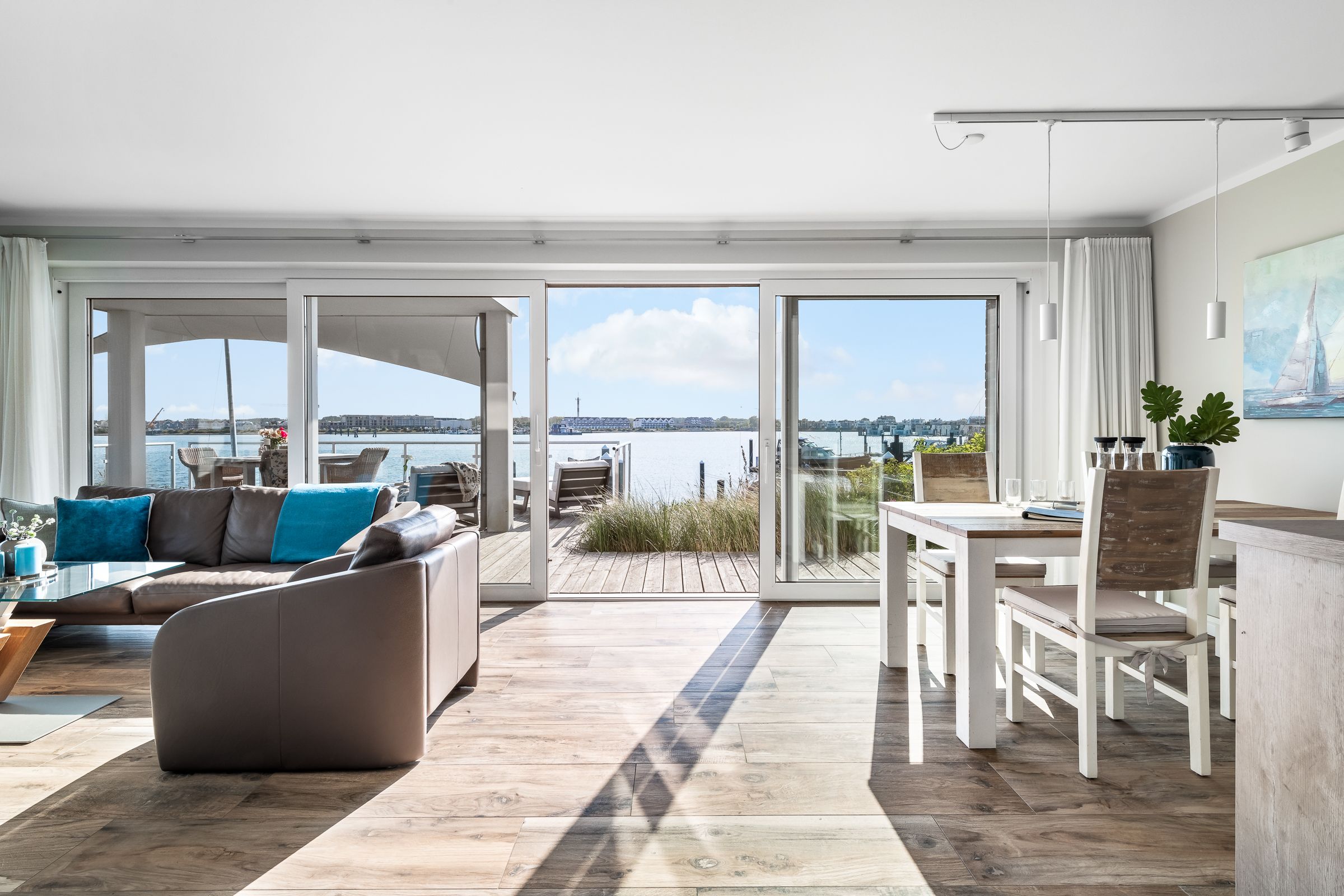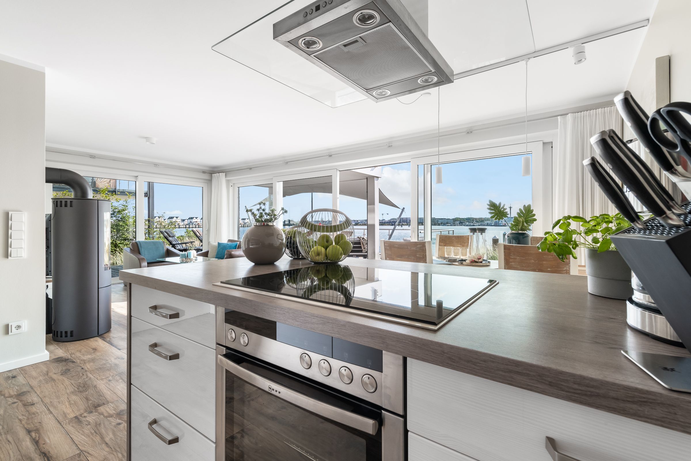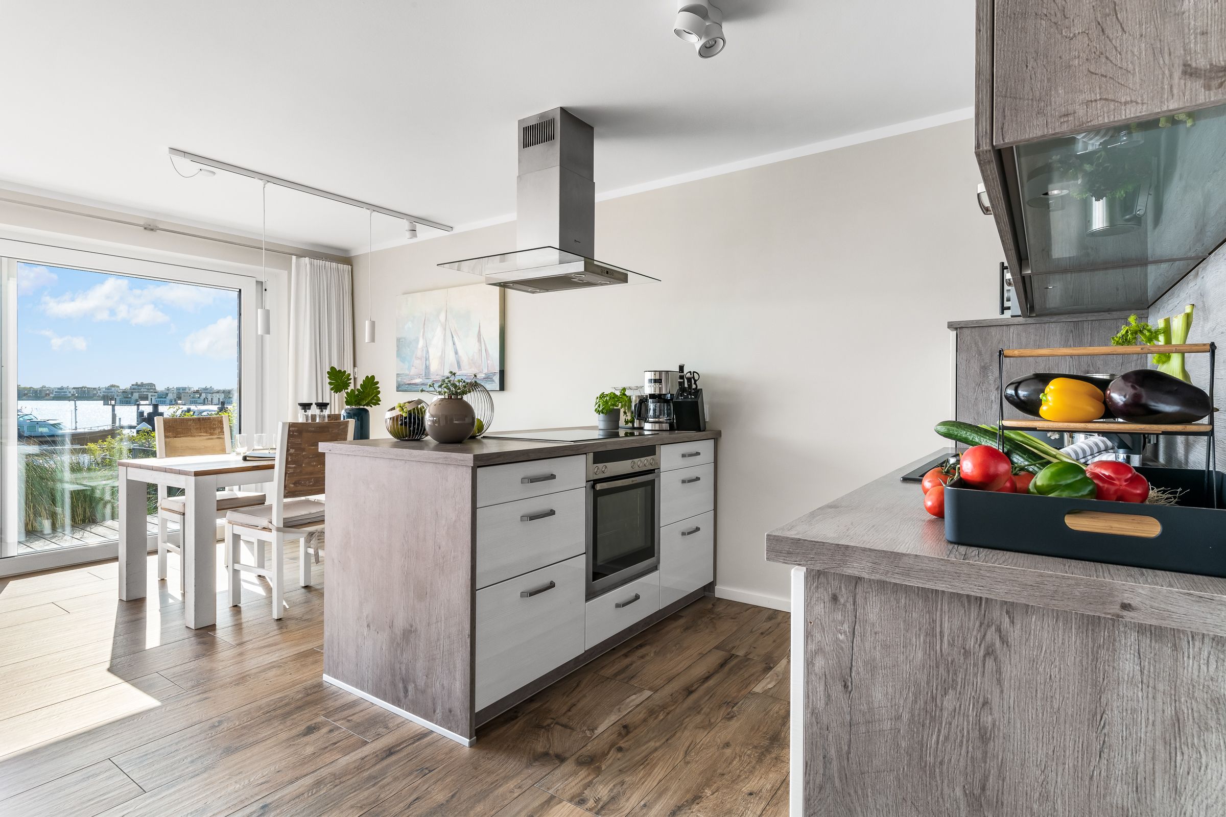 Der geräumige Flur führt in den hellen Wohn- und Essbereich mit einer komfortablen Lounge-Ecke und bodentiefen Panoramafenstern, die auch beim Kochen, Essen und Fernsehen den Blick auf das Wasser ermöglichen. Angrenzend befindet sich die offene Küche mit Kochinsel. Die Ausstattung umfasst eine Mikrowelle, einen Toaster, einen Wasserkocher, verschiedene Gewürze und Grillbesteck. - Maritime Dekorationselemente verleihen dem Apartment eine angenehme Atmosphäre.