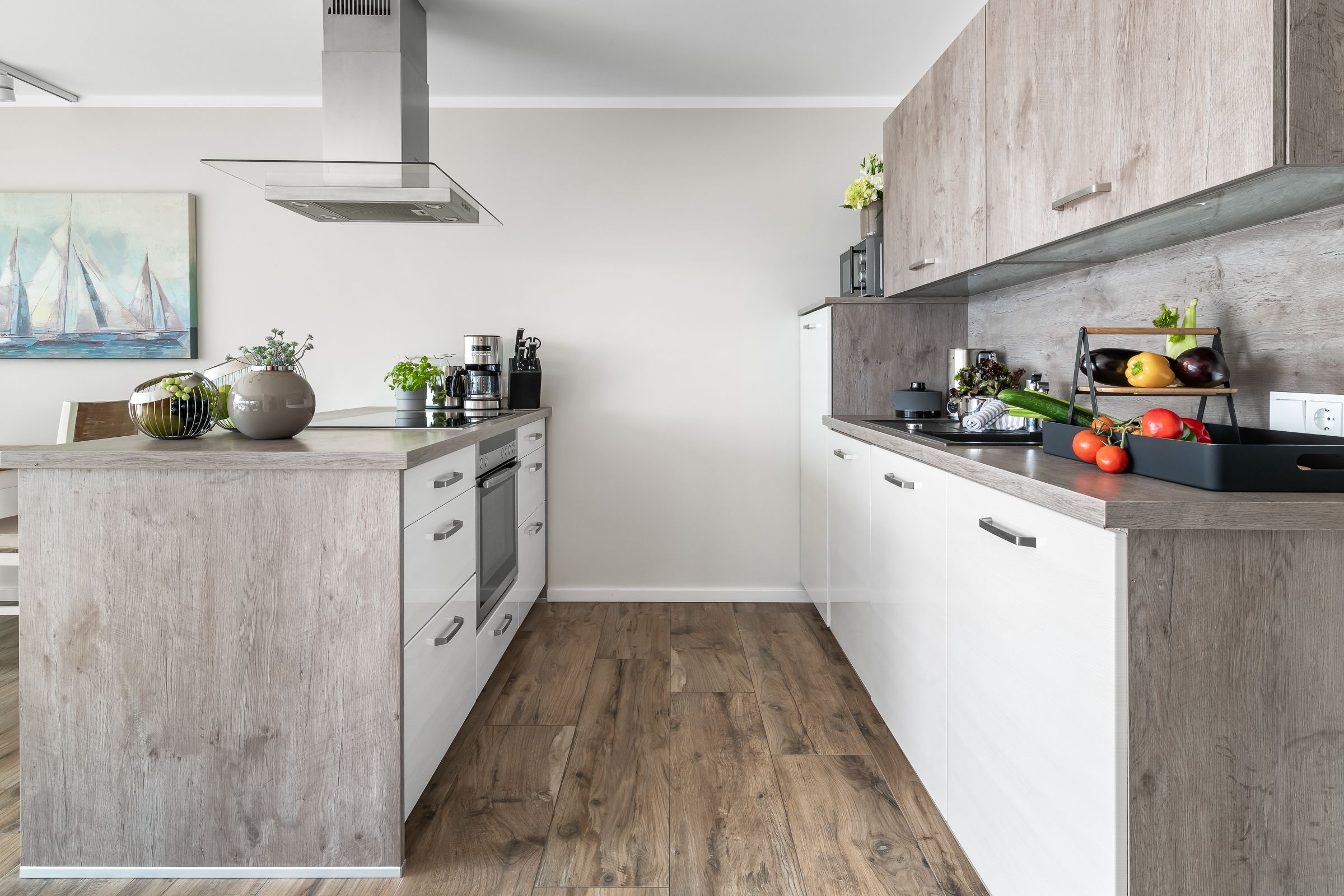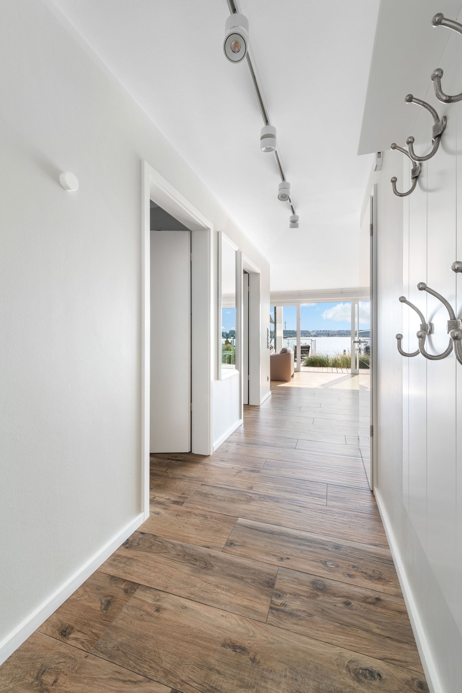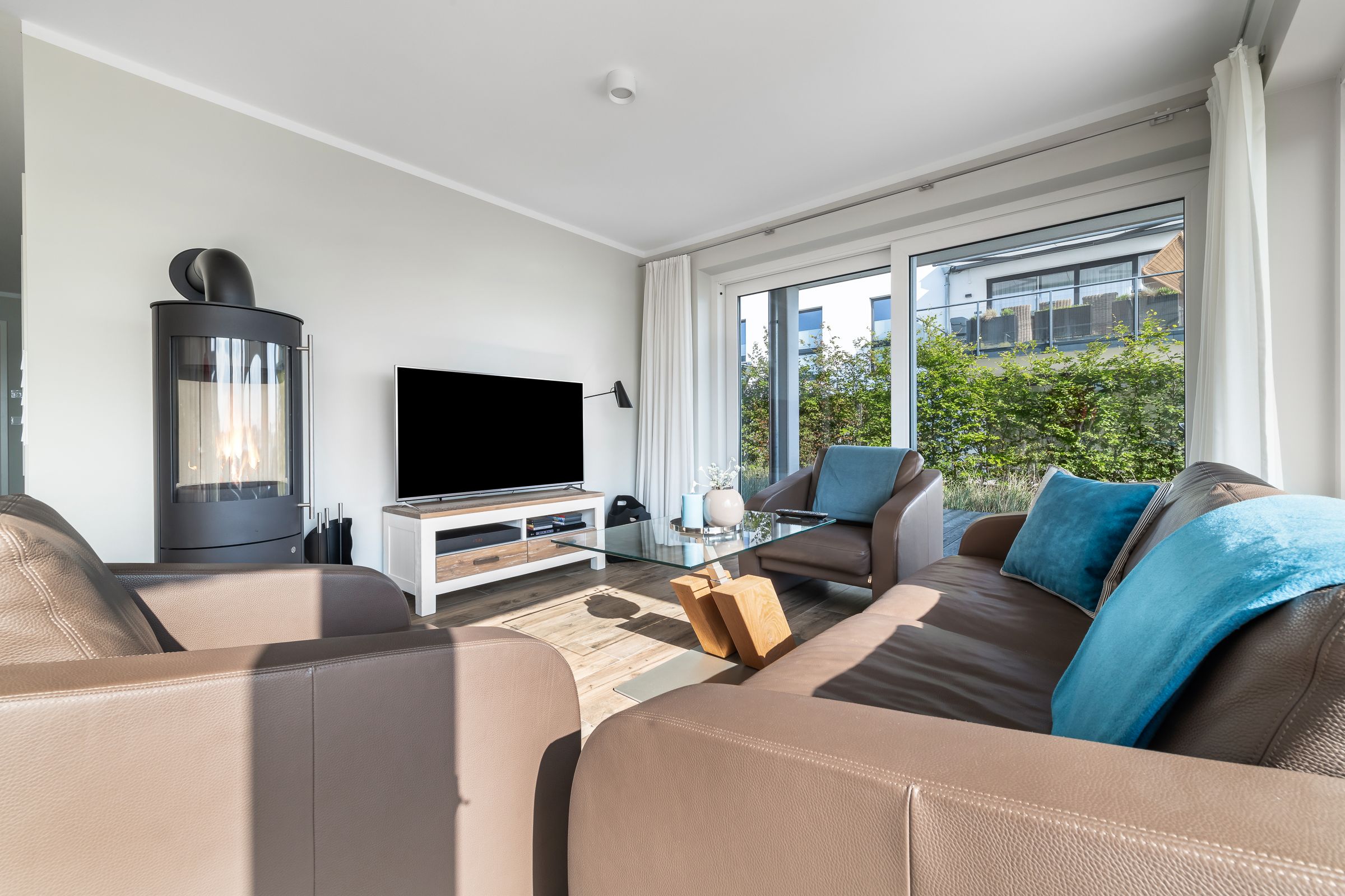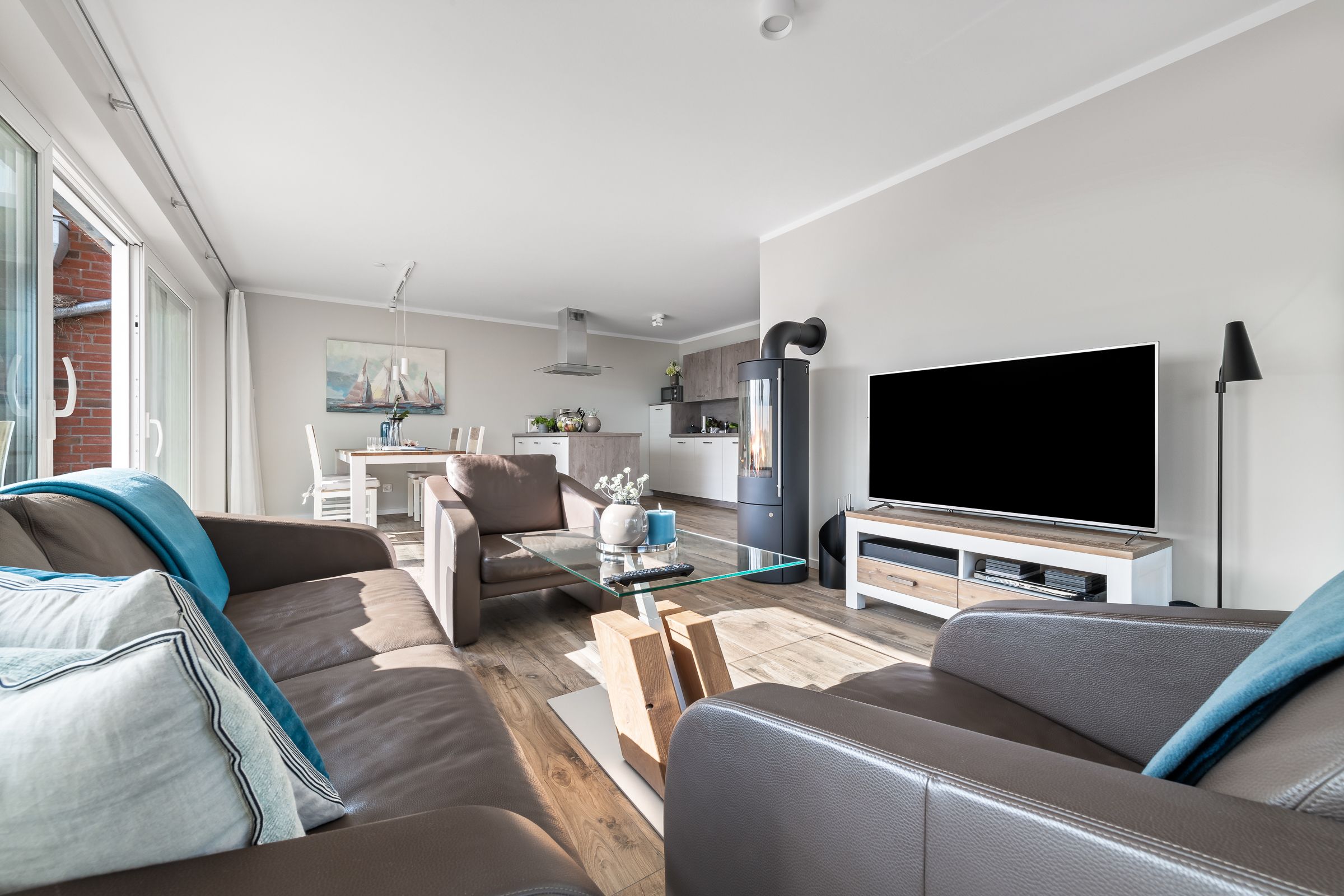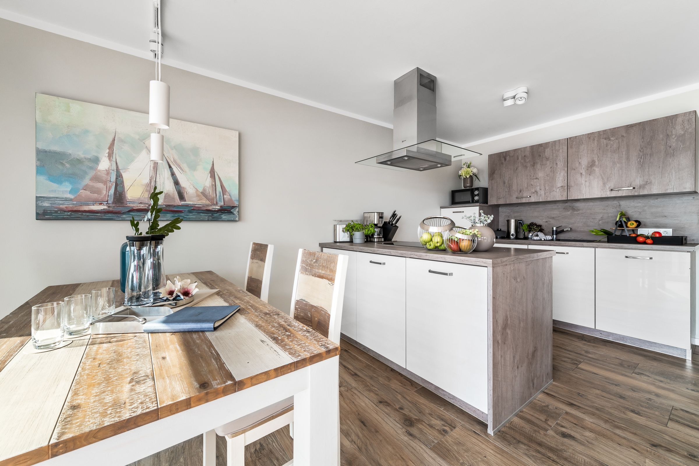 Der geräumige Flur führt in den hellen Wohn- und Essbereich mit einer komfortablen Lounge-Ecke und bodentiefen Panoramafenstern, die auch beim Kochen, Essen und Fernsehen den Blick auf das Wasser ermöglichen. Angrenzend befindet sich die offene Küche mit Kochinsel. Die Ausstattung umfasst eine Mikrowelle, einen Toaster, einen Wasserkocher, verschiedene Gewürze und Grillbesteck. - Maritime Dekorationselemente verleihen dem Apartment eine angenehme Atmosphäre.