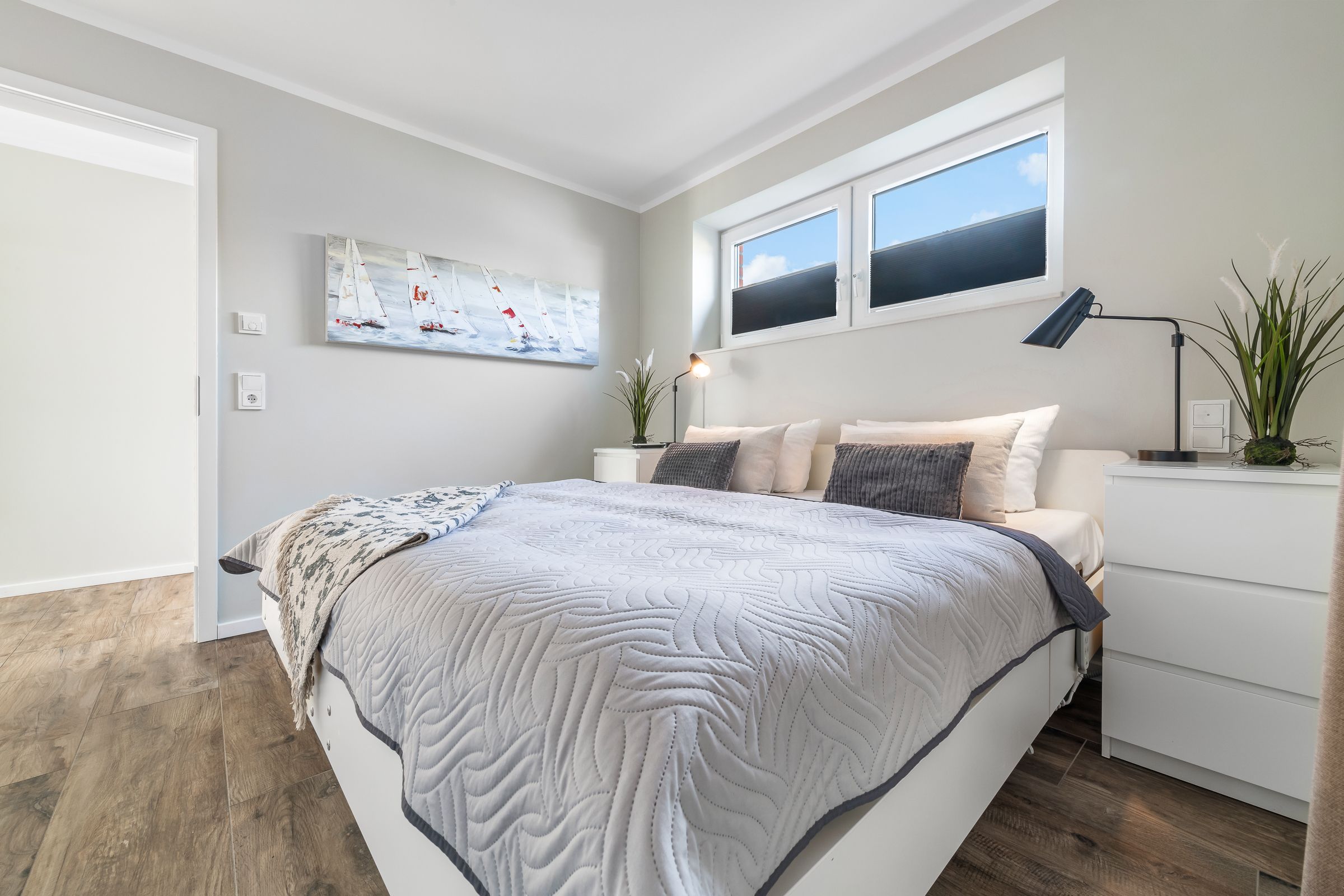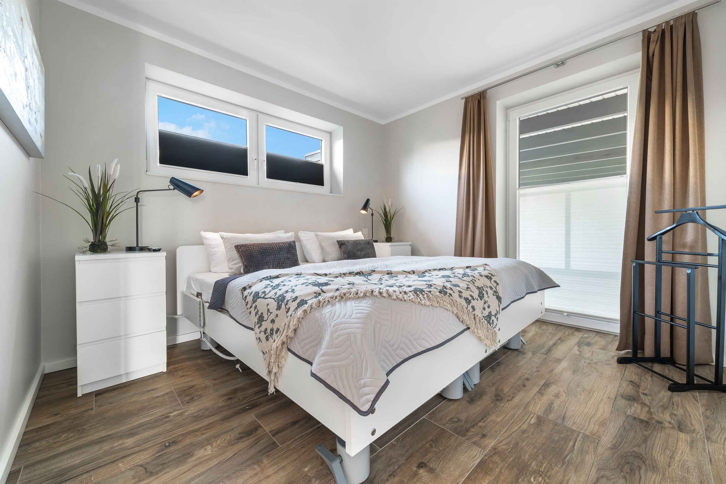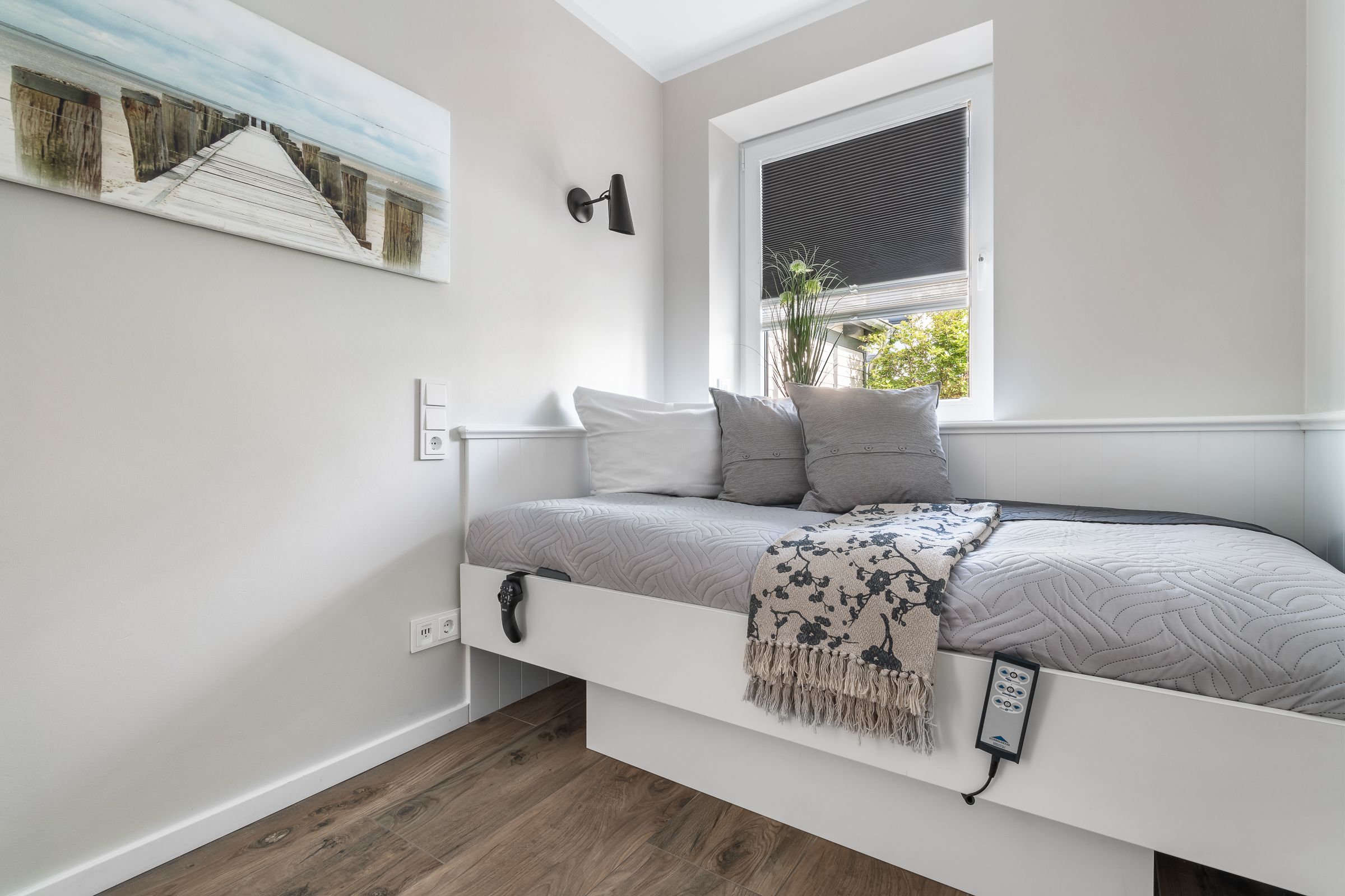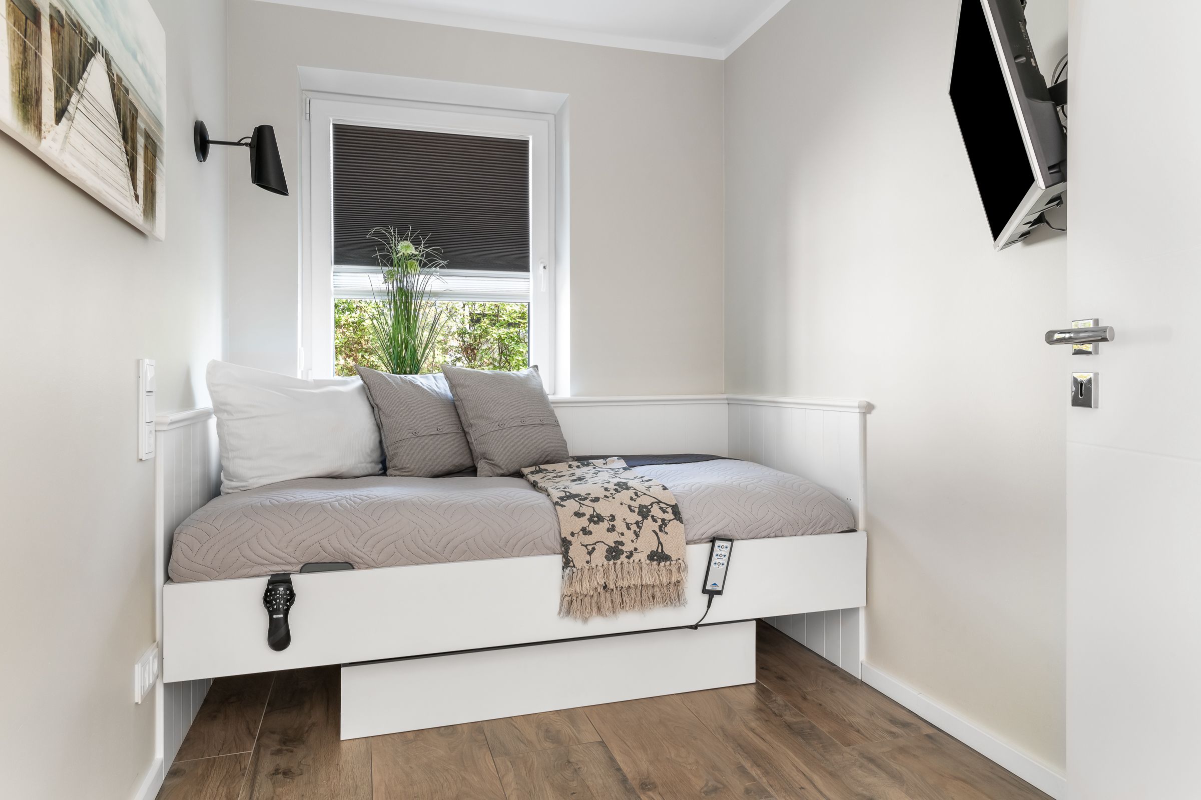 Neben einem Hauptschlafzimmer für zwei Personen mit einem höhenverstellbaren Pflegebett (1,80 x 2,00 m x 65 cm) steht ein weiteres Schlafzimmer für eine dritte Person zur Verfügung. Links neben dem Doppelbett sind 60 cm, rechts 75 cm und zur Schrankseite 85 cm Platz. Das Einzelbett ist elektrisch am Kopf- und Fußteil verstellbar sowie höhenverstellbar. Es ist 68 cm hoch und ca. 94 cm breit. Die Innentüren haben eine Breite von 94 cm.