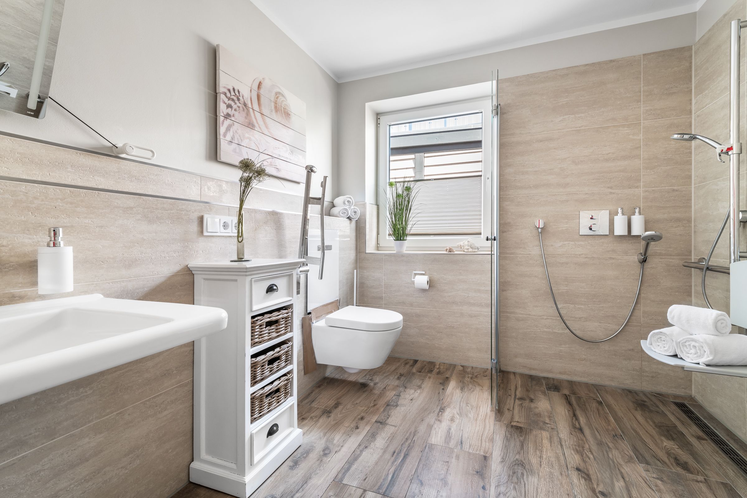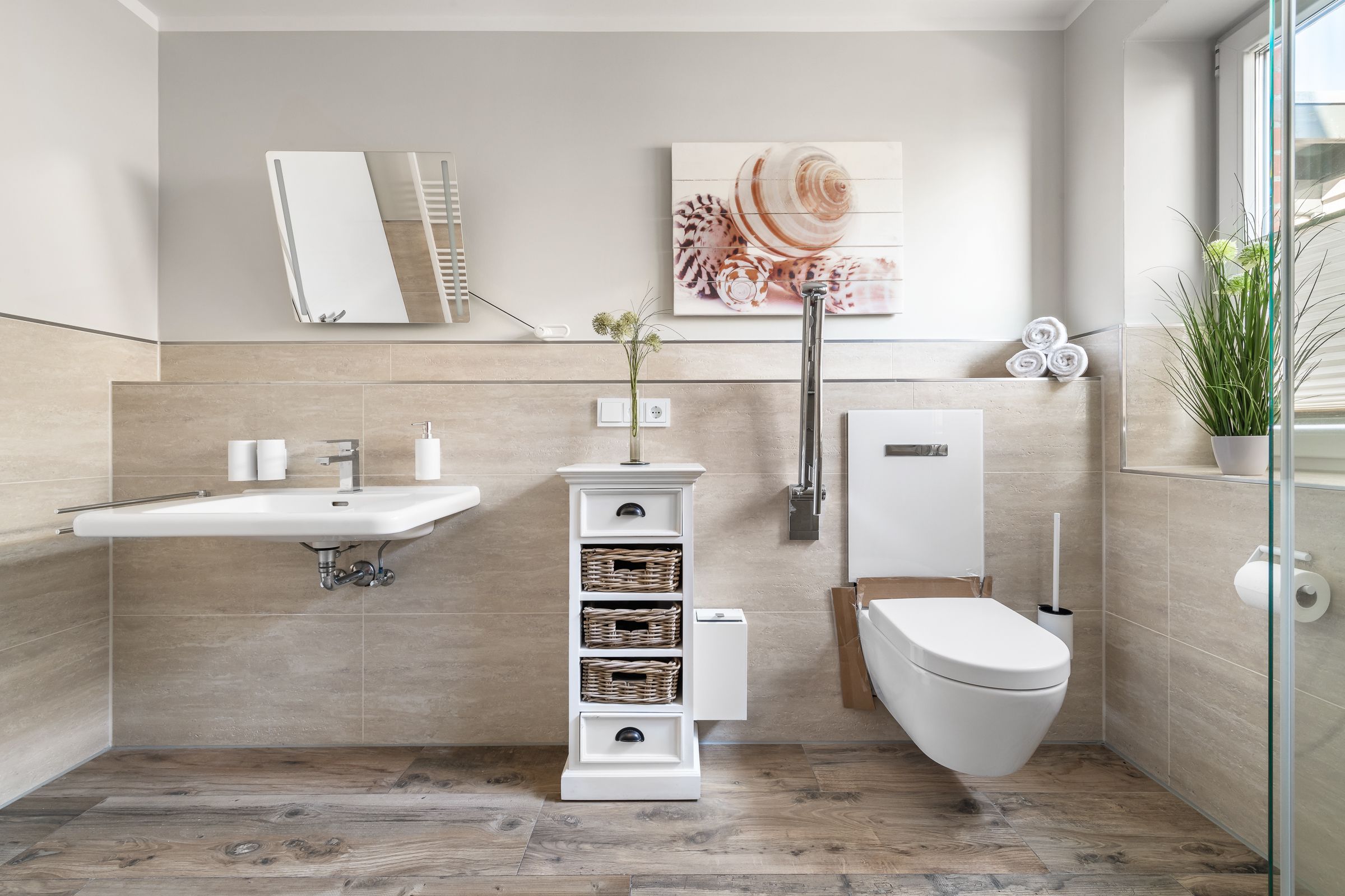Die Erdgeschosswohnung ist barrierearm gestaltet und verfügt über breite Türen, ein verstellbares Einzelbett, ein runterfahrbares Waschbecken, ein behindertengerechtes WC (Höhe: 50 cm) mit Aufstiegsbügel sowie eine stufenlose Dusche mit Falttüren.
