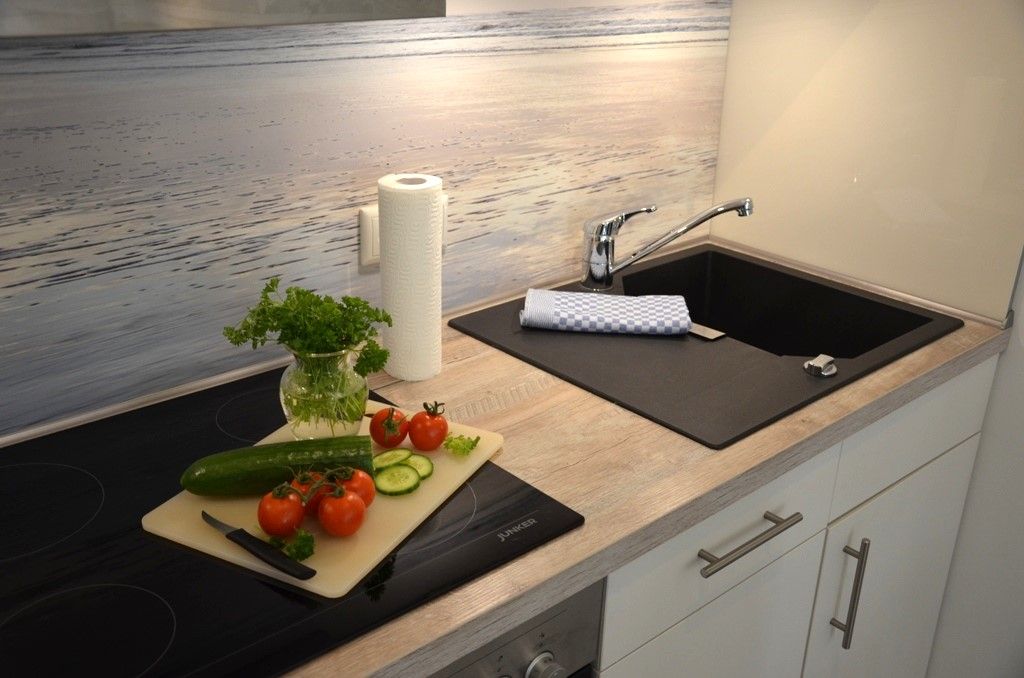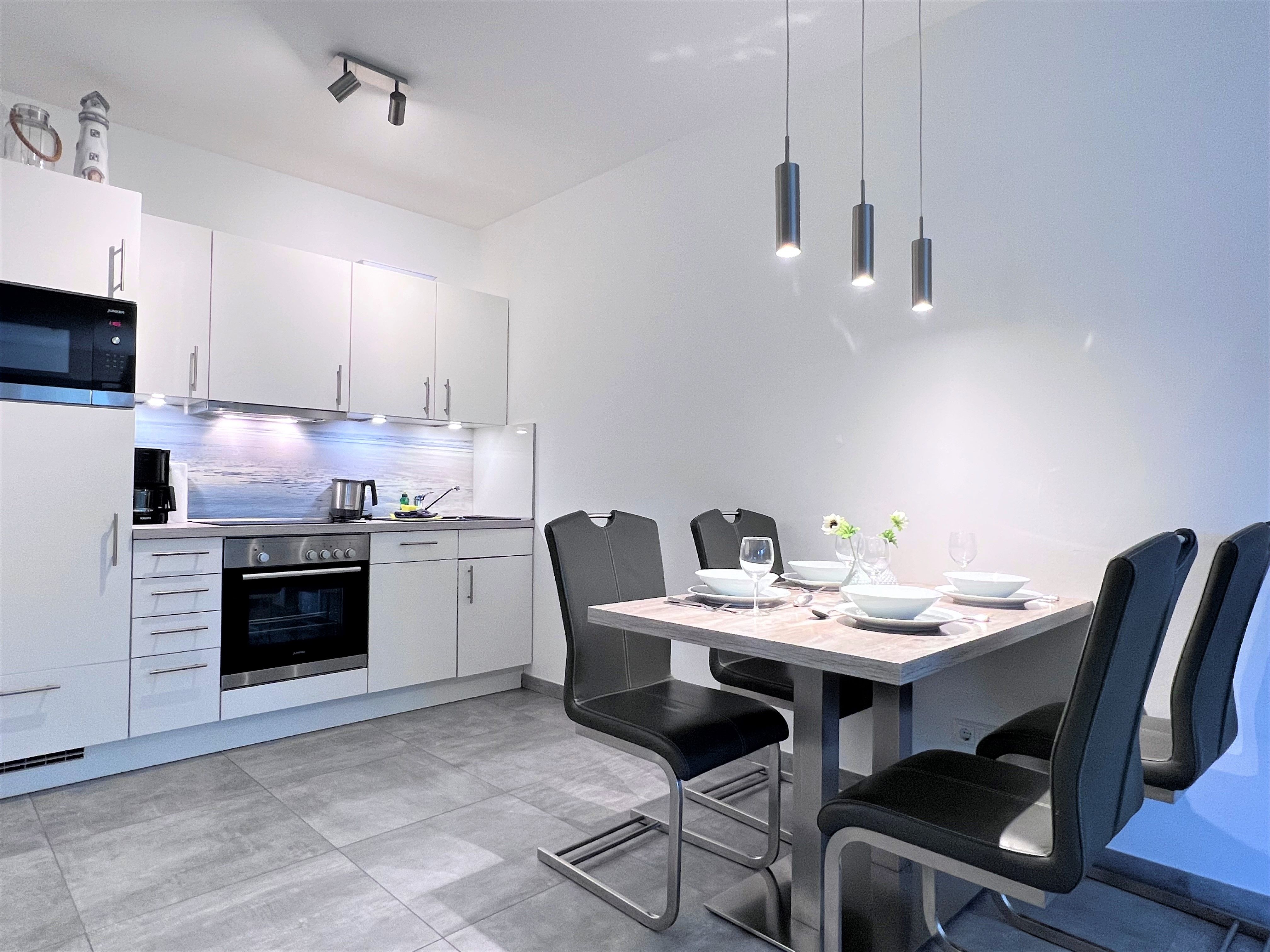 Küche und Haushalt: Einbauküche, Kühlschrank mit Gefrierfach, 4-Zonen Cerankochfeld, Backofen, Dunstabzugshaube, Geschirrspüler, Kaffeefiltermaschine, Toaster, Wasserkocher, hochwertiges Geschirr und Besteck