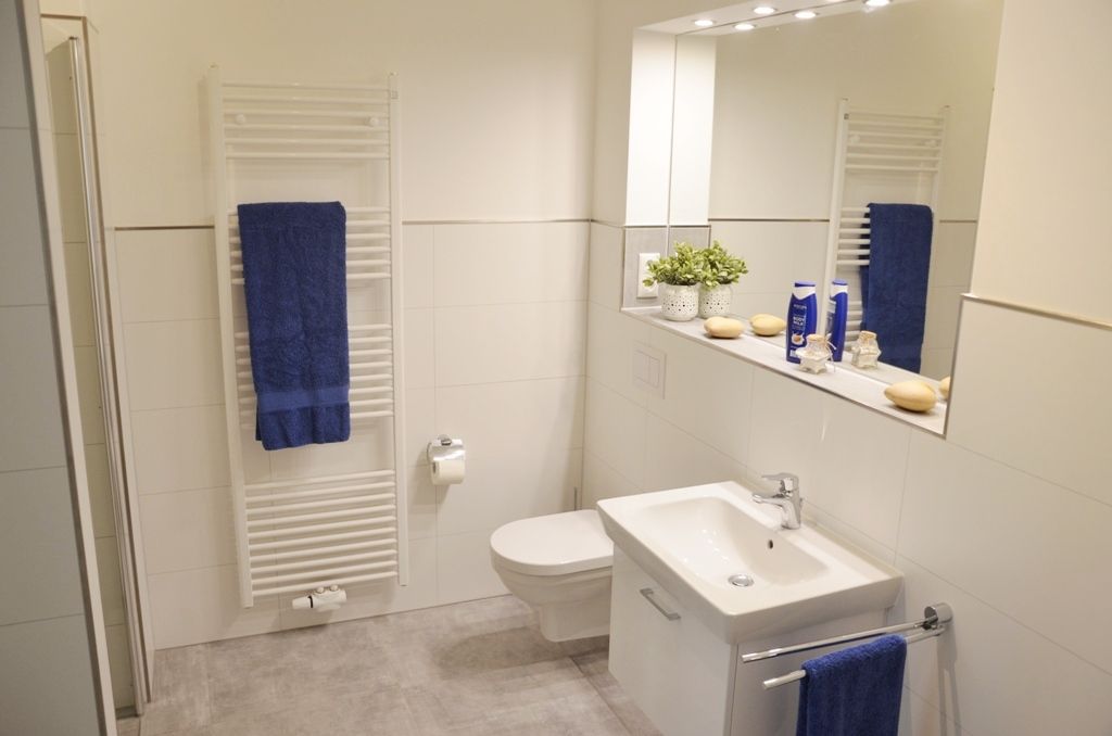 Vom Eingangsbereich rechts gehalten geht es in das schicke Duschbad mit WC. Die große, bodengleiche Dusche, eine Handtuchheizung sowie der beleuchtete Spiegel als Nische über dem Waschbecken bieten aller höchsten Komfort. Die begehbare Dusche ist auch für Gäste mit Behinderungen bestens geeignet.
