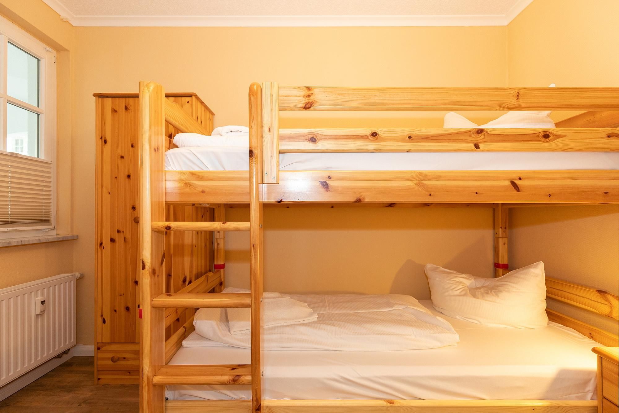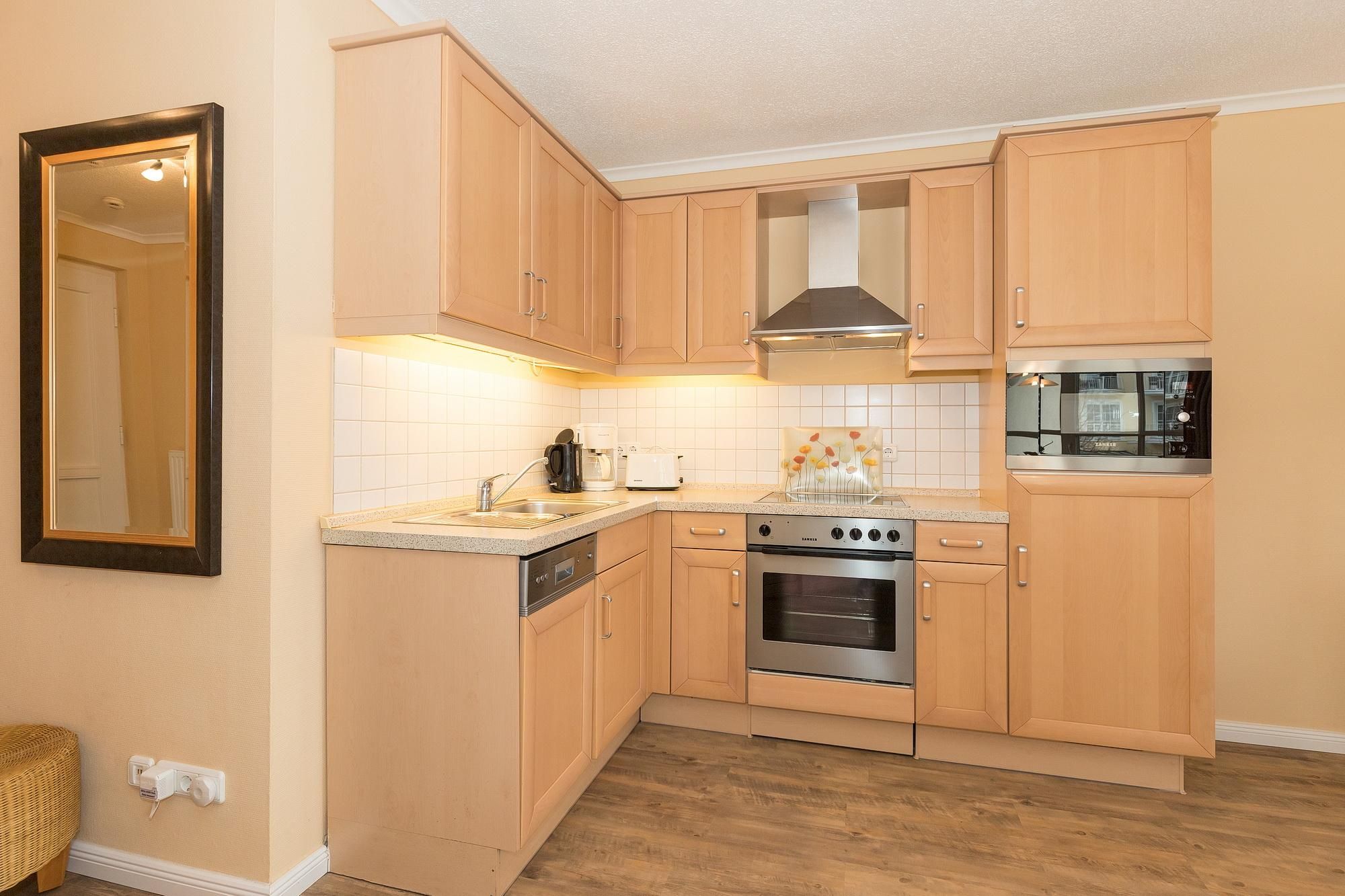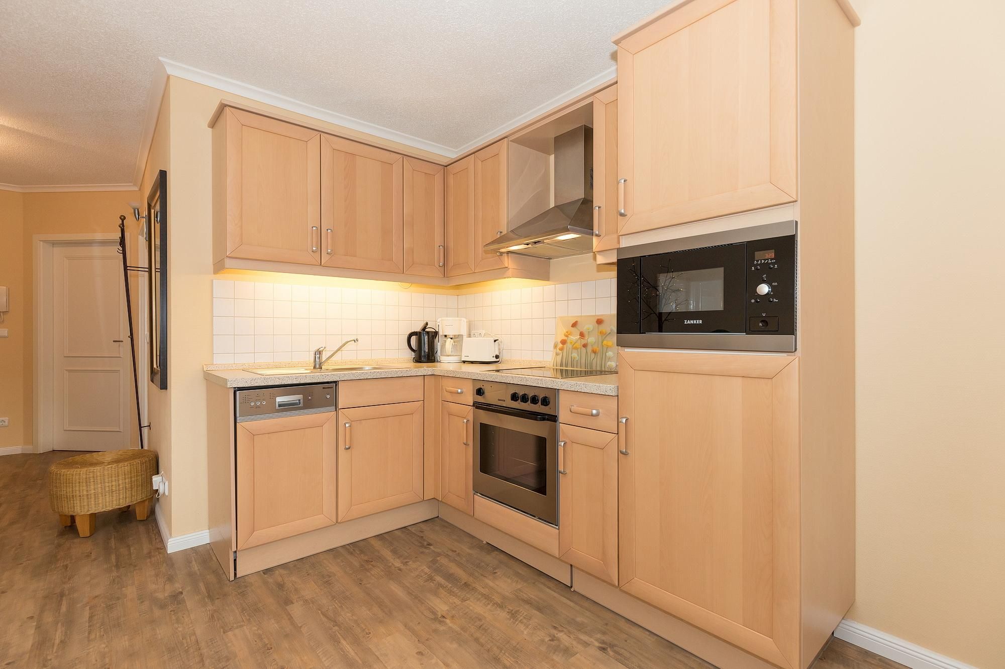 Das helle und gemütliche Nichtraucher-Apartment verfügt über WLAN und eine voll ausgestattete offene Küche mit einem Backofen, einer Mikrowelle, einer Kaffeemaschine, einem Toaster, einem Wasserkocher und einer Geschirrspülmaschine. Im kombinierten Wohn- und Essbereich stehen euch eine HiFi-Anlage, ein Flachbild-TV und eine Doppelschlafcouch zur Verfügung. Sowohl der Esstisch, als auch der behagliche Sitzbereich bieten genügend Platz, um schöne Stunden beim Frühstück oder nach einem ereignisreichen Tag am Strand zu verbringen. Überdies gehören ein Bügelbrett, ein Bügeleisen und ein Föhn zur Ausstattung des Apartments. Die Wohnung verfügt über zwei separate Schlafzimmer, eines ist ausgestattet mit einem großen Doppelbett und Flatscreen-TV, ein weiteres mit einem Etagenbett. Ein Kinderbett kann gegen Entgelt aufgestellt werden und auf Wunsch könnt ihr einen Hochstuhl hinzubuchen. Auf dem nach Süd-West gelegenen Balkon mit Blick auf die Promenade könnt ihr den ganzen Tag die Sonne und das milde Klima der Ostsee genießen.