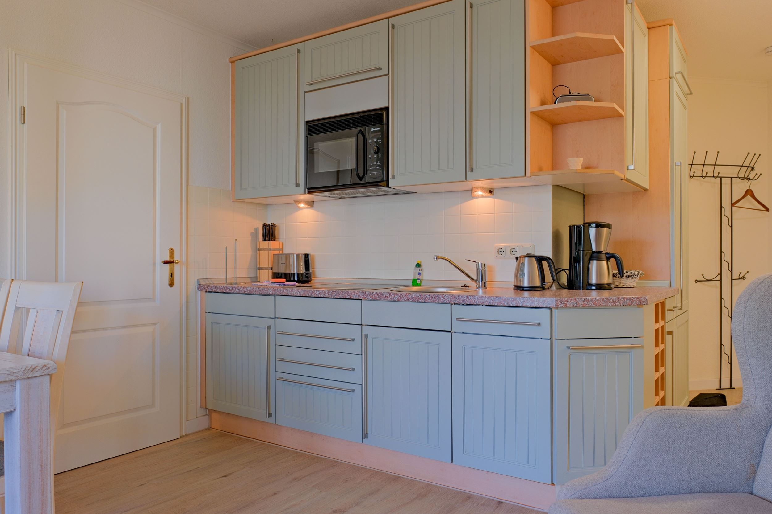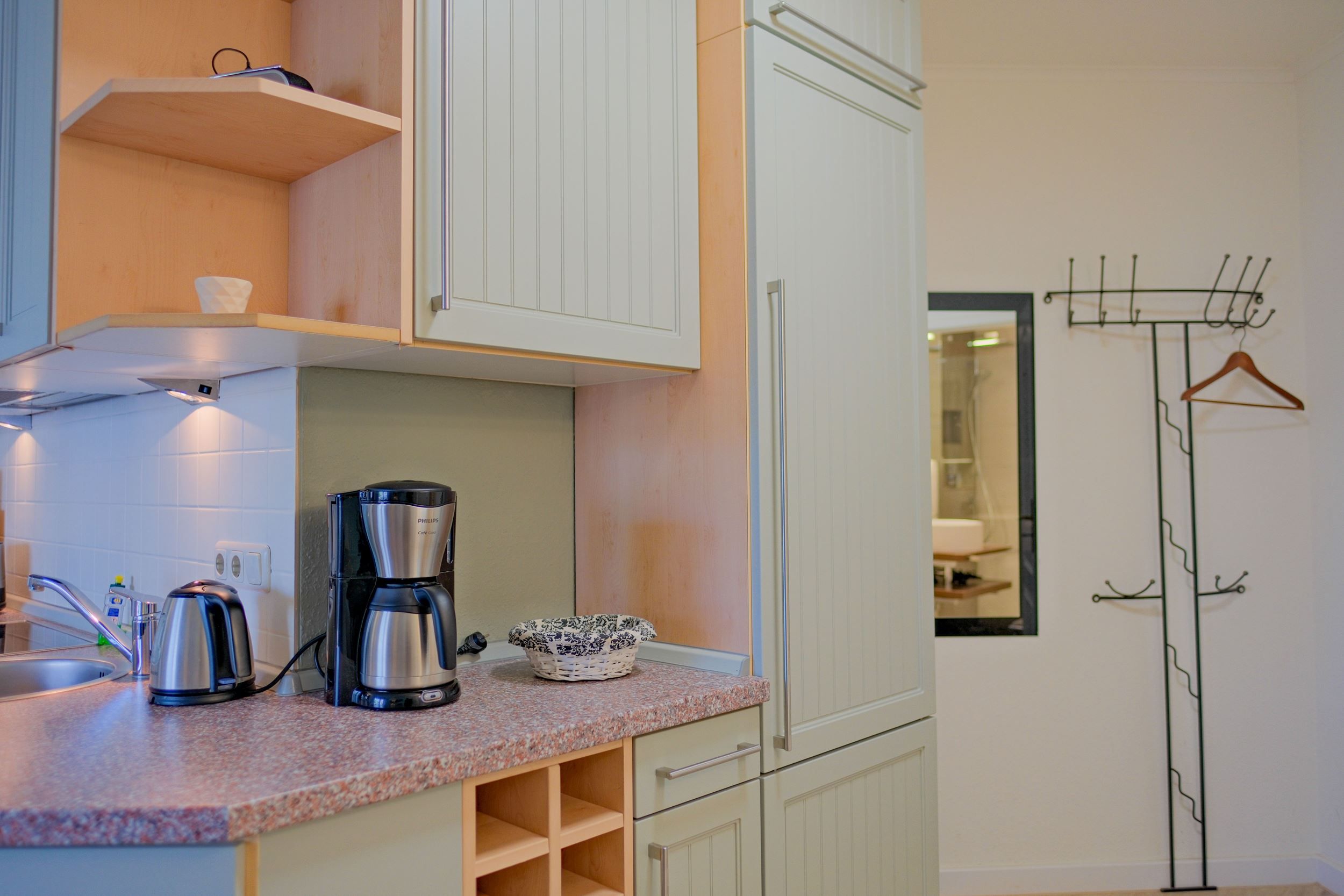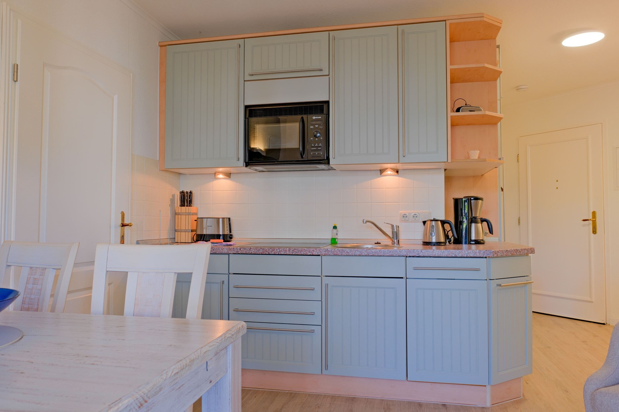 Die voll ausgestattete Küche lässt keine Wünsche offen: moderne Geräte, reichlich Geschirr und ein gemütlicher Essbereich laden zu entspannten Mahlzeiten ein – vom duftenden Frühstück bis zum gemeinsamen Abendessen nach einem Tag am Meer.