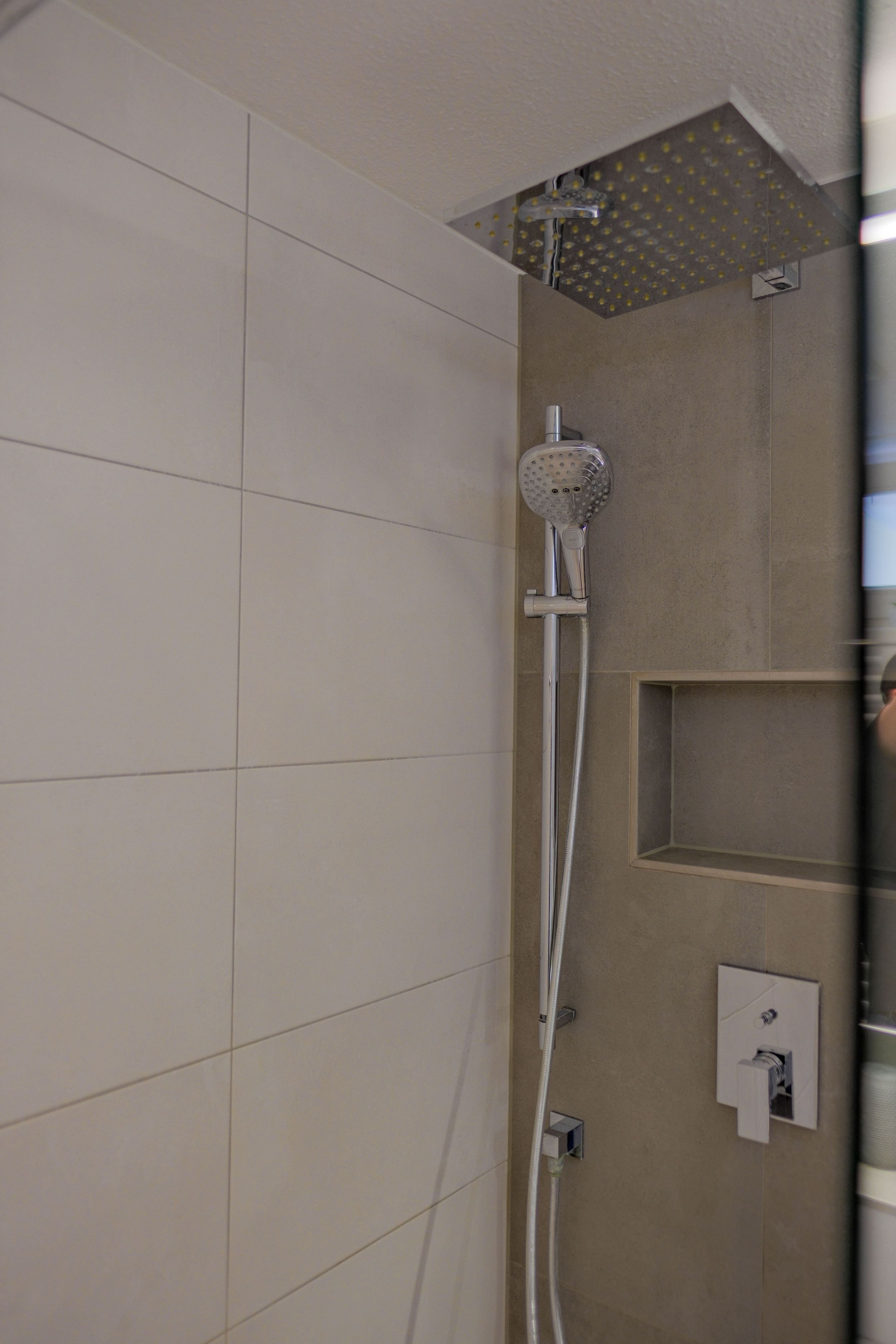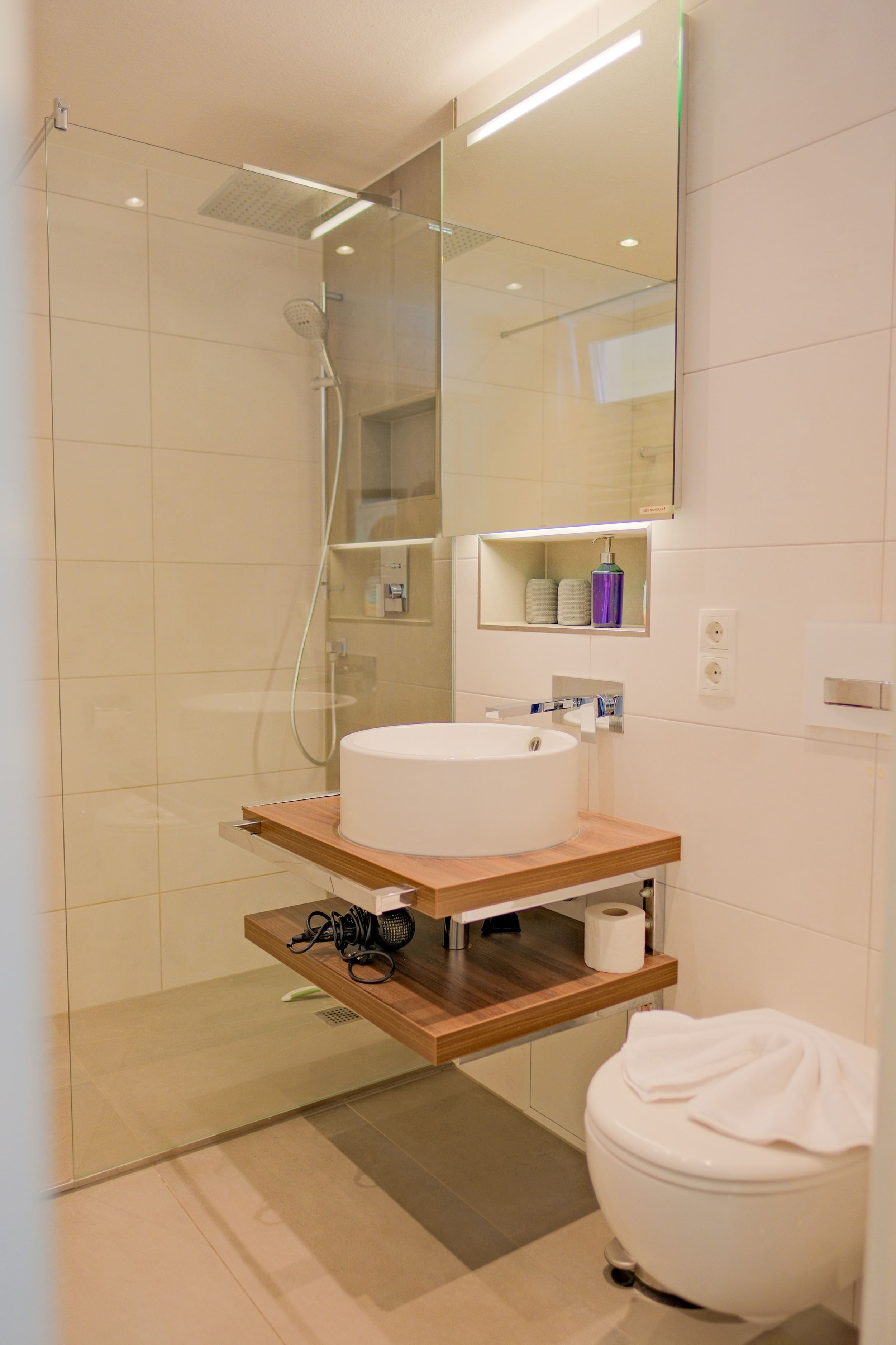 Das Badezimmer ist modern ausgestattet mit Dusche, WC und frischen Handtüchern. WLAN, Flachbild-TV, Waschmaschine und Trockner im Haus sorgen für zusätzlichen Komfort.