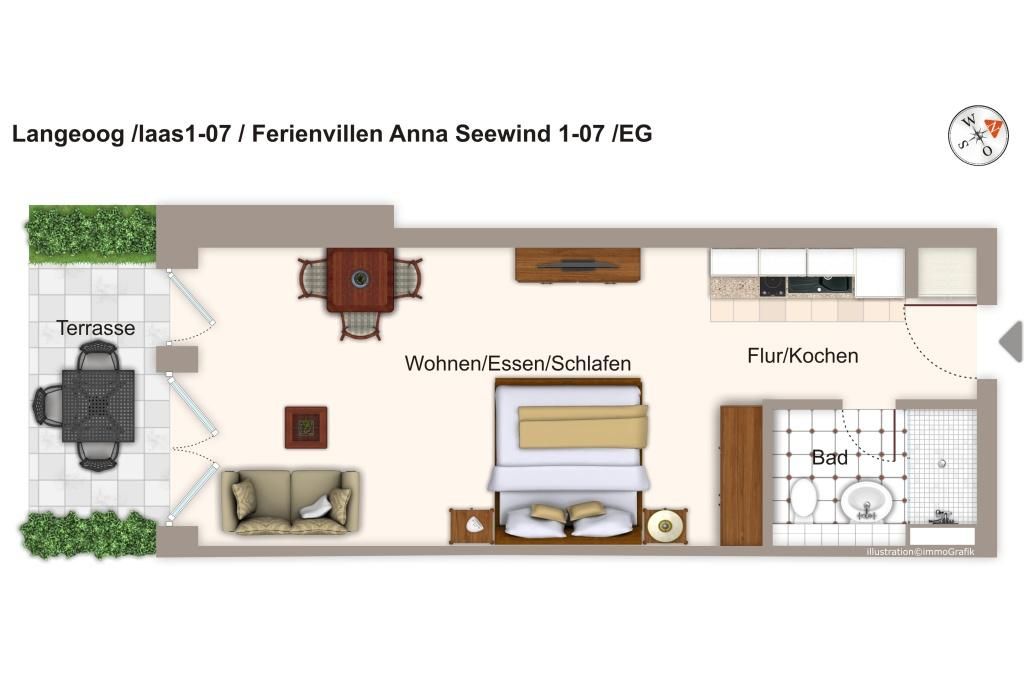Das 36 m² große 1-Zimmer Apartment ist für bis zu 3 Personen geeignet. Besonders hervorzuheben ist die Terrasse in sonnenreicher Westlage. Hier könnt ihr sonnige und erholsame Urlaubstage und laue Sommerabende verleben.