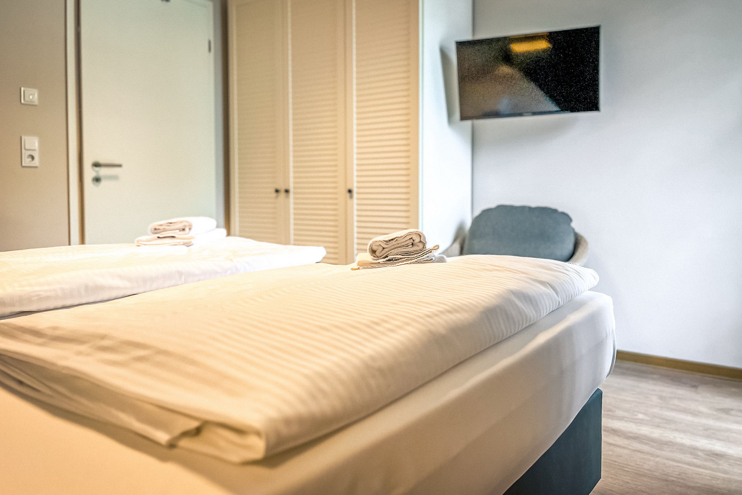 Im separaten Schlafzimmer befindet sich ein komfortables Doppelbett (2x 90x200 cm) sowie ein zusätzlicher Fernseher – für gemütliche Abende auch im Bett.