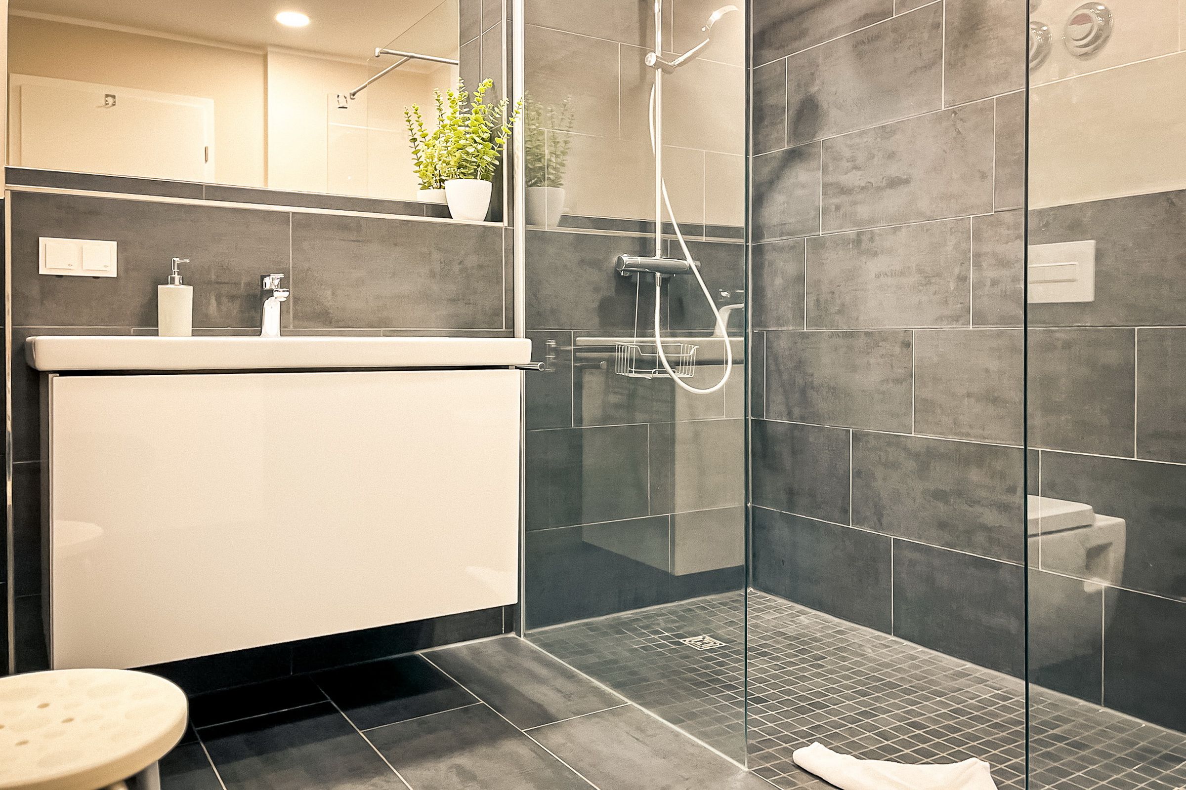 Das moderne Bad verfügt über eine bodengleiche Dusche, WC, Waschbecken, Haartrockner und Kosmetikspiegel – ideal für Deinen erfrischenden Start in den Tag.