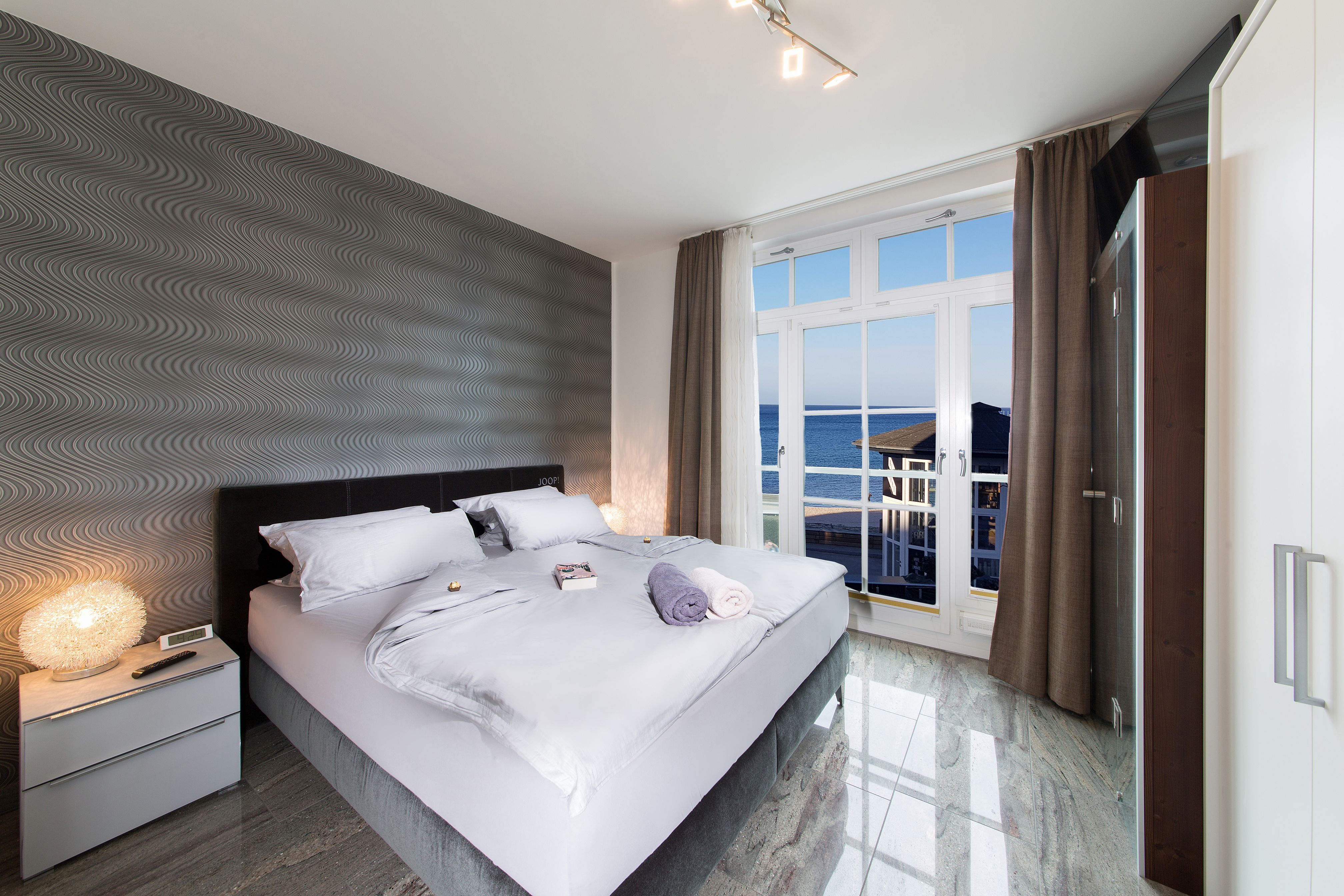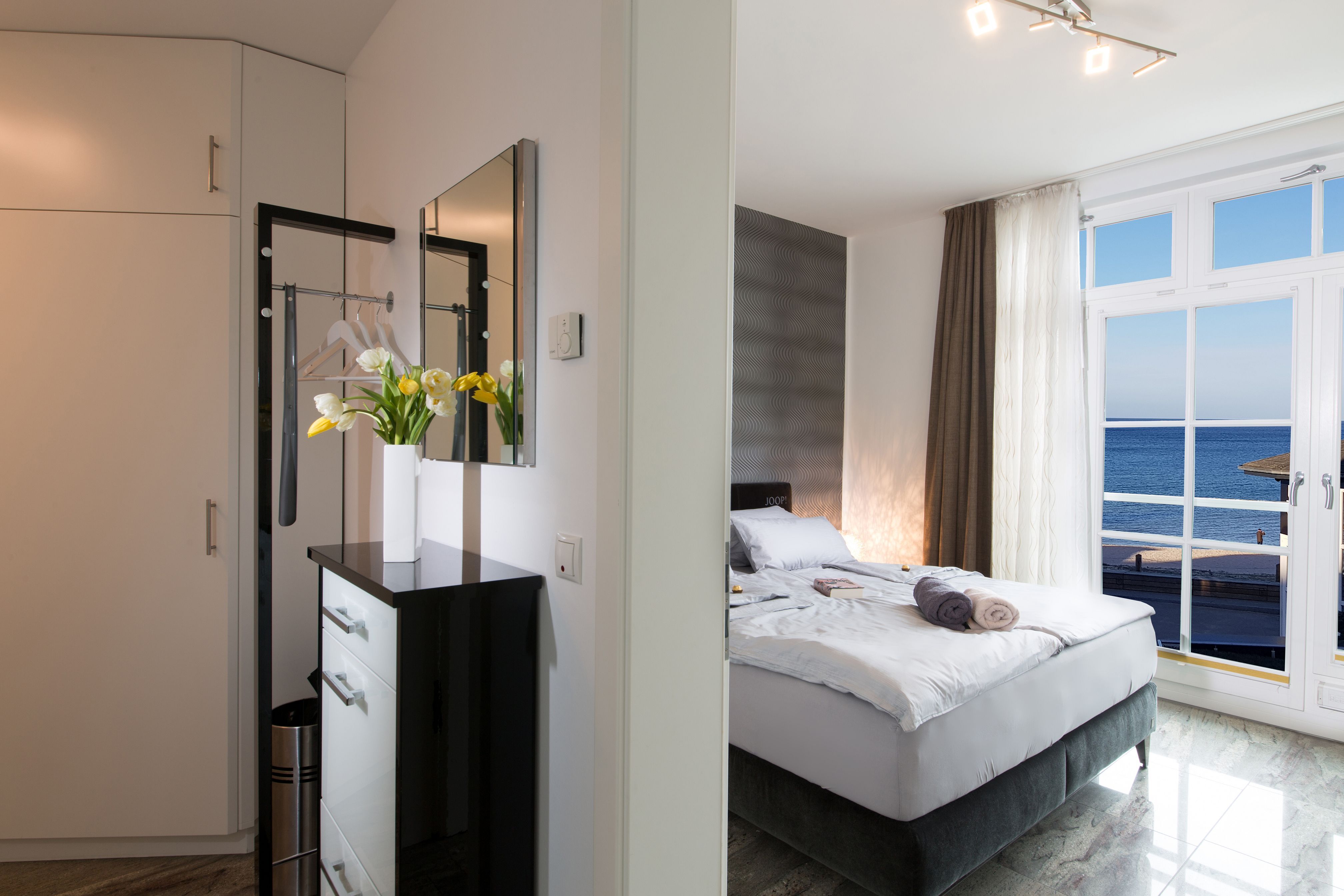 Das Schlafzimmer der Ferienwohnung lädt zum Träumen ein. Mit einem komfortablen Doppelbett, hochwertigen Matratzen und einer stilvollen Einrichtung bietet es Ihnen die perfekte Rückzugsmöglichkeit nach einem erlebnisreichen Tag an der Ostseeküste. Ein besonderes Highlight ist der direkte Blick auf das Meer, den Sie bereits am Morgen genießen können, wenn die ersten Sonnenstrahlen durch das Fenster fallen.