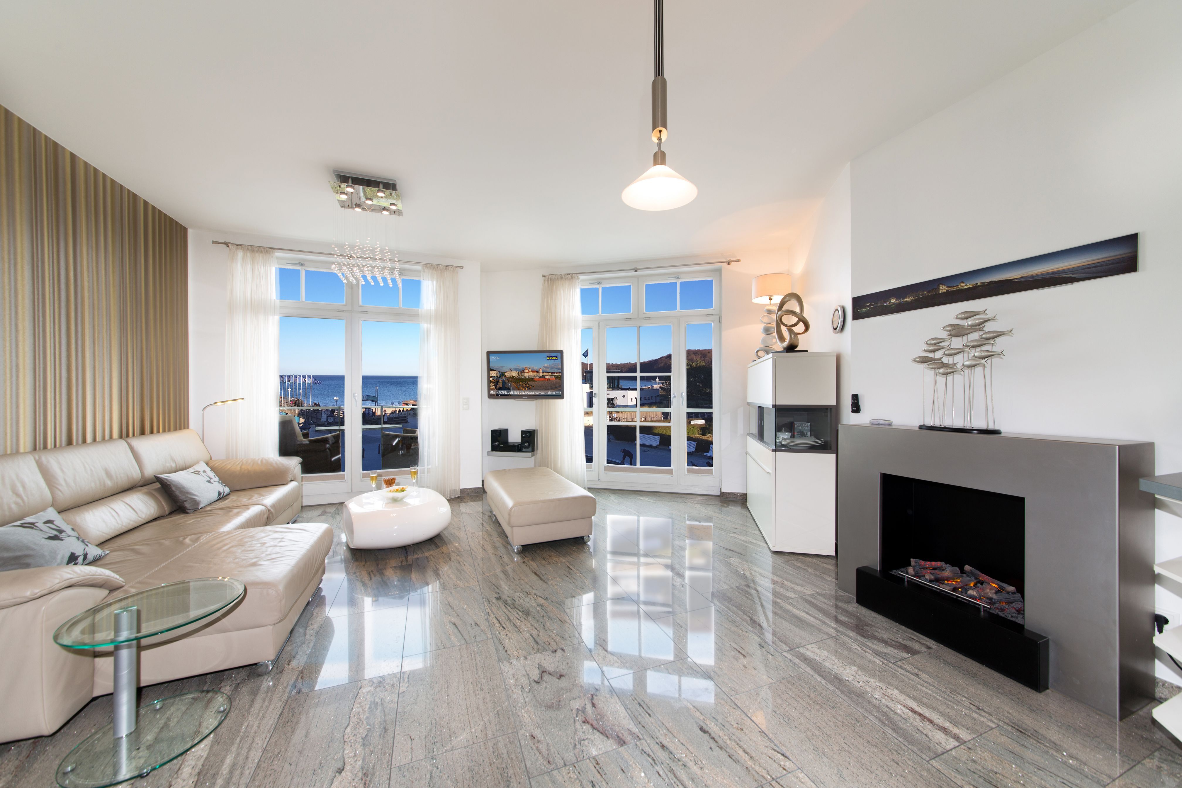 Das helle und stilvoll eingerichtete Wohnzimmer bildet das Herzstück der Wohnung. Zwei große, bodentiefe Panoramafenster eröffnen Ihnen einen atemberaubenden Blick auf die Ostsee und die bekannte Binzer Seebrücke. Ob bei strahlendem Sonnenschein oder in den Abendstunden, wenn die untergehende Sonne das Meer in warme Farben taucht – dieser Ausblick wird Ihnen garantiert in Erinnerung bleiben. In den kühleren Monaten sorgt der elegante Kamin für eine behagliche Wohlfühlatmosphäre, während Sie es sich auf der bequemen Couch mit einem guten Buch oder einem Glas Wein gemütlich machen können.