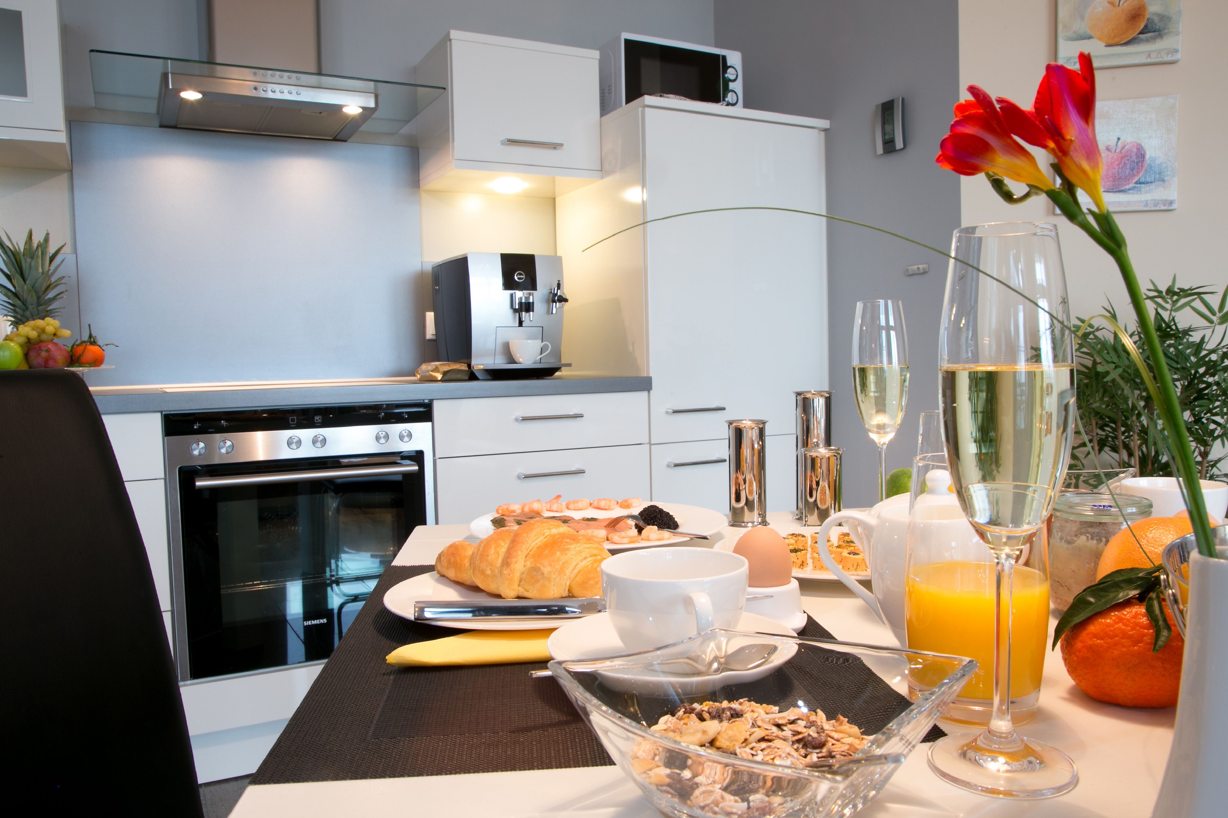 Die angrenzende Küche lässt keine Wünsche offen: Mit modernster Ausstattung inklusive Backofen, Spülmaschine, Cerankochfeld, Kühlschrank und sämtlichen Küchenutensilien können Sie hier nach Lust und Laune Ihre Lieblingsgerichte zubereiten. Ob ein ausgiebiges Frühstück mit frischen Brötchen oder ein gemütliches Abendessen mit Blick auf das Meer – in dieser Küche macht Kochen Spaß.