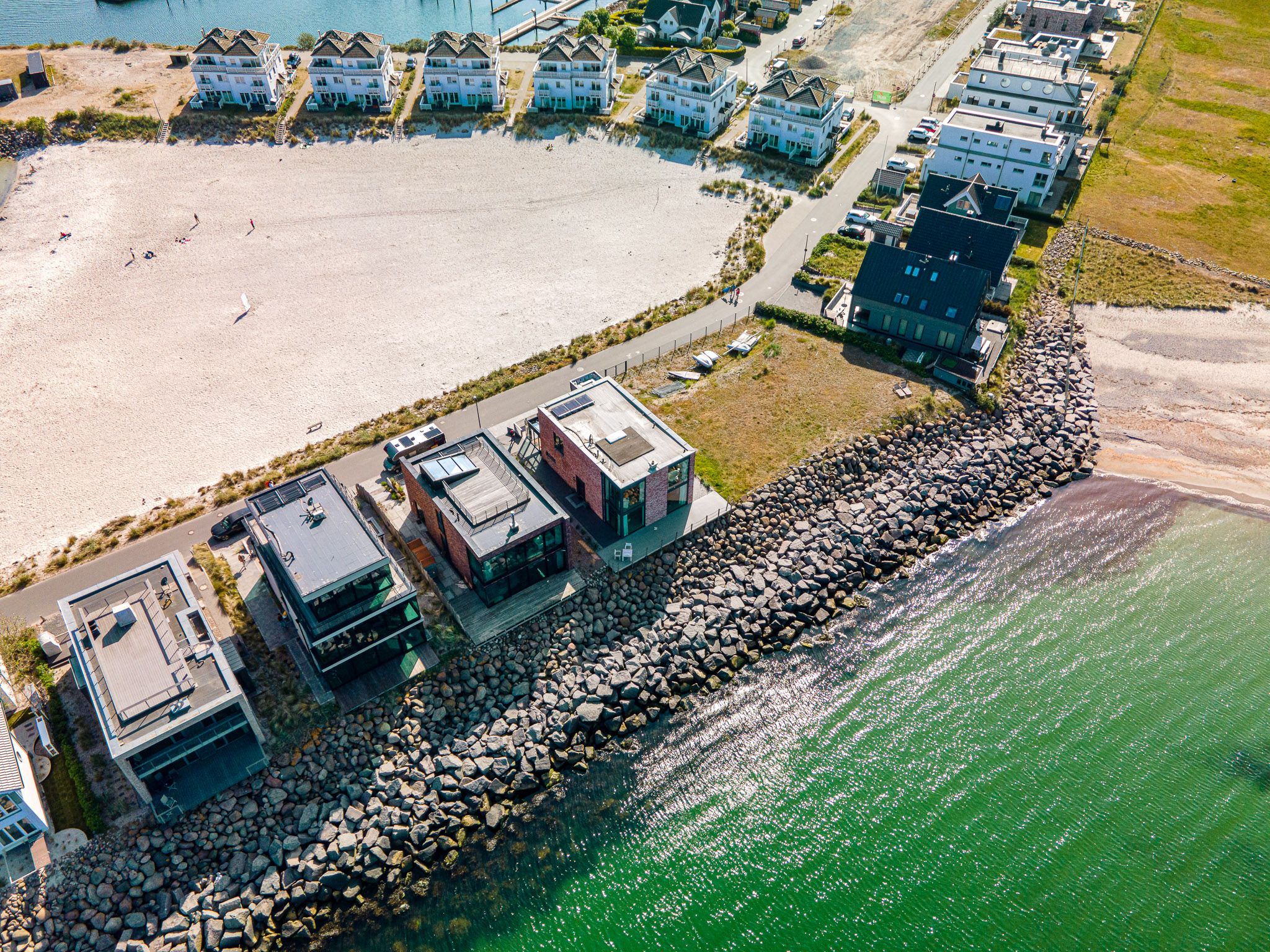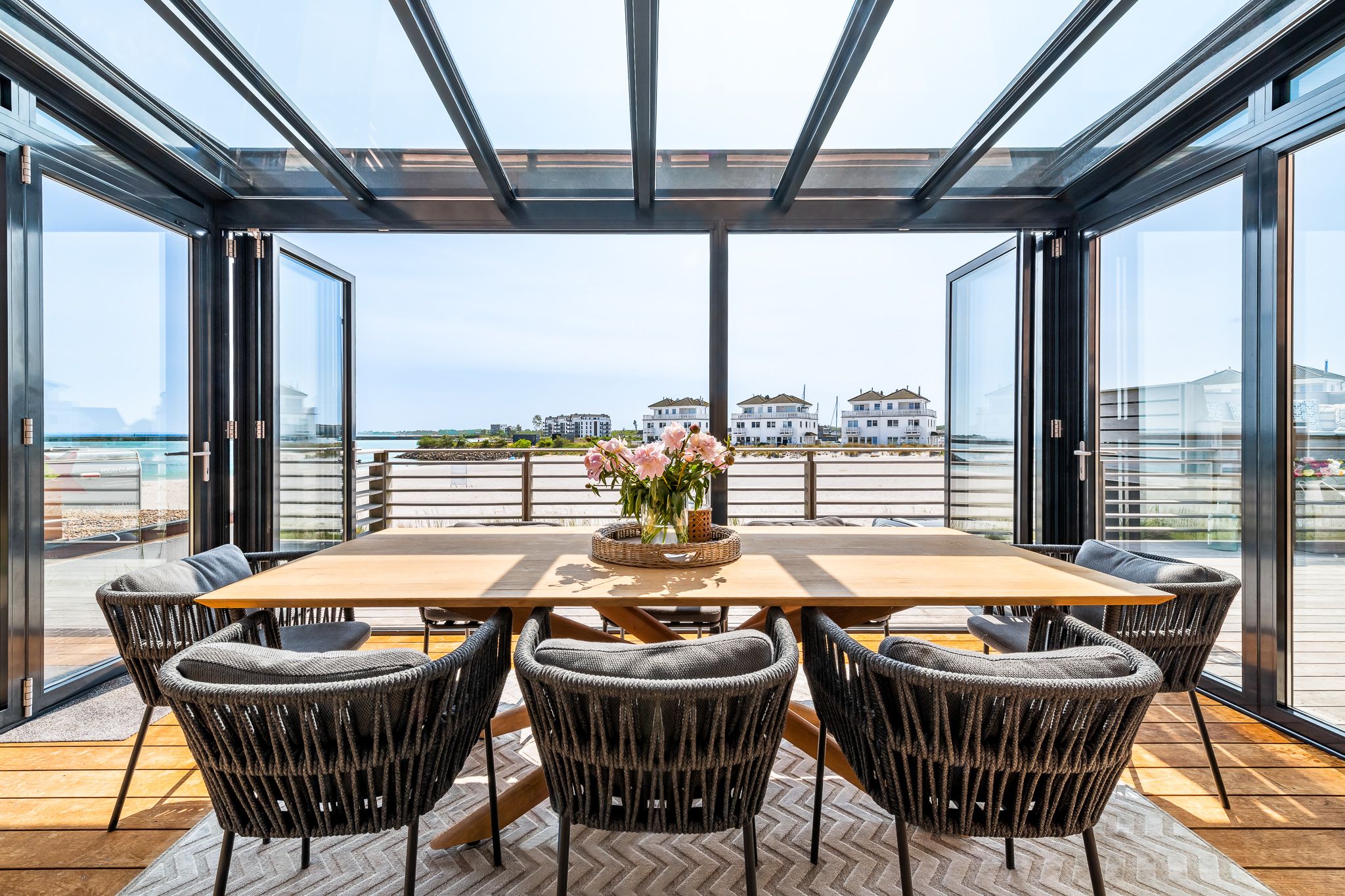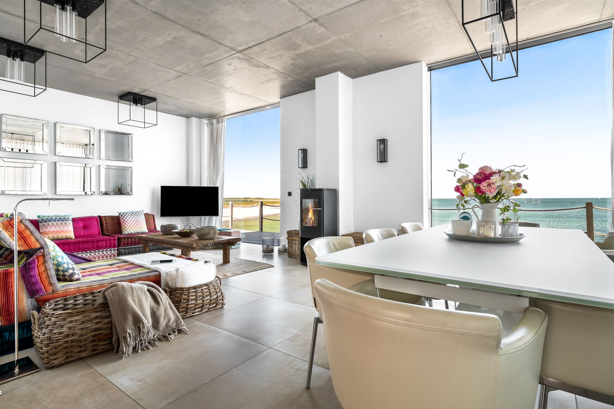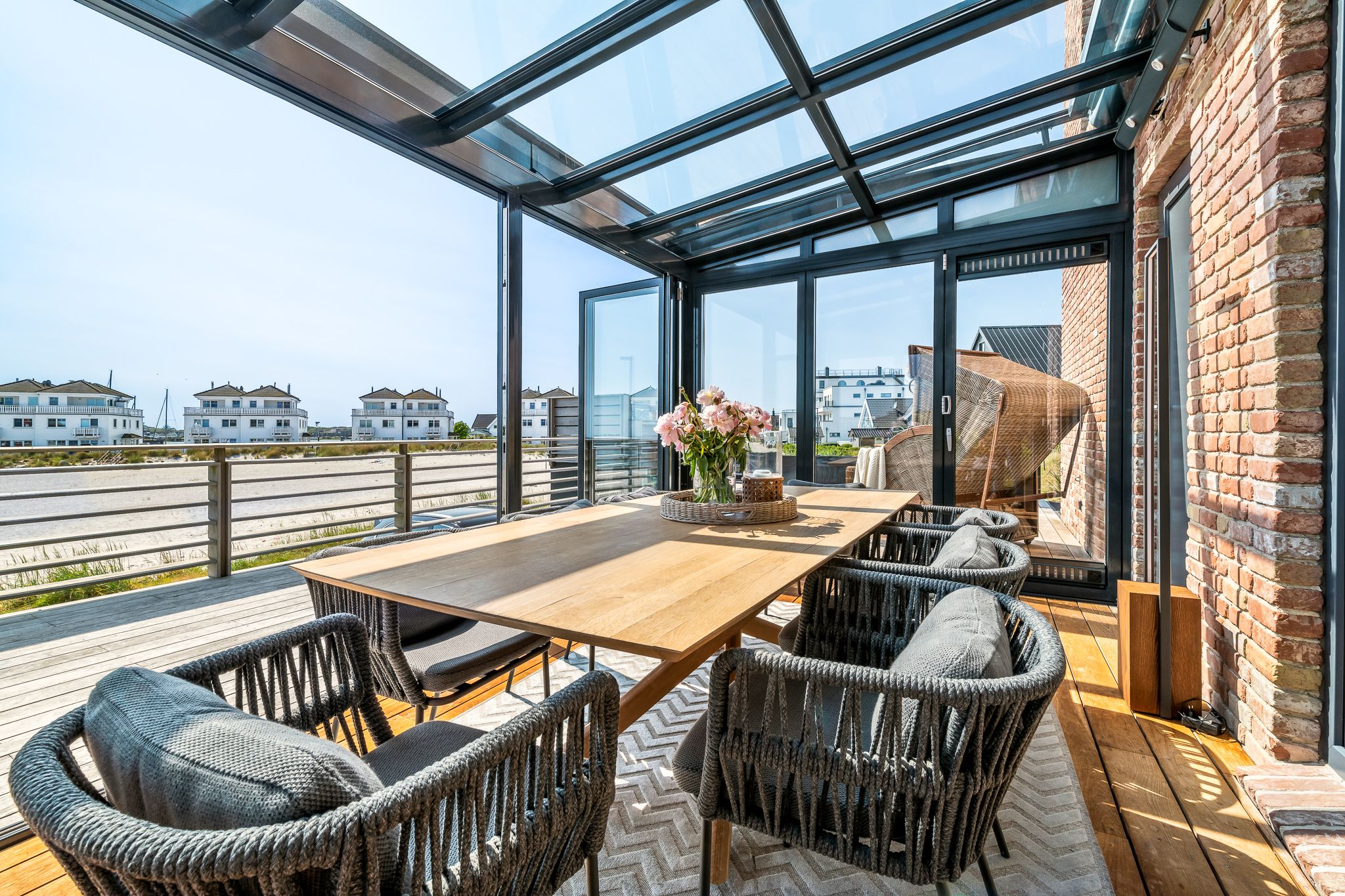 Die großzügige, offene Küche mit Strandblick lädt zum gemeinsamen Kochen ein. Im Wohn-Essbereich genießen Sie im Winter das knisternde Kaminfeuer mit Ostseeblick. Im Sommer öffnen Sie Schiebetüren für eine sanfte Brise. Der strandseitige, beheizbare Wintergarten mit Panoramablick verwandelt jede Jahreszeit in ein Erholungsnaturerlebnis.