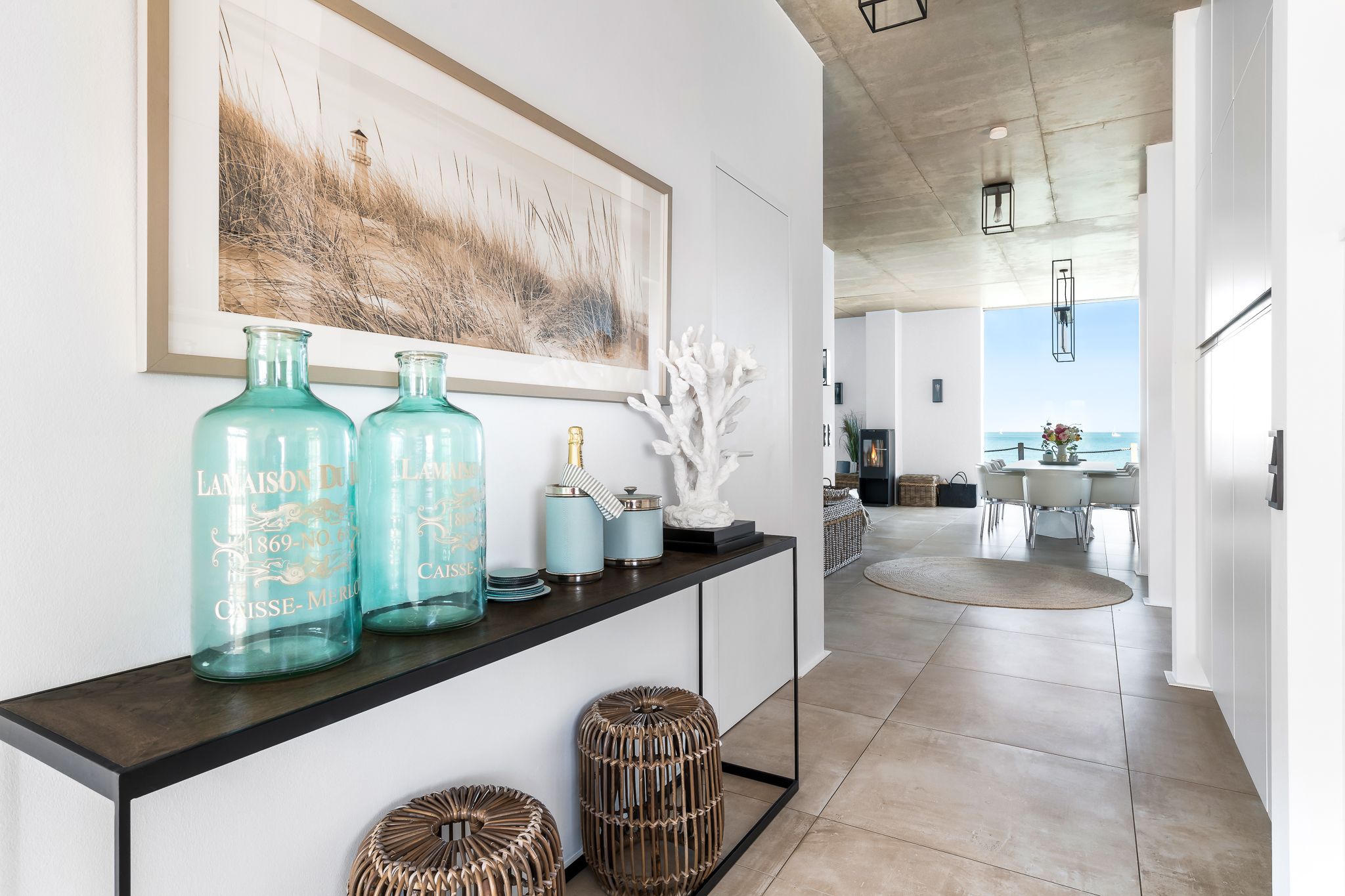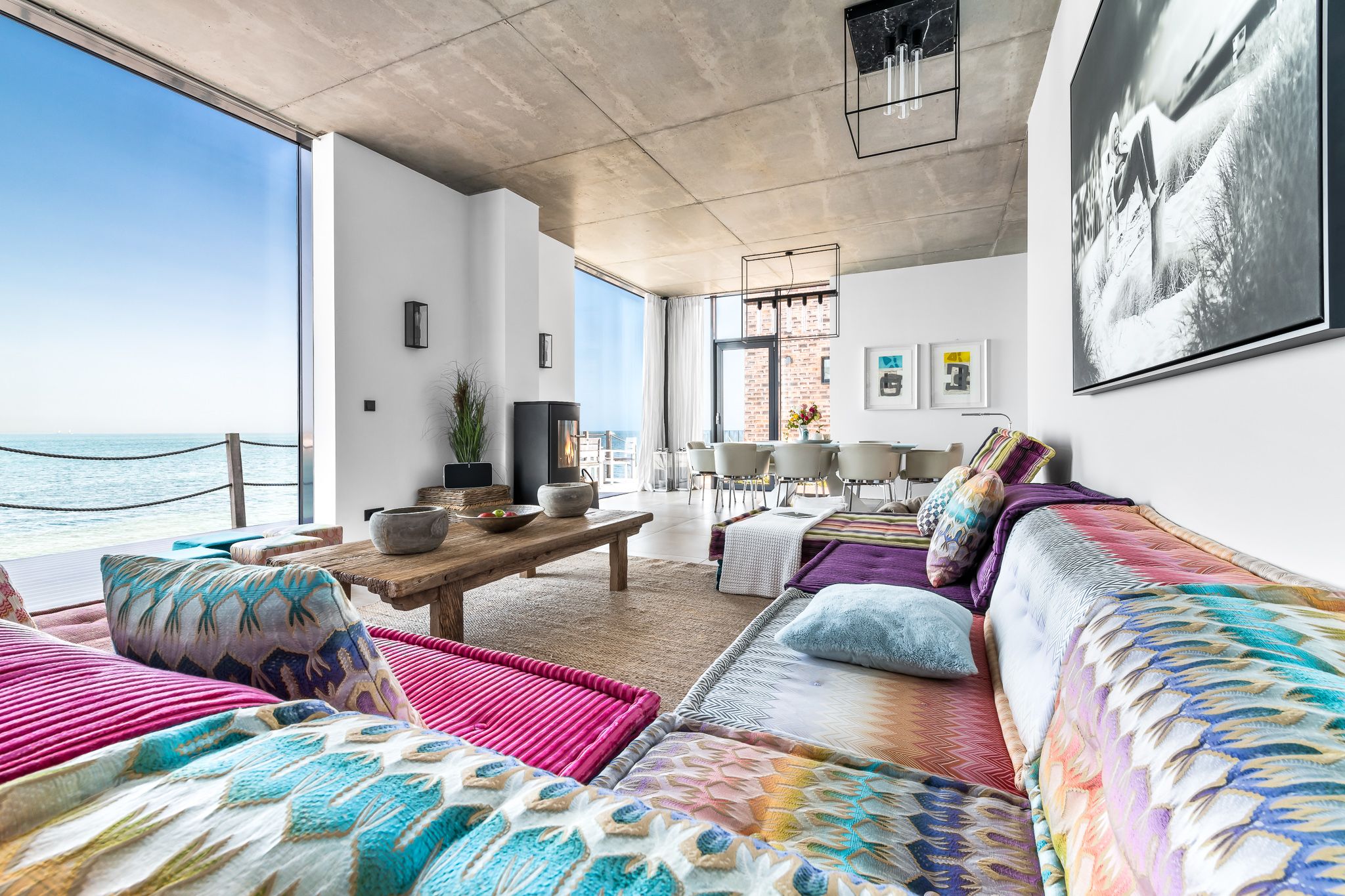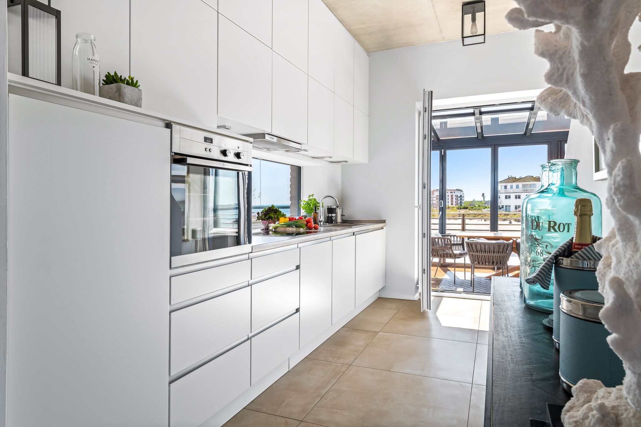 Die großzügige, offene Küche mit Strandblick lädt zum gemeinsamen Kochen ein. Im Wohn-Essbereich genießen Sie im Winter das knisternde Kaminfeuer mit Ostseeblick. Im Sommer öffnen Sie Schiebetüren für eine sanfte Brise. Der strandseitige, beheizbare Wintergarten mit Panoramablick verwandelt jede Jahreszeit in ein Erholungsnaturerlebnis.