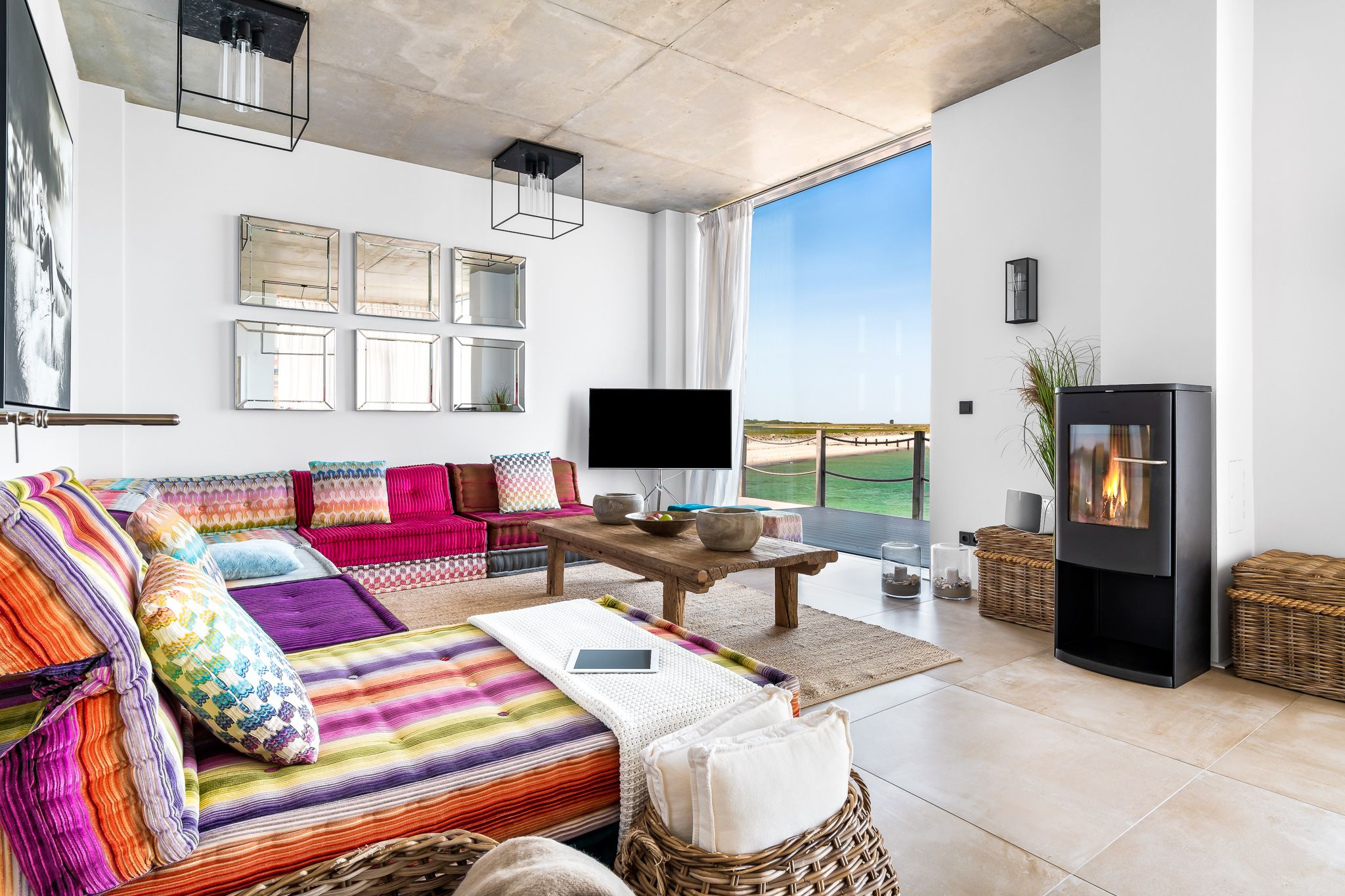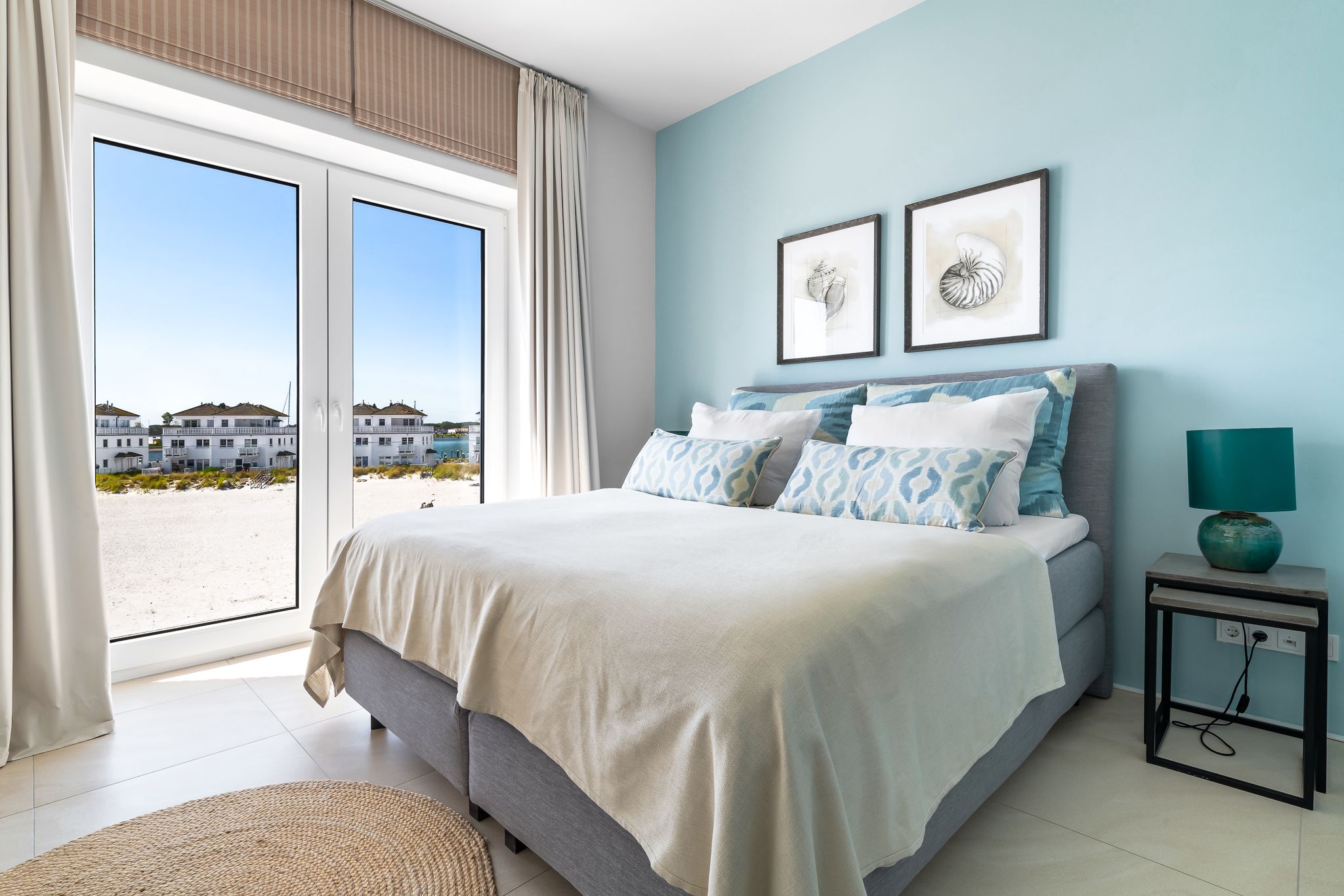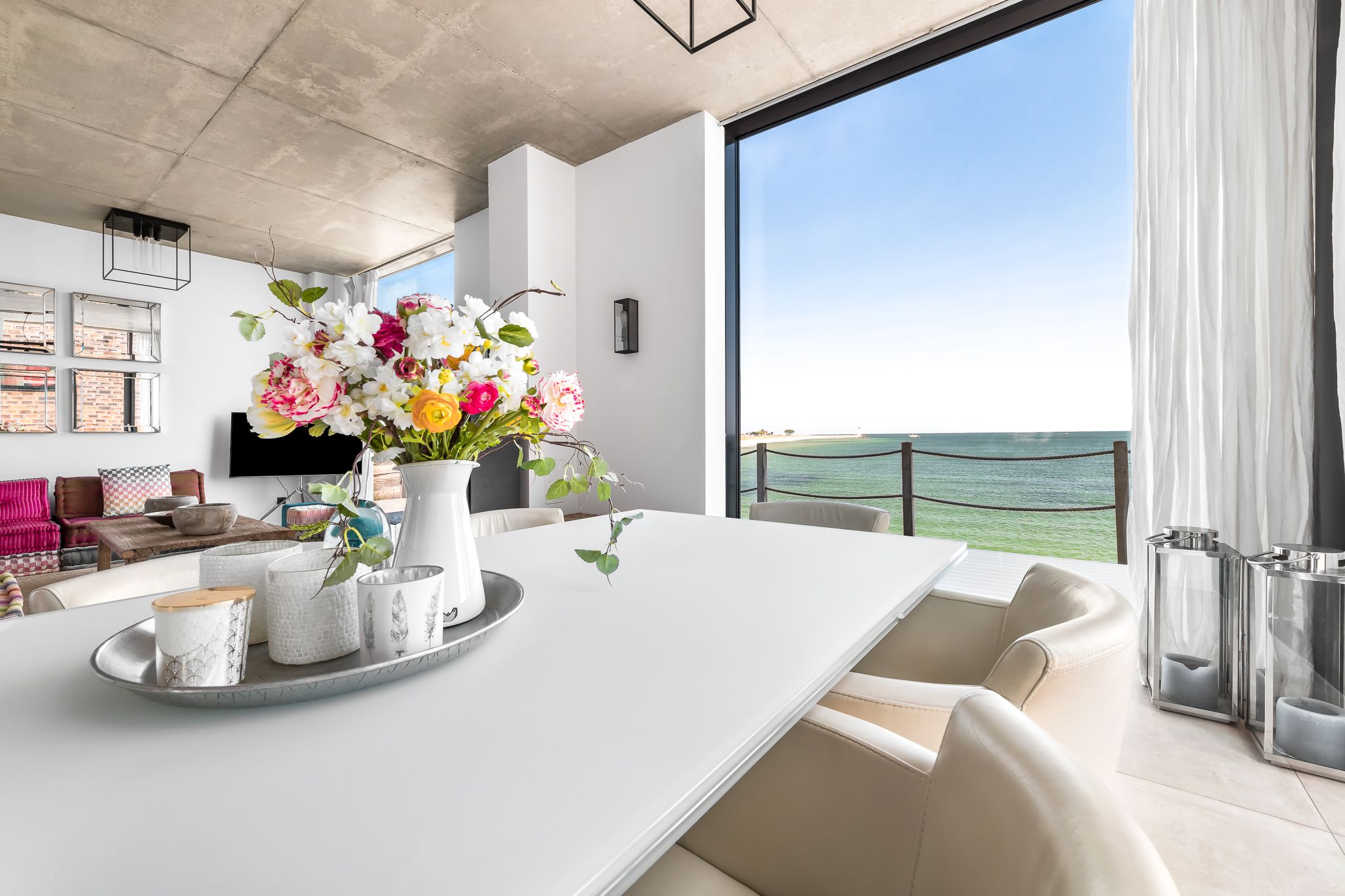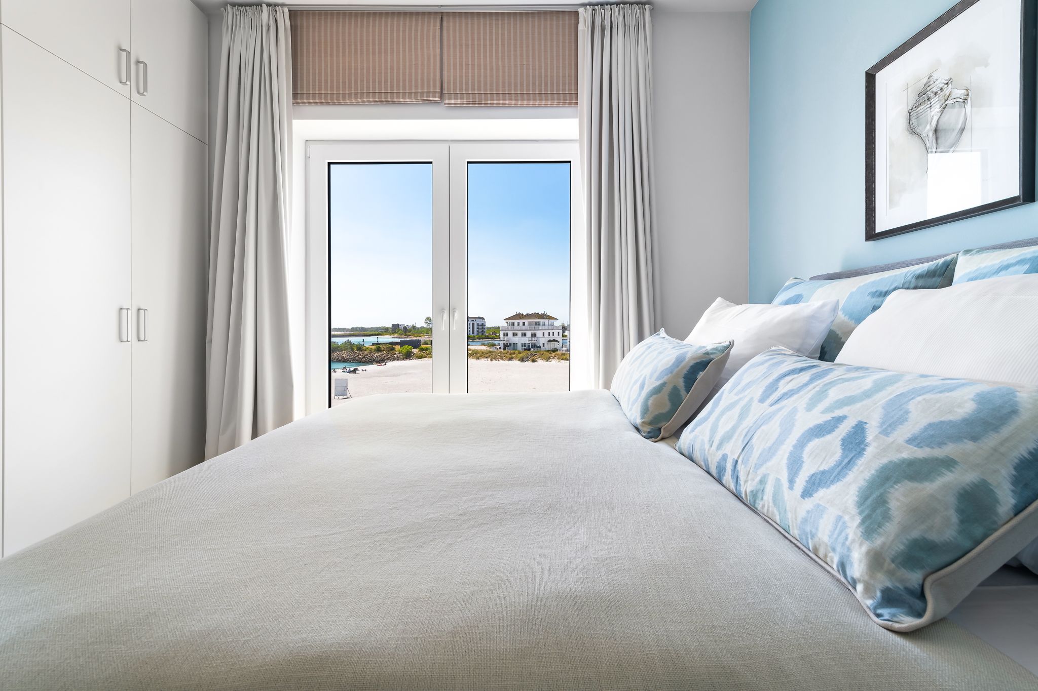 Die großzügige, offene Küche mit Strandblick lädt zum gemeinsamen Kochen ein. Im Wohn-Essbereich genießen Sie im Winter das knisternde Kaminfeuer mit Ostseeblick. Im Sommer öffnen Sie Schiebetüren für eine sanfte Brise. Der strandseitige, beheizbare Wintergarten mit Panoramablick verwandelt jede Jahreszeit in ein Erholungsnaturerlebnis.