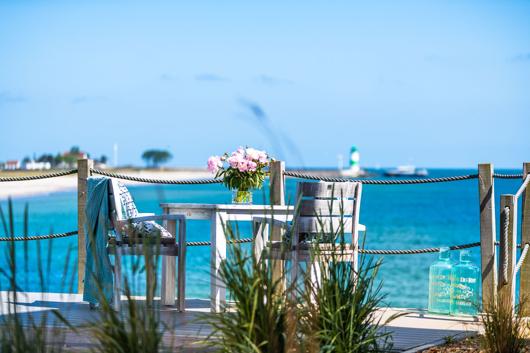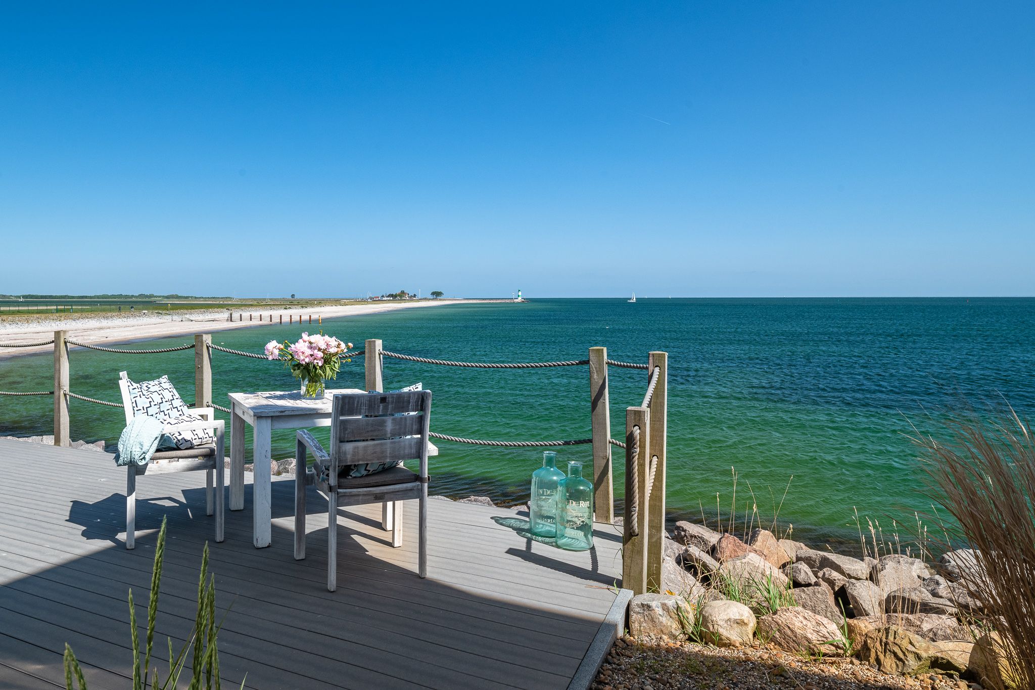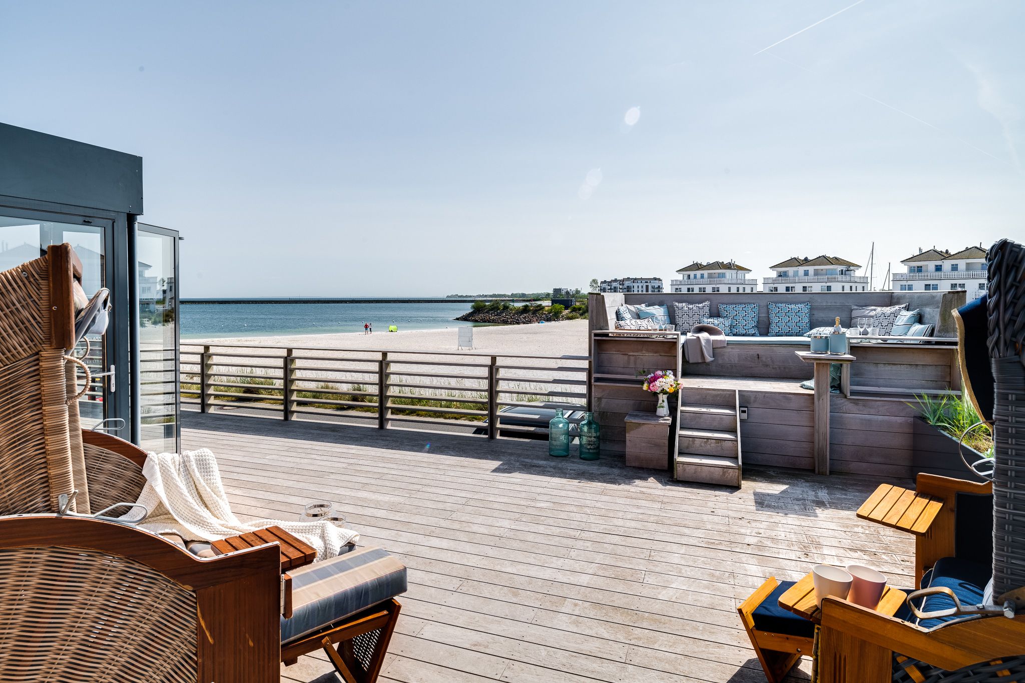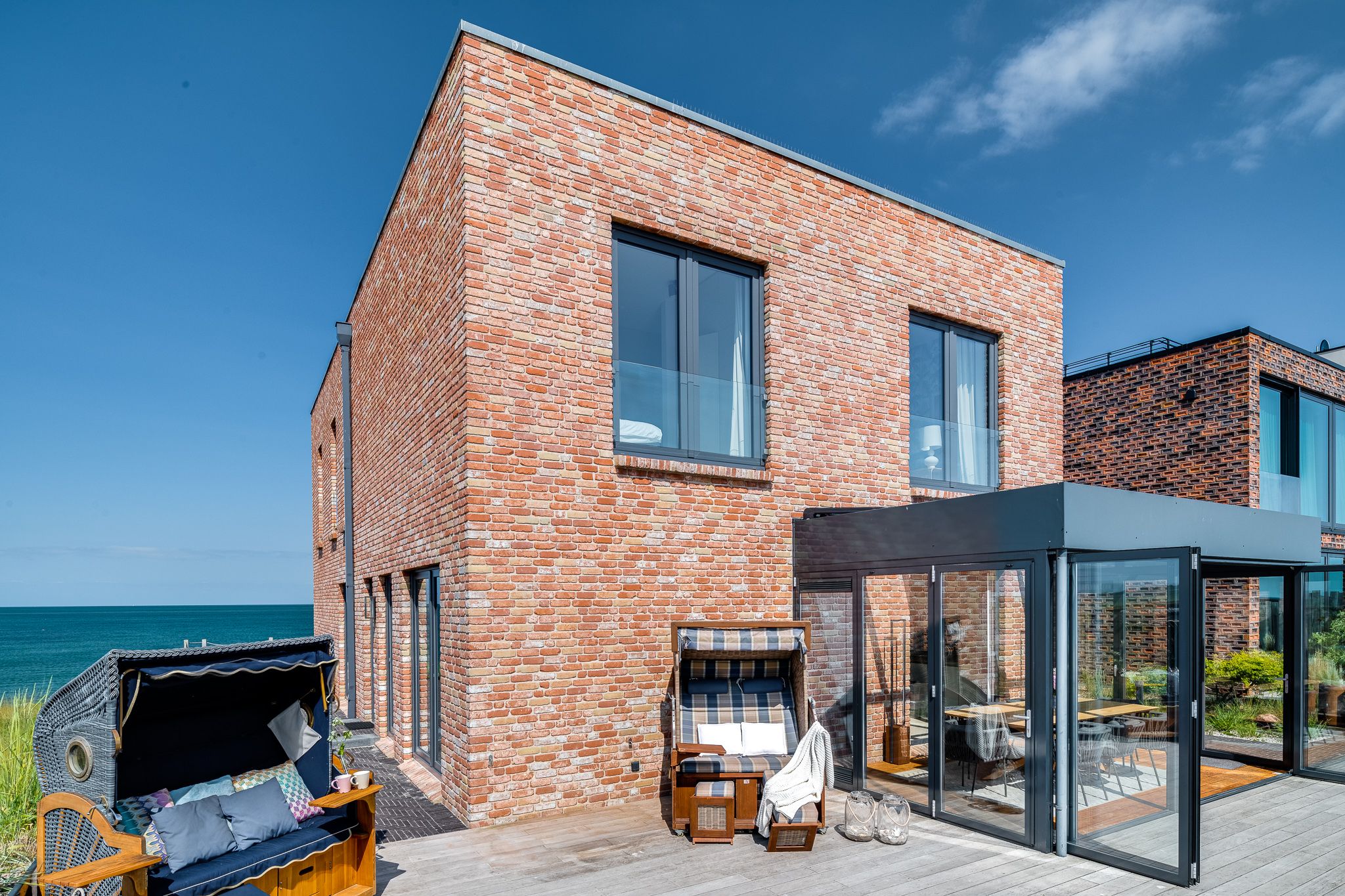 Zwei Terrassen mit Strandkörben bieten den perfekten Rahmen, um die maritime Idylle zu genießen. Ein Parkplatz vor der Villa und ein Schuppen für Fahrräder und Equipment ergänzen das Angebot ideal.