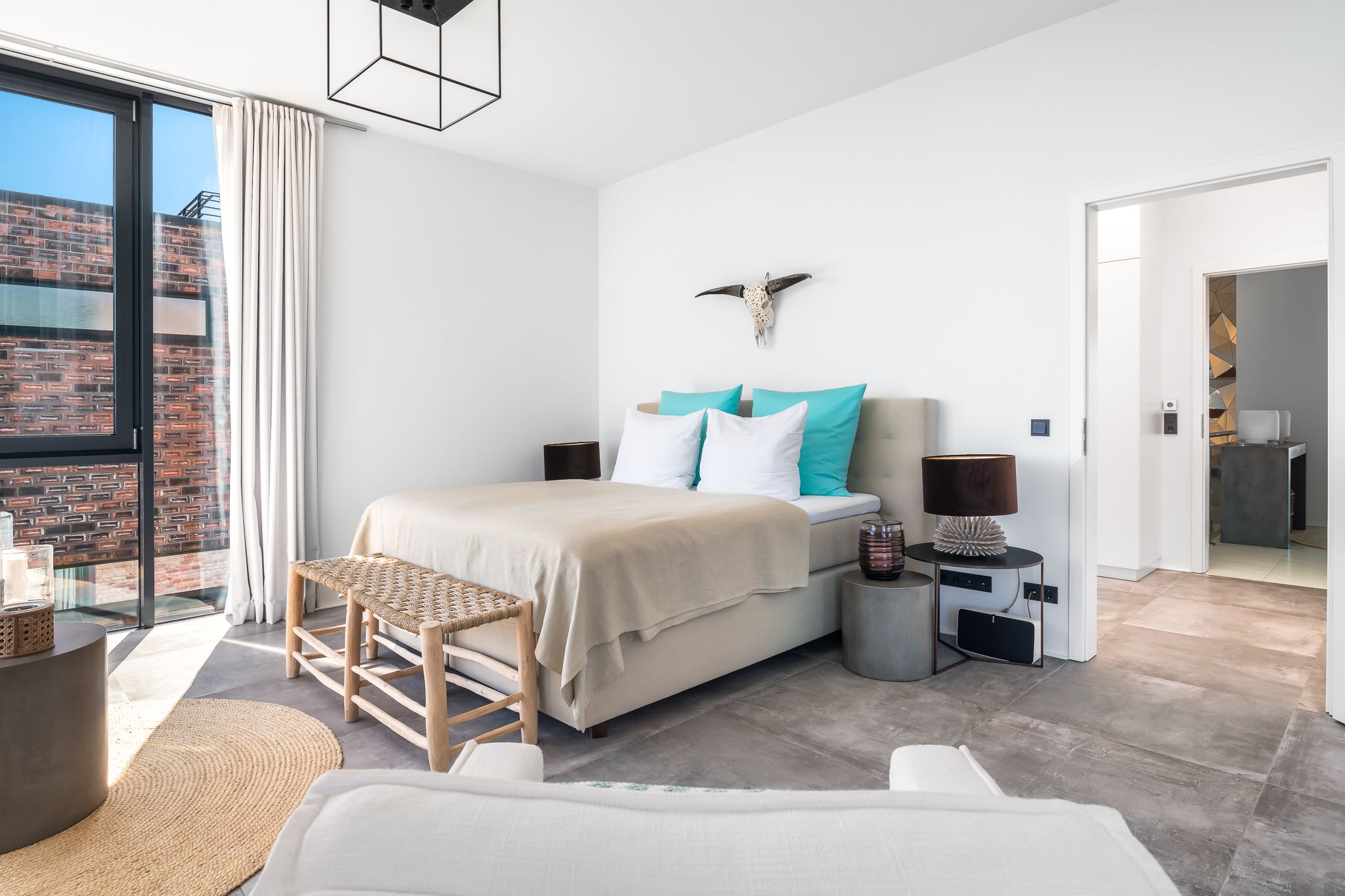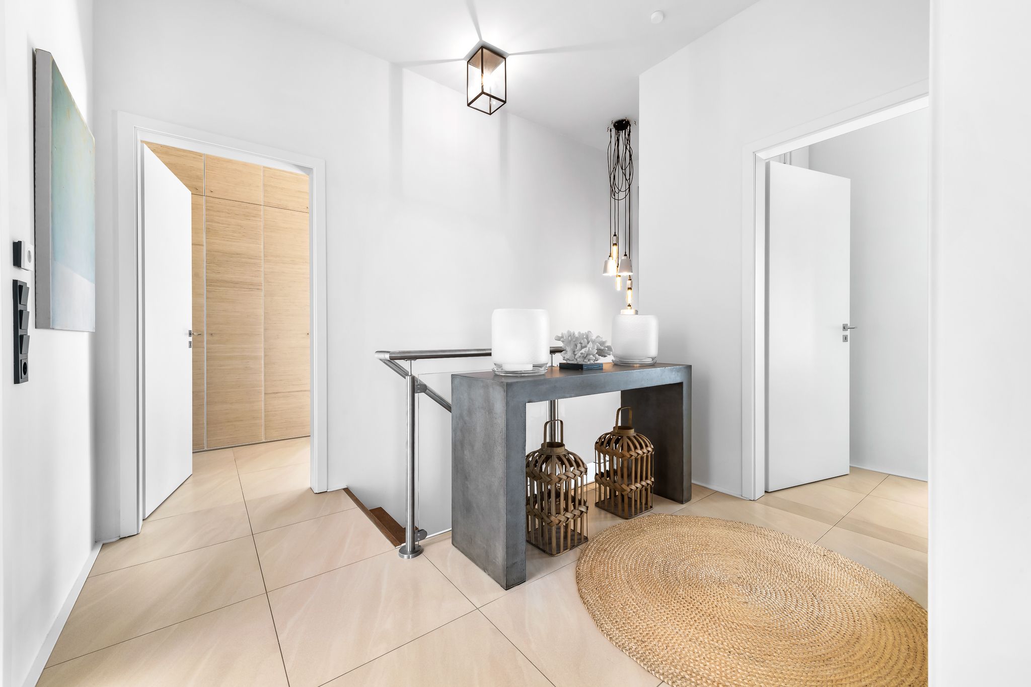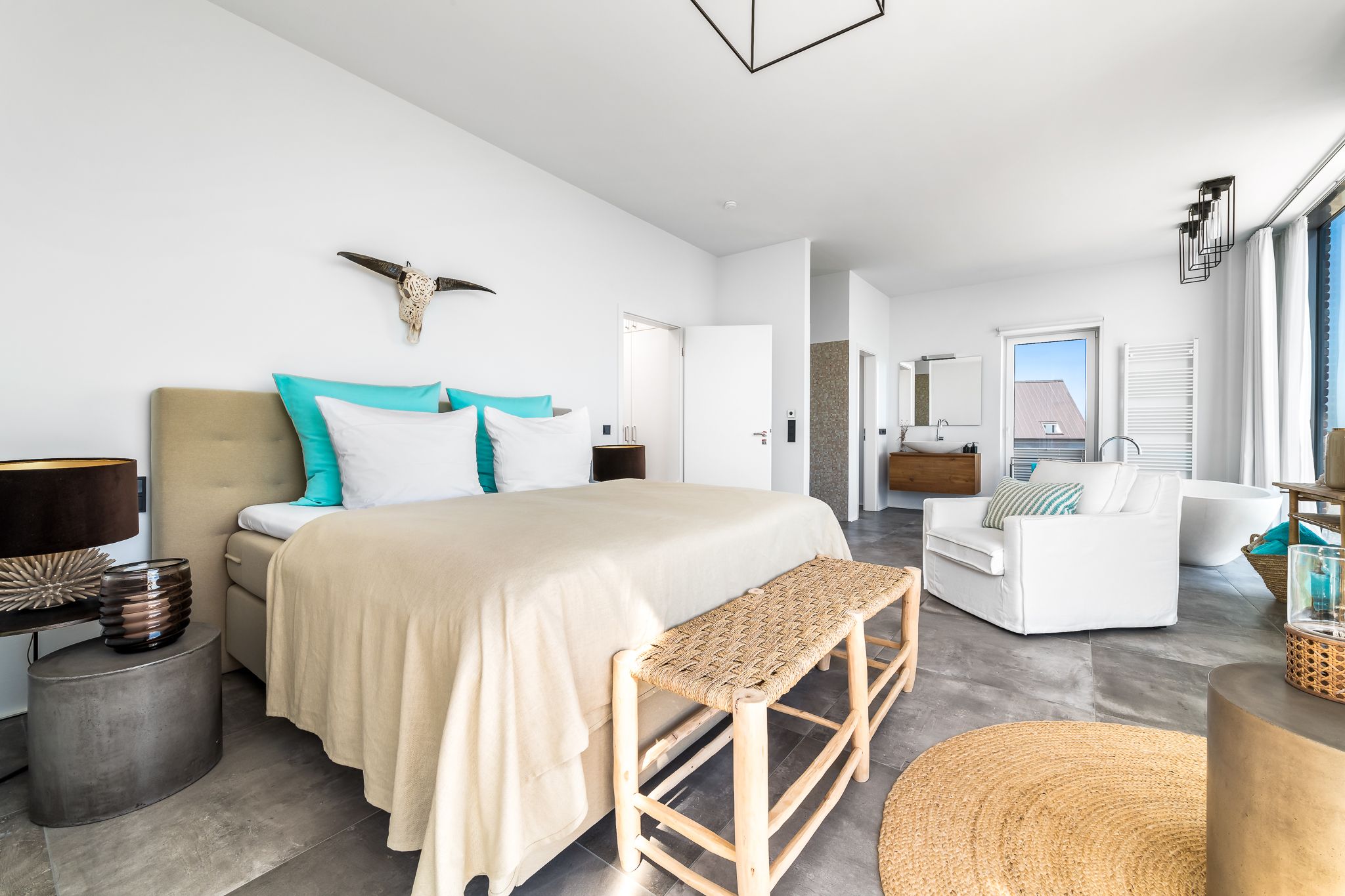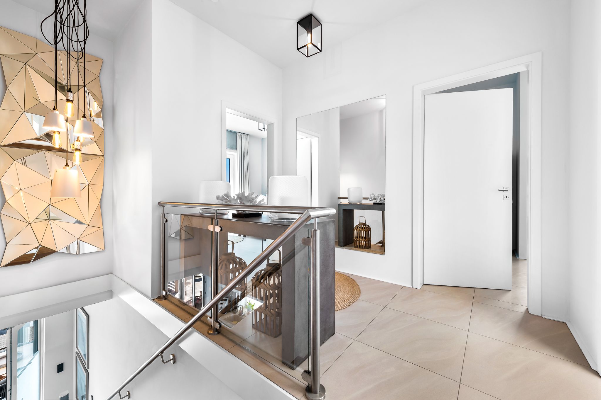 Im Obergeschoss finden Sie drei geräumige Schlafzimmer mit bodentiefen Fenstern, einem begehbaren Kleiderschrank und hochwertigen Boxspringbetten. Eine frei stehende Badewanne im Masterbedroom und eine große Sauna bieten puren Luxus zur Entspannung.