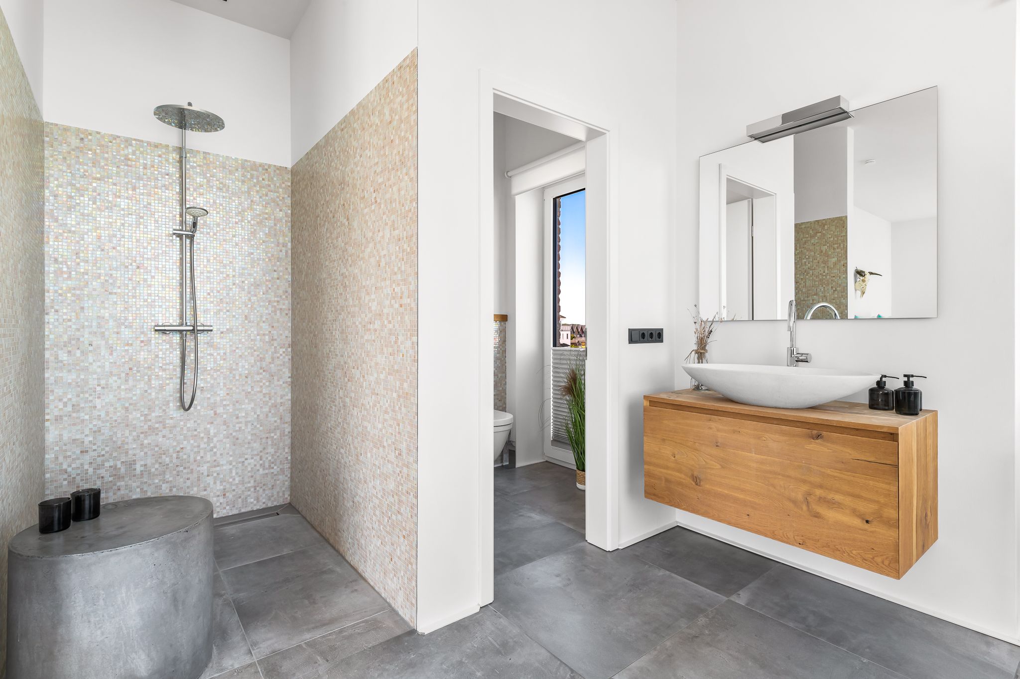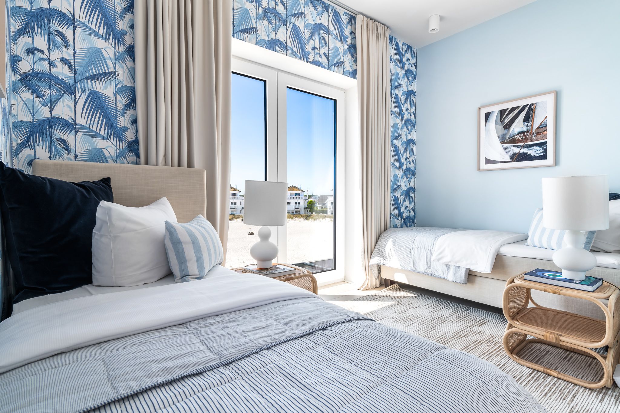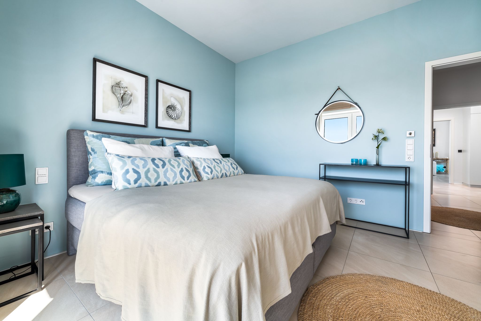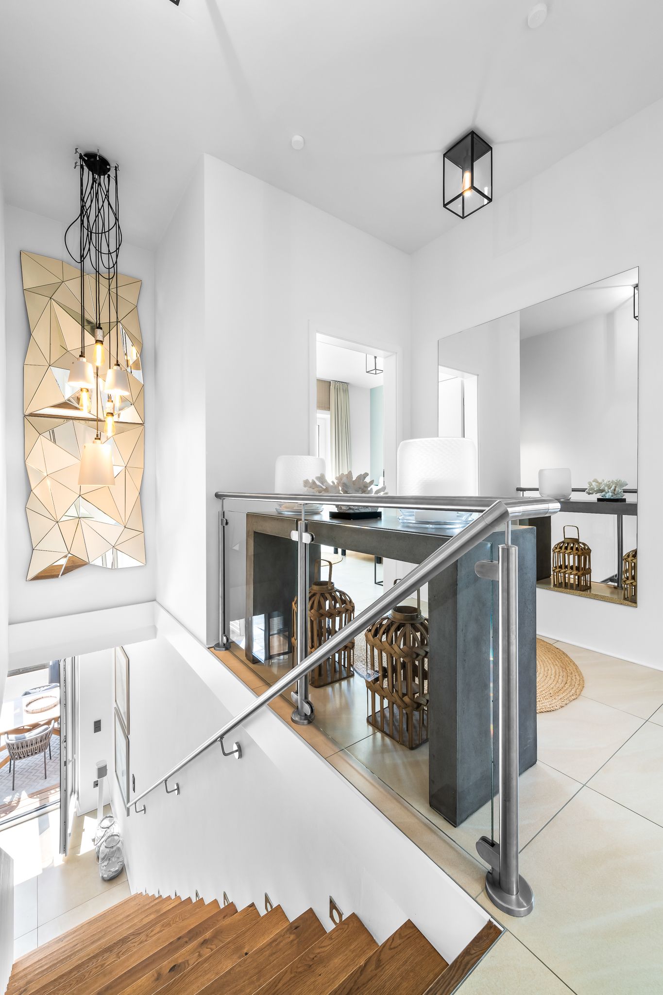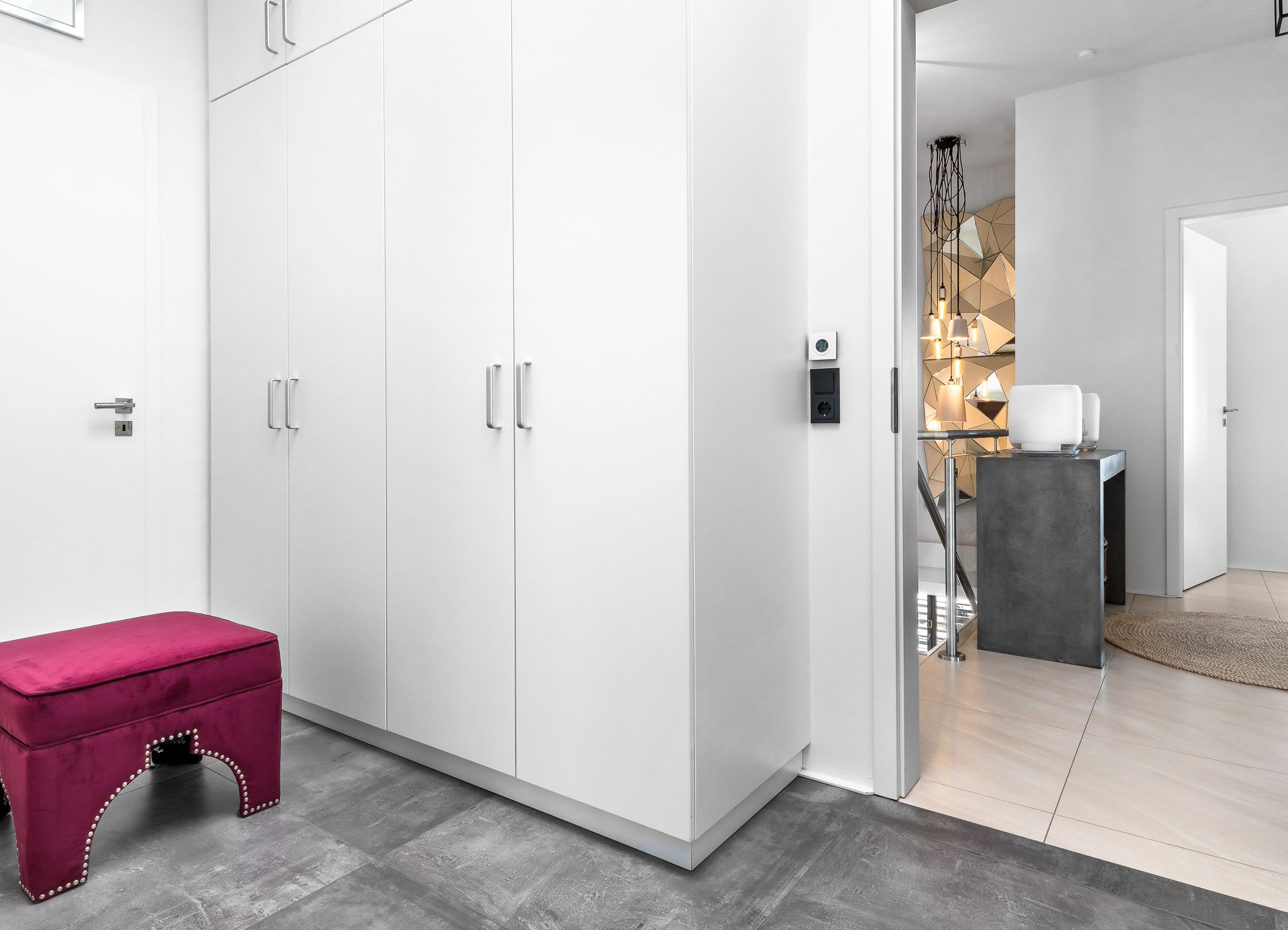 Im Obergeschoss finden Sie drei geräumige Schlafzimmer mit bodentiefen Fenstern, einem begehbaren Kleiderschrank und hochwertigen Boxspringbetten. Eine frei stehende Badewanne im Masterbedroom und eine große Sauna bieten puren Luxus zur Entspannung.