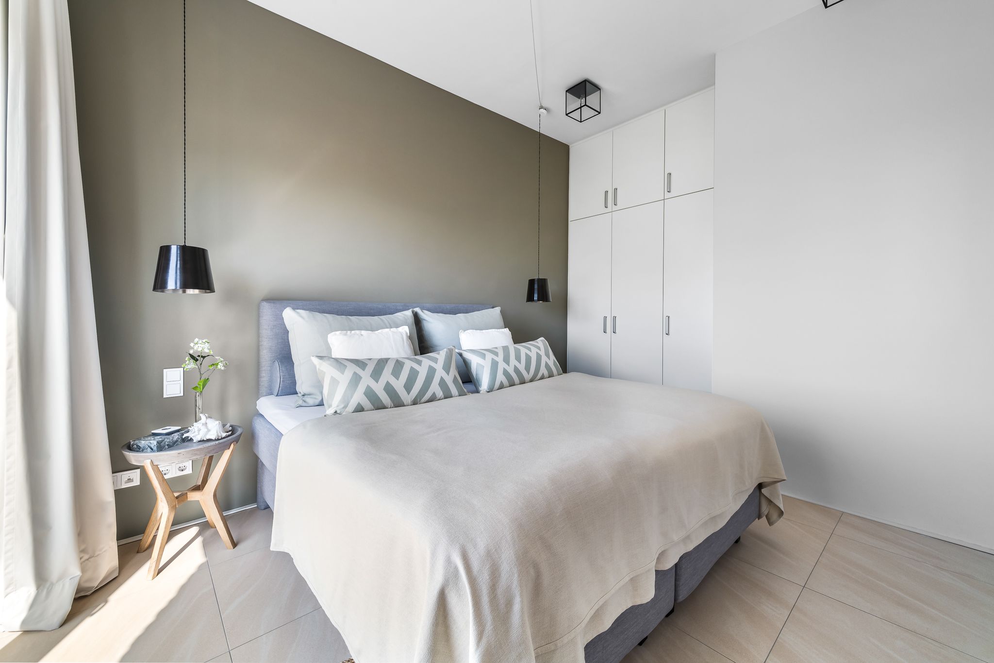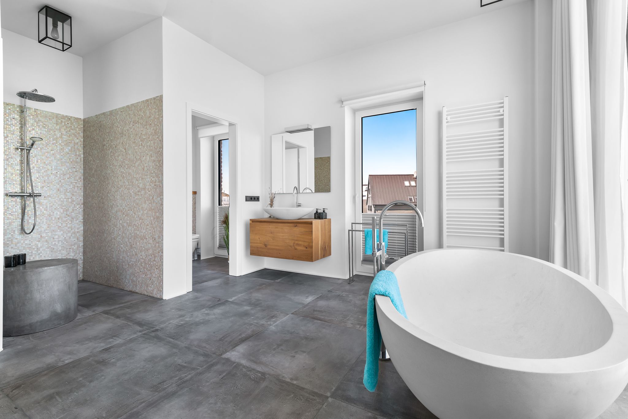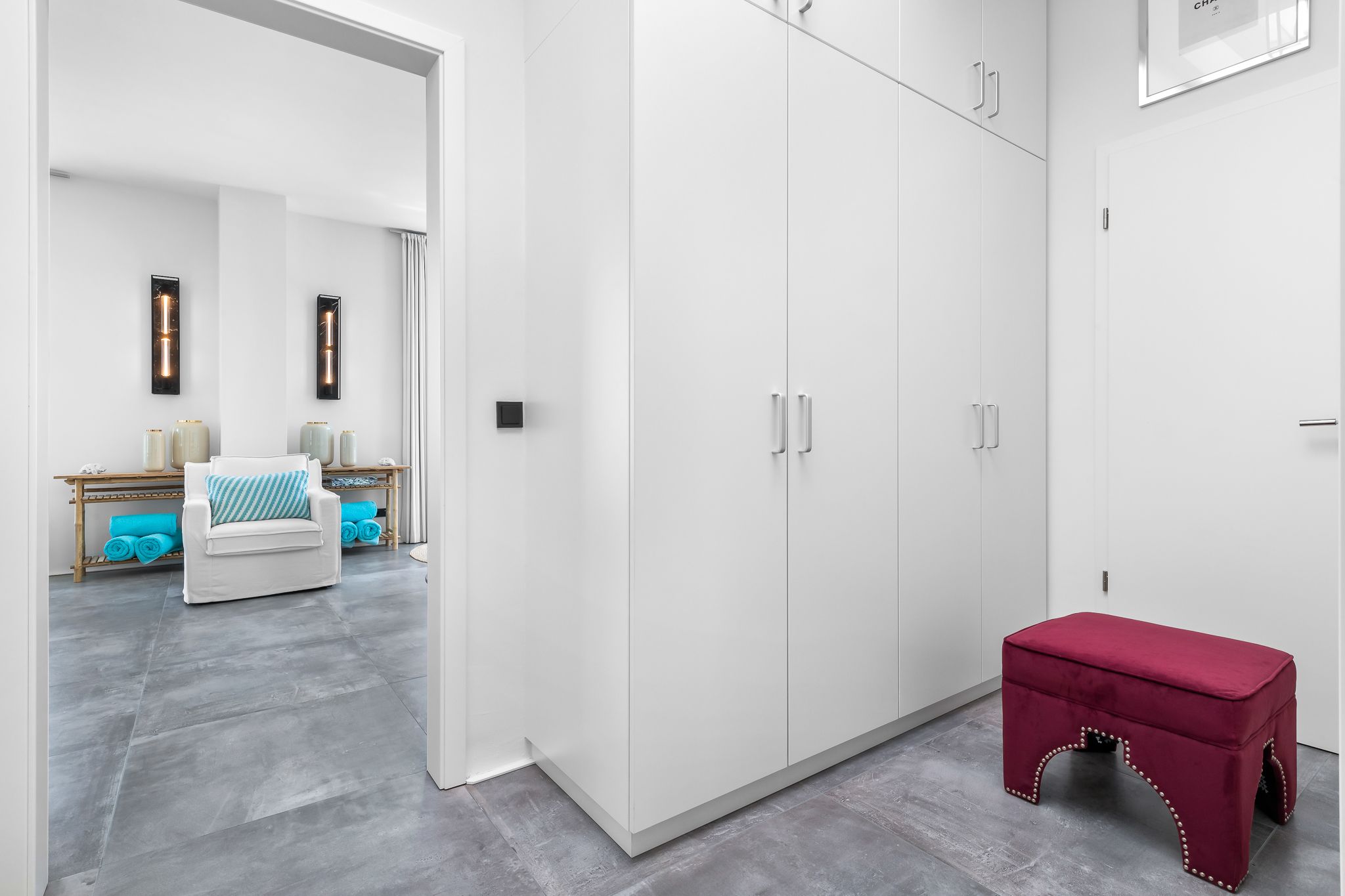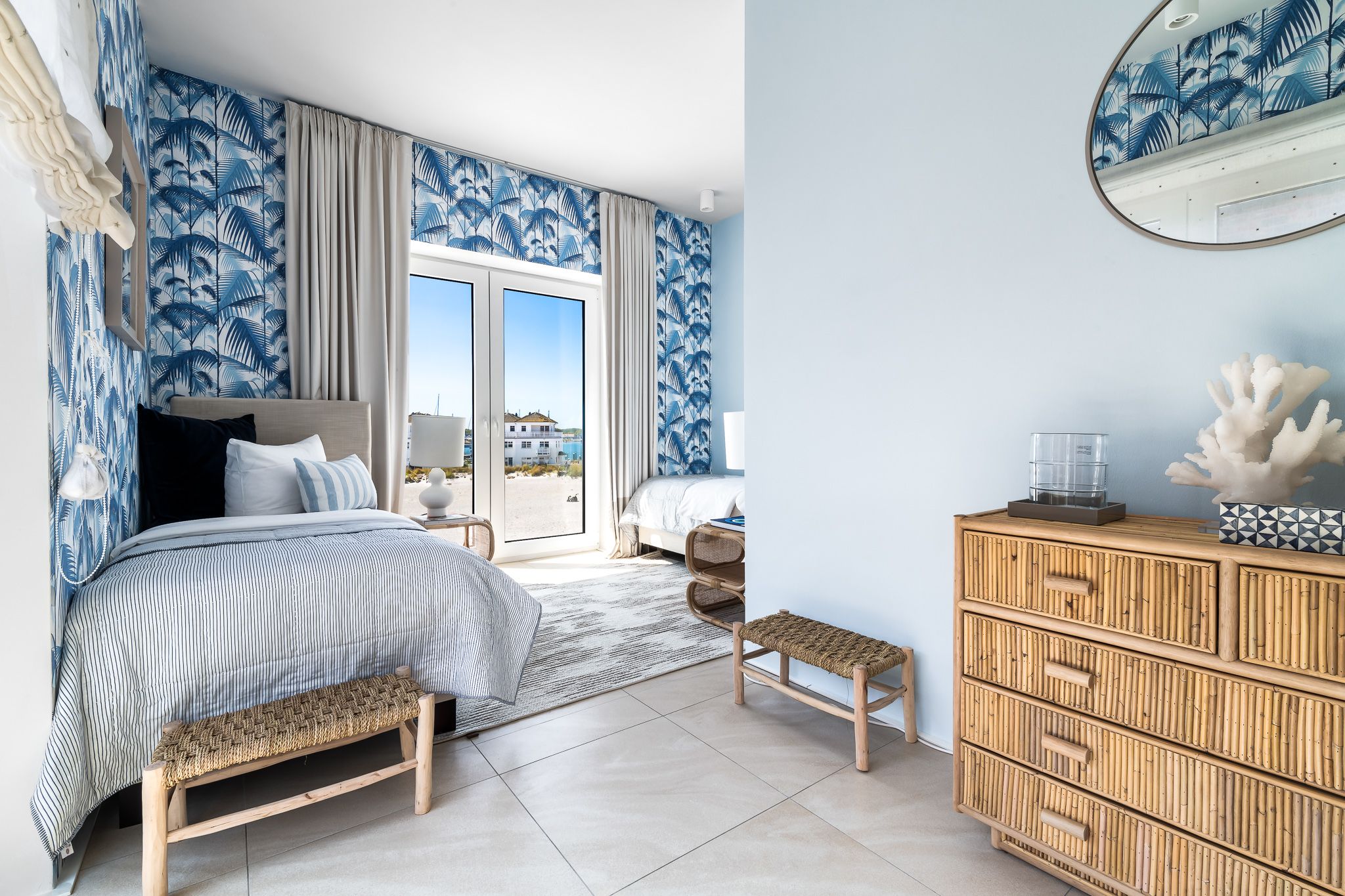 Im Obergeschoss finden Sie drei geräumige Schlafzimmer mit bodentiefen Fenstern, einem begehbaren Kleiderschrank und hochwertigen Boxspringbetten. Eine frei stehende Badewanne im Masterbedroom und eine große Sauna bieten puren Luxus zur Entspannung.
