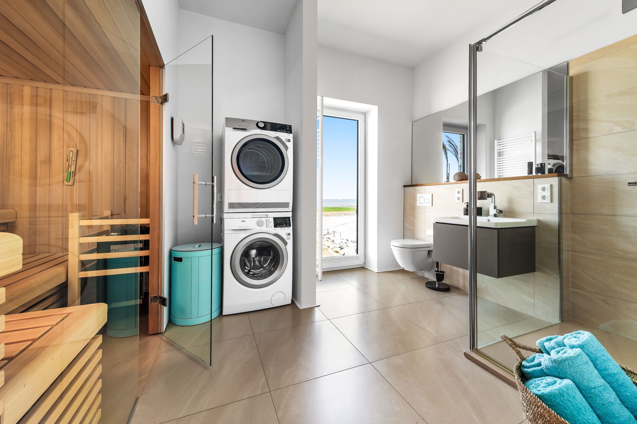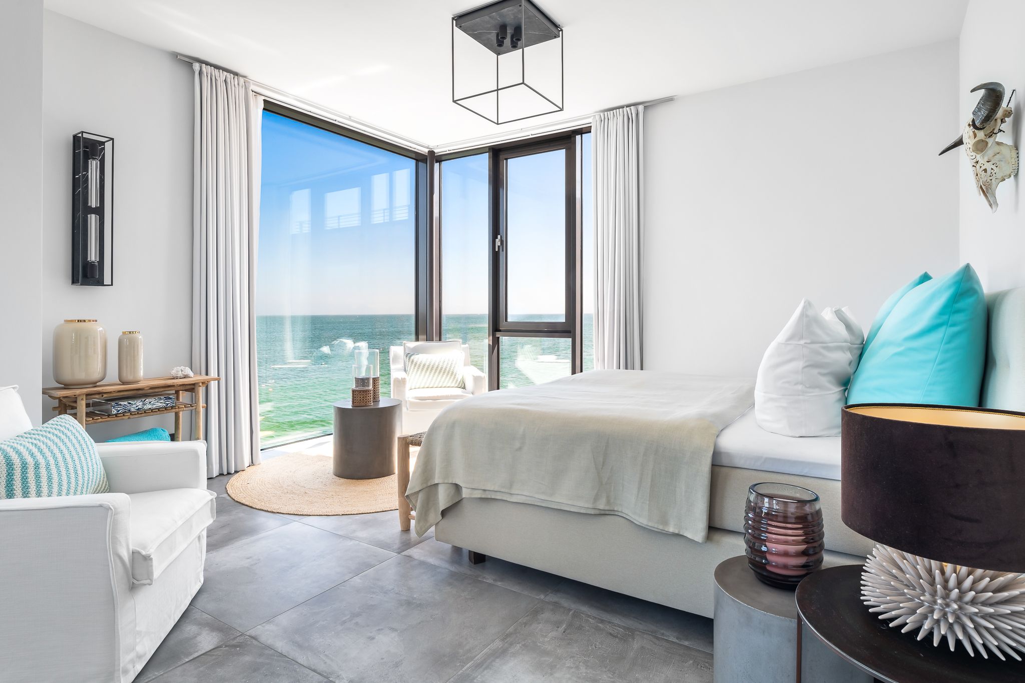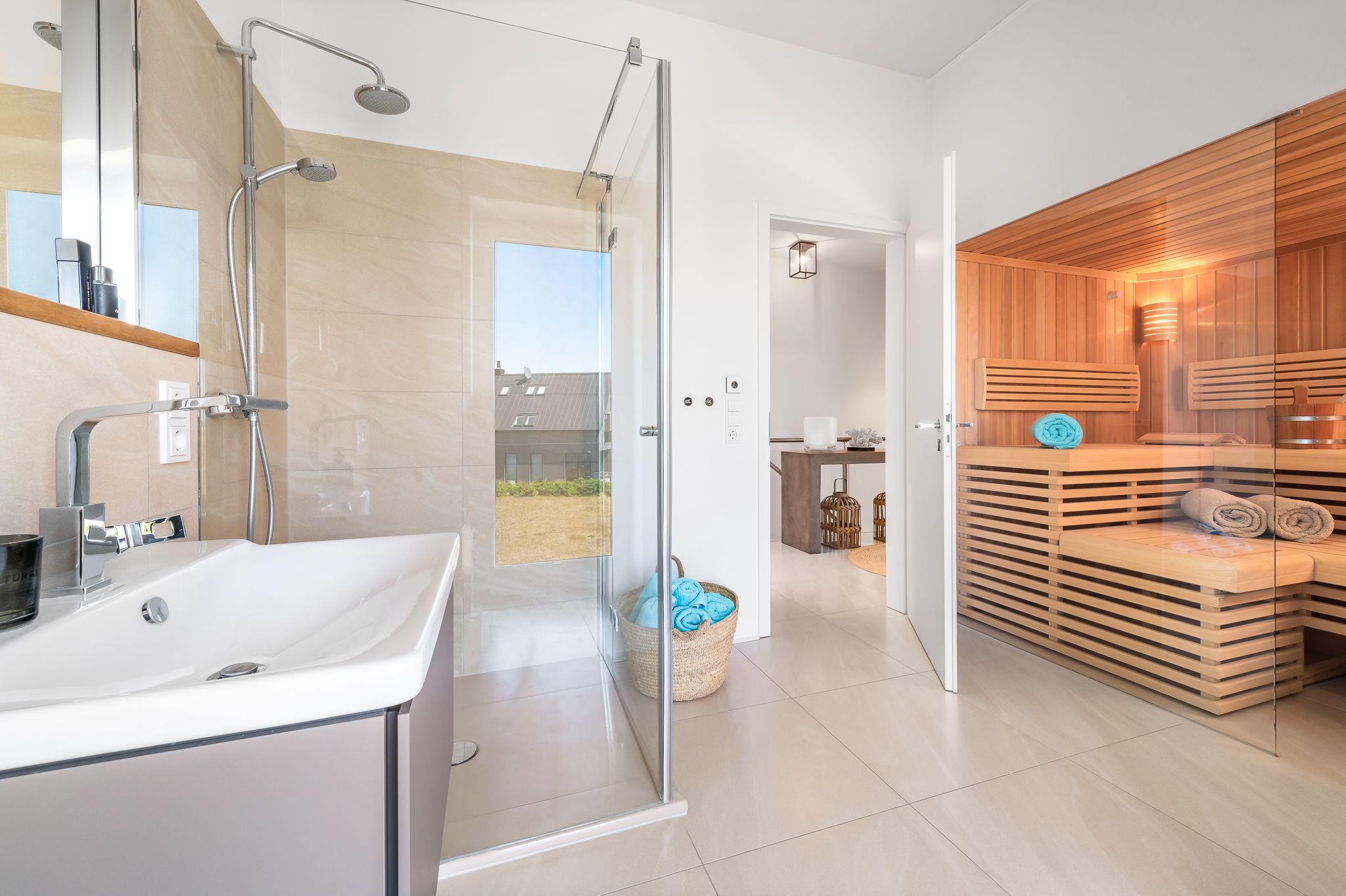 Drei Badezimmer, inklusive Sauna, und ein gemütlicher Kamin schaffen wohlige Wärme und Entspannung zu jeder Jahreszeit. Fußbodenheizung trägt zum Komfort bei. Bodentiefe Panoramafenster tauchen die Räume in Licht und bieten spektakuläre Ausblicke auf die Ostsee.