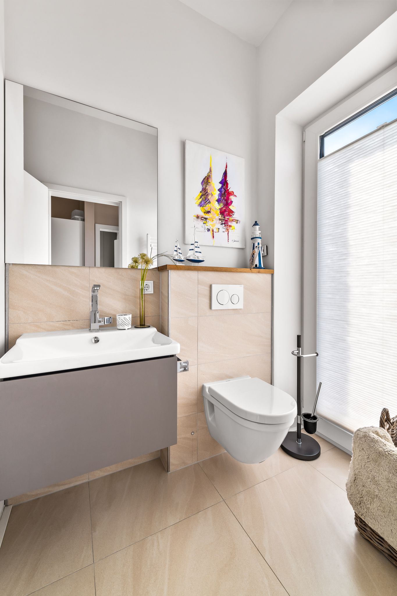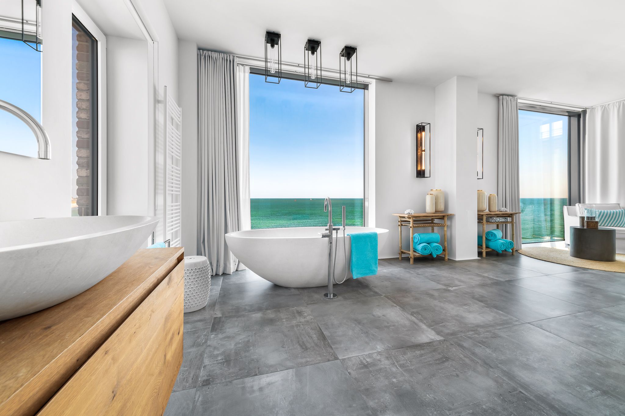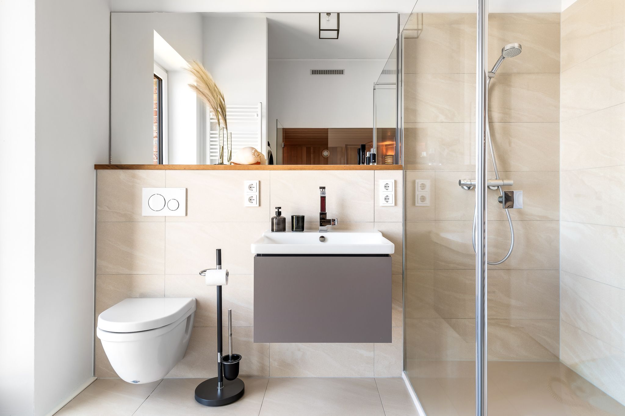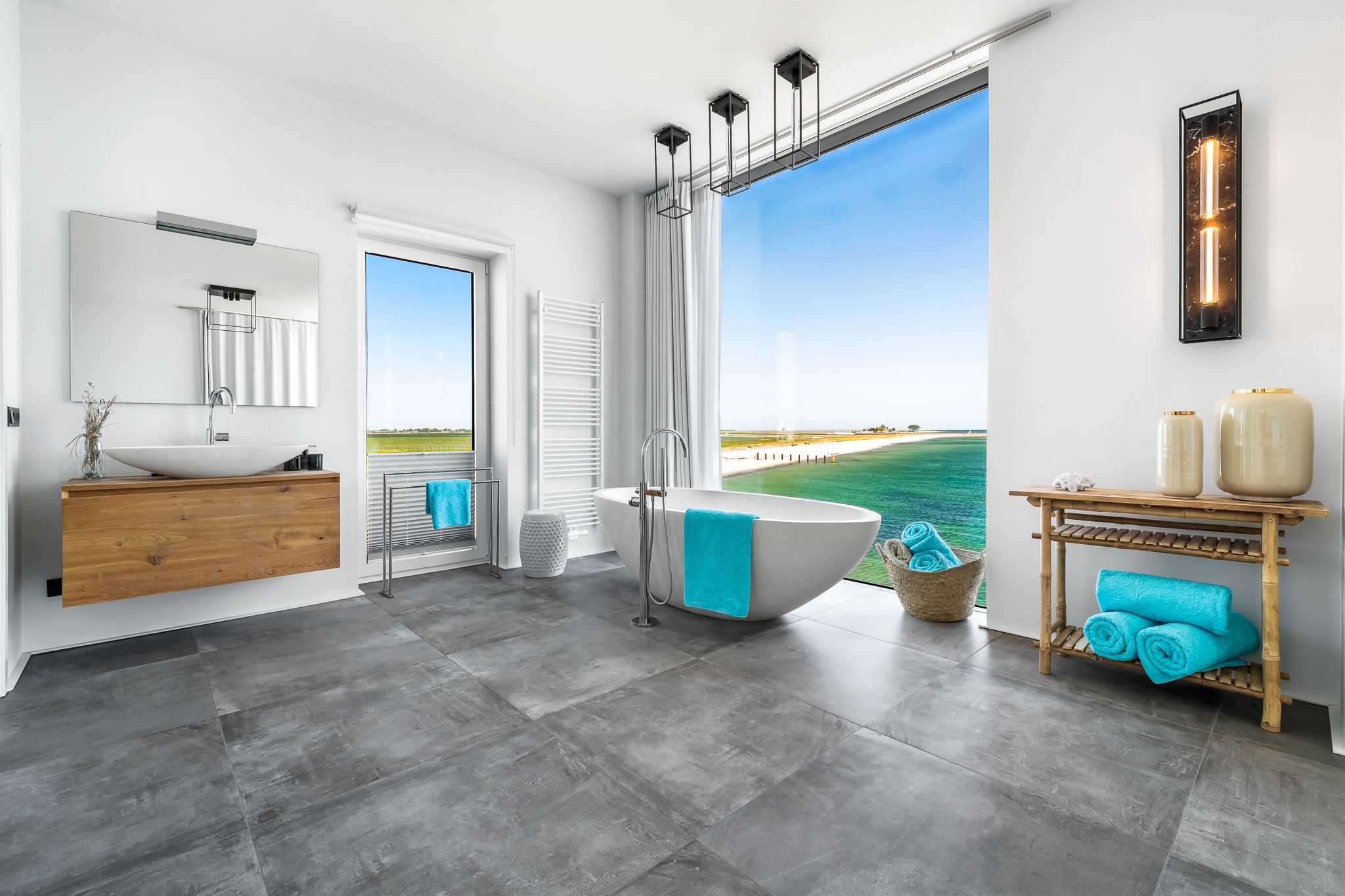 Drei Badezimmer, inklusive Sauna, und ein gemütlicher Kamin schaffen wohlige Wärme und Entspannung zu jeder Jahreszeit. Fußbodenheizung trägt zum Komfort bei. Bodentiefe Panoramafenster tauchen die Räume in Licht und bieten spektakuläre Ausblicke auf die Ostsee.