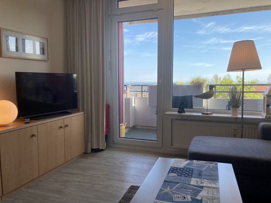 Sessel mit Hocker, TV und direktem Zugang zum möblierten Balkon