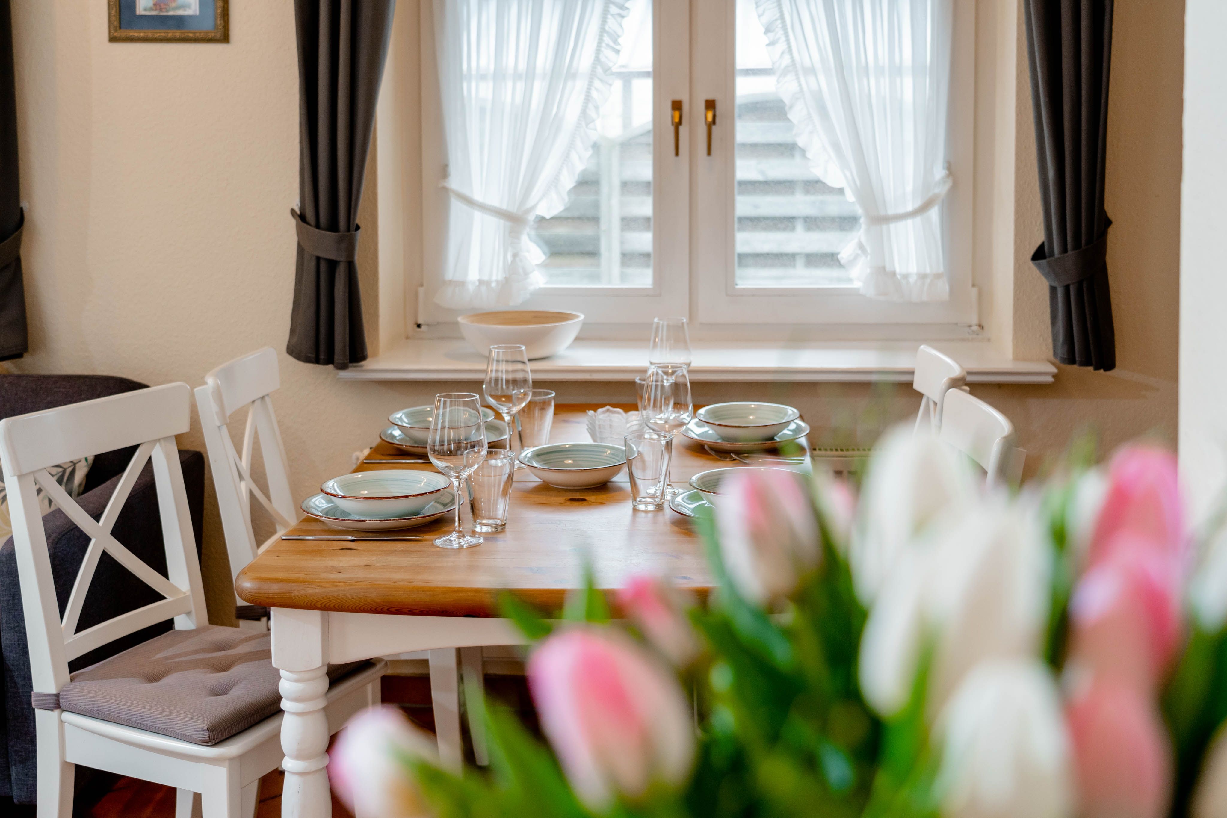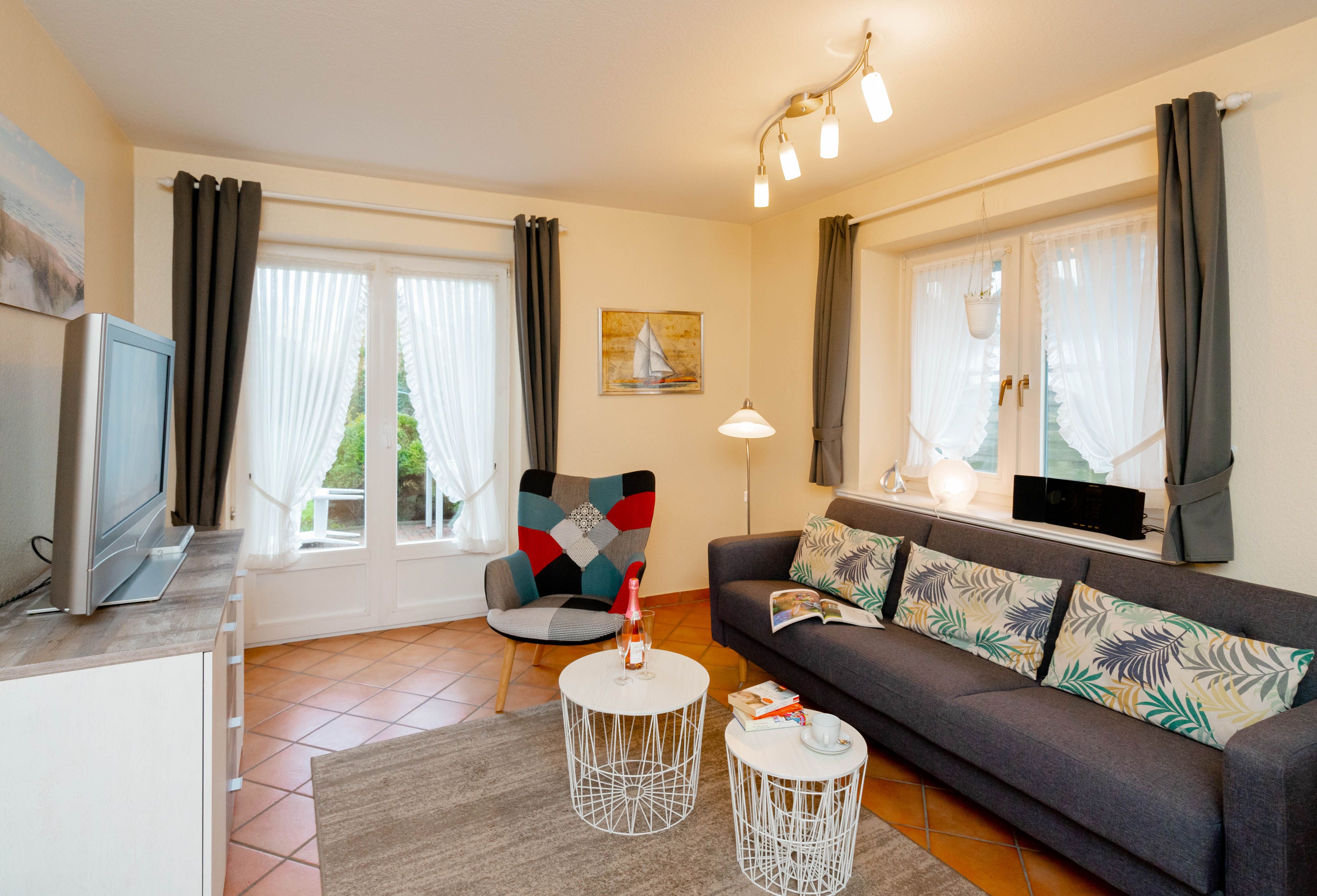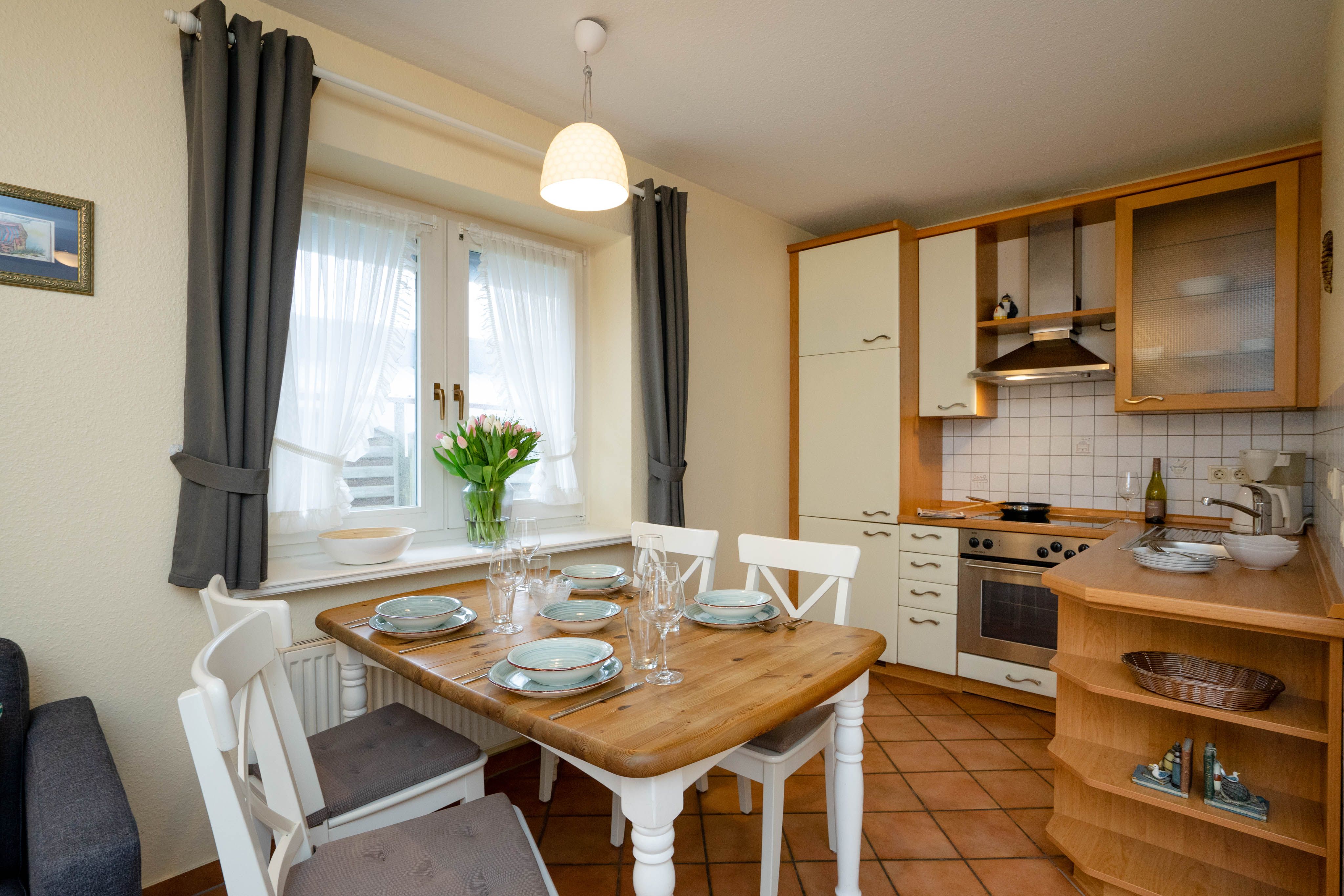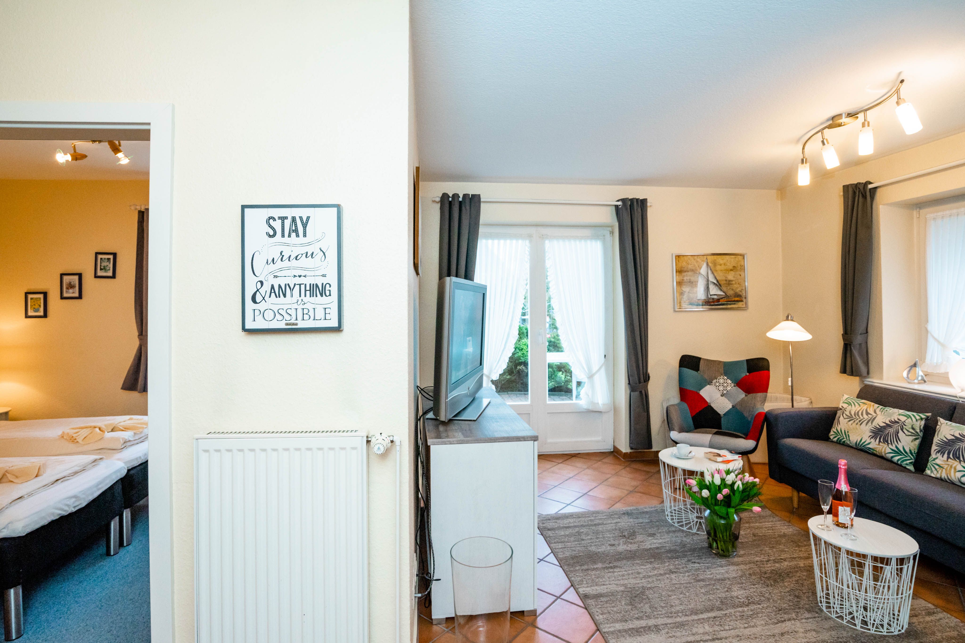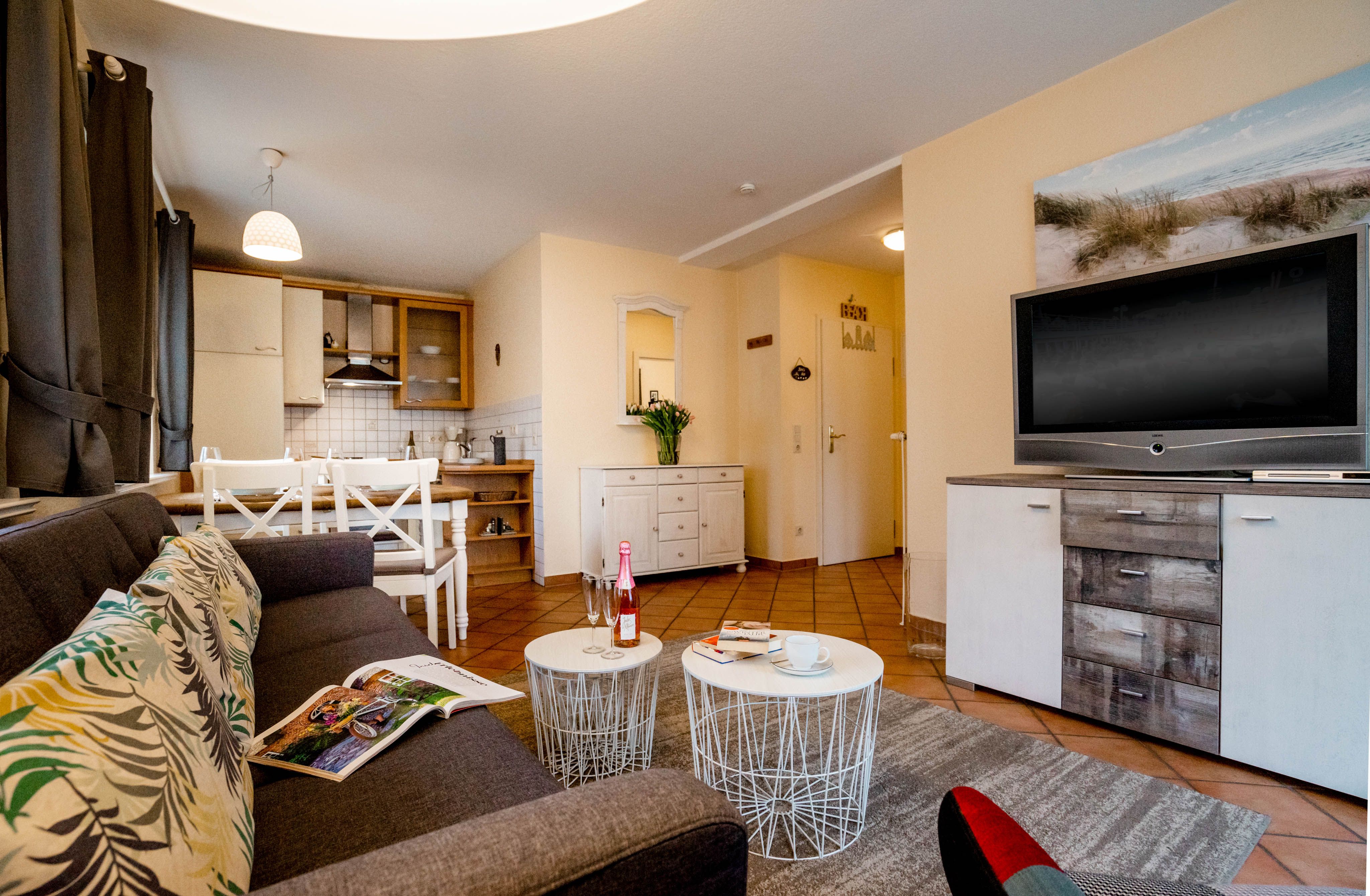 Willkommen im "Boernhüs", einer gemütlichen Zwei-Zimmer-Wohnung in ruhiger Lage von Tinum. Sie liegt ebenerdig in einem Doppelhaus (Einheit unten links), hat eine eigene Terrasse mit dem für die Insel so typischen Strandkorb, der einen manchmal die Sonne schon im T-shirt genießen lässt, wenn andere noch lange Winterjacke tragen. Diese Wohnung ist mit vier Sternen und für zwei Personen klassifiziert.