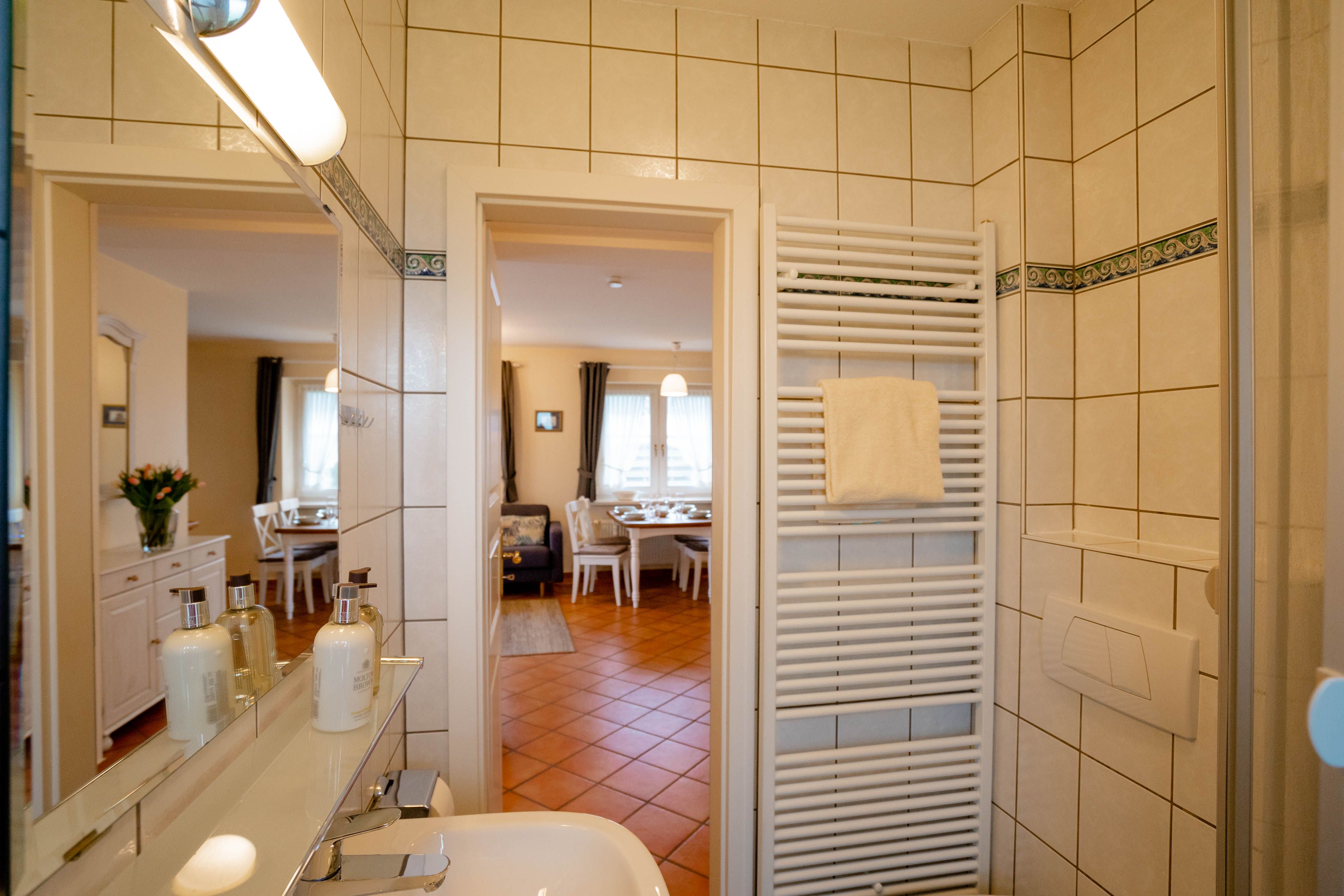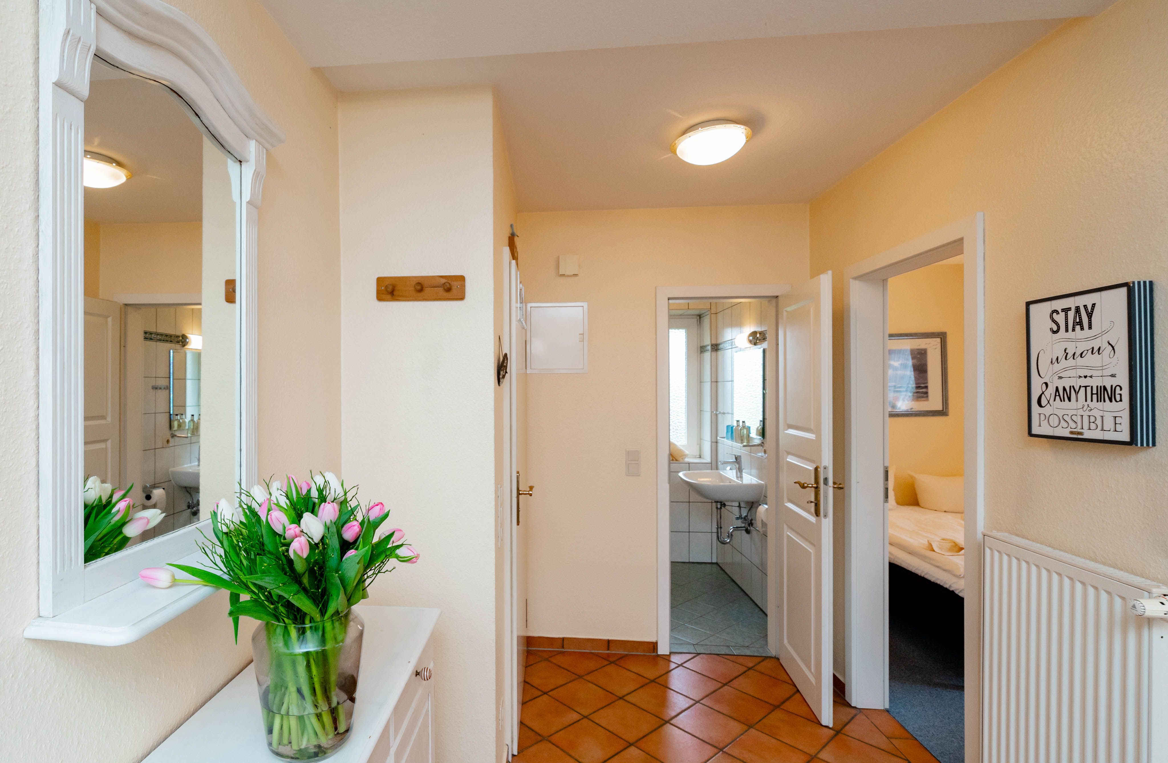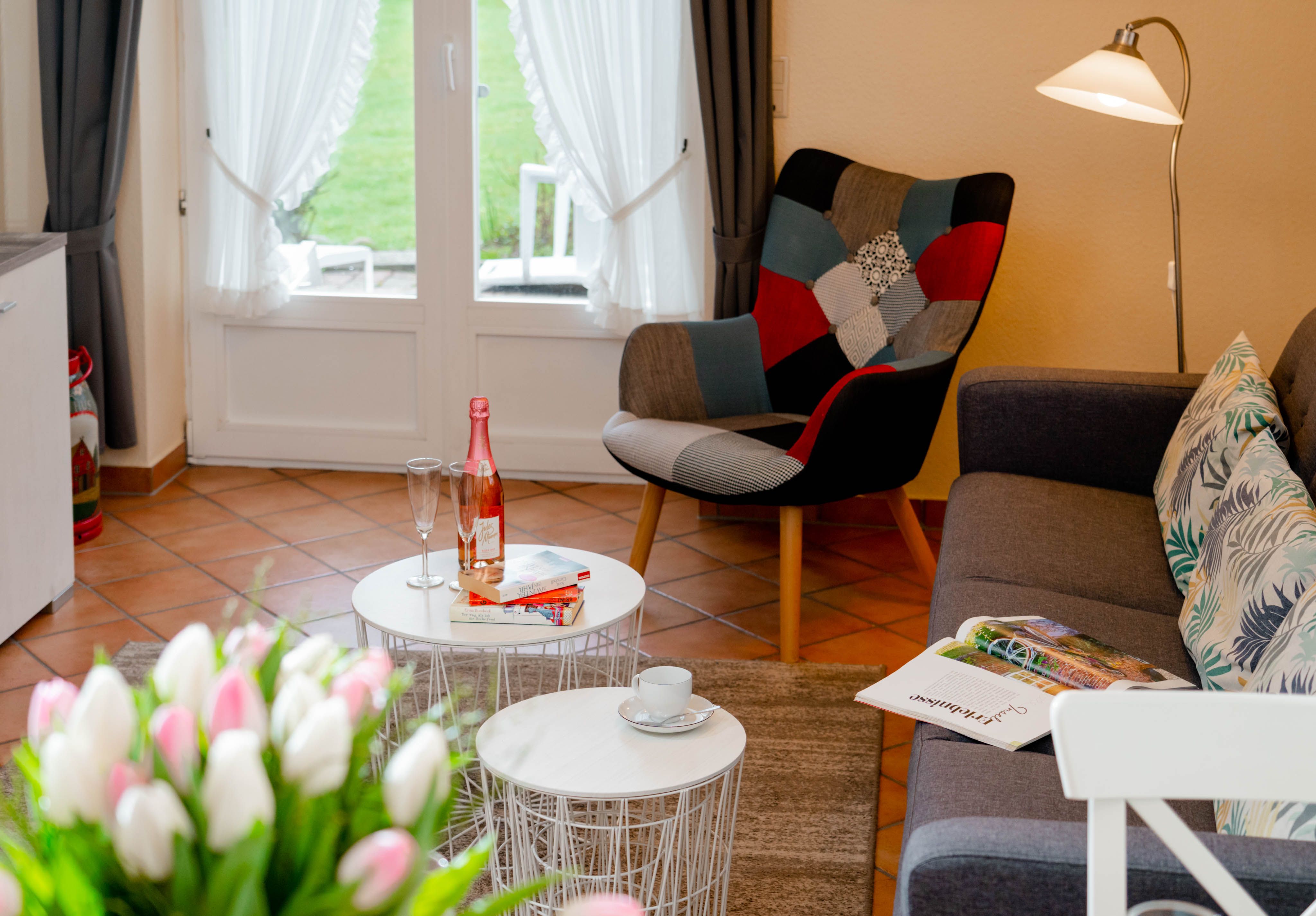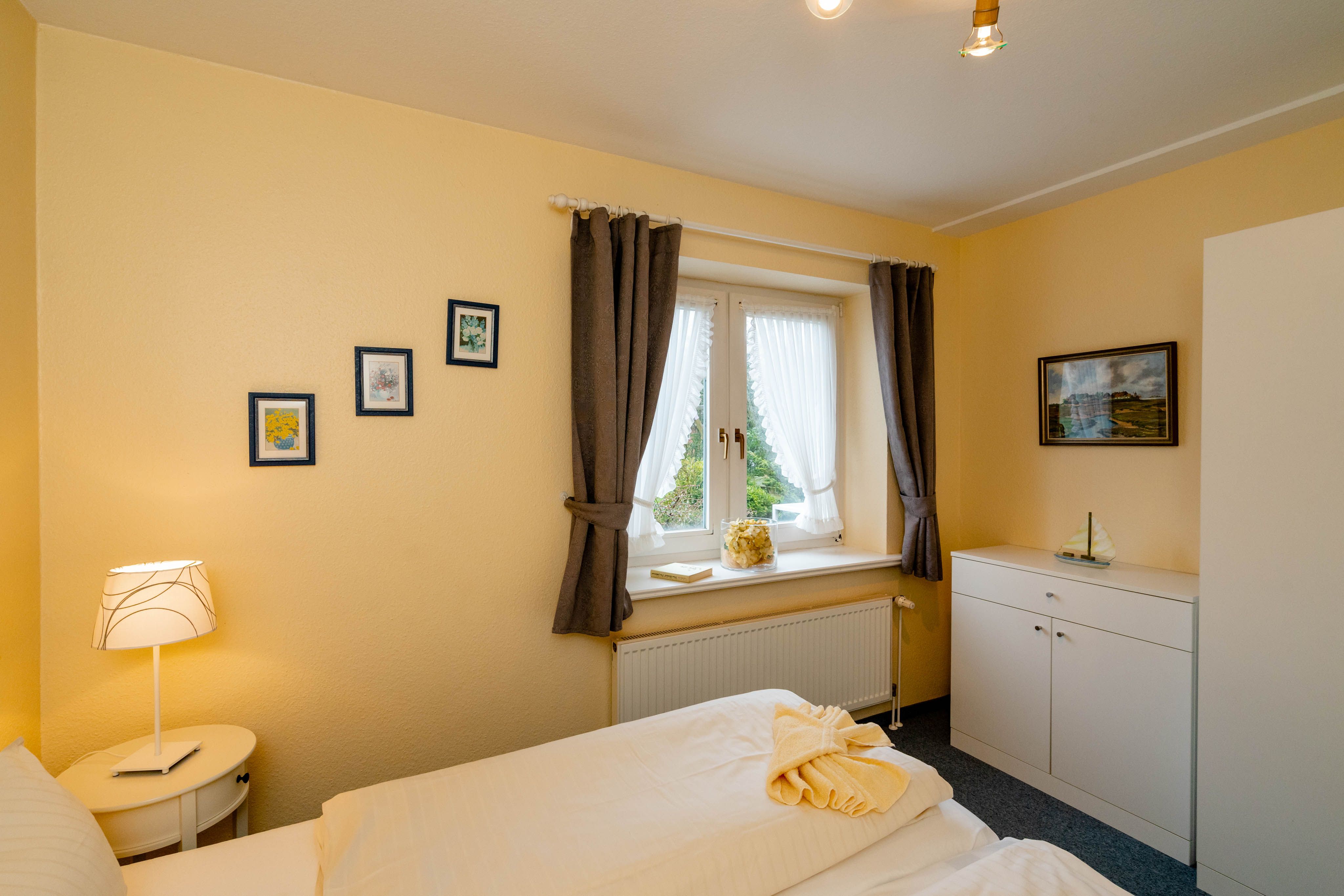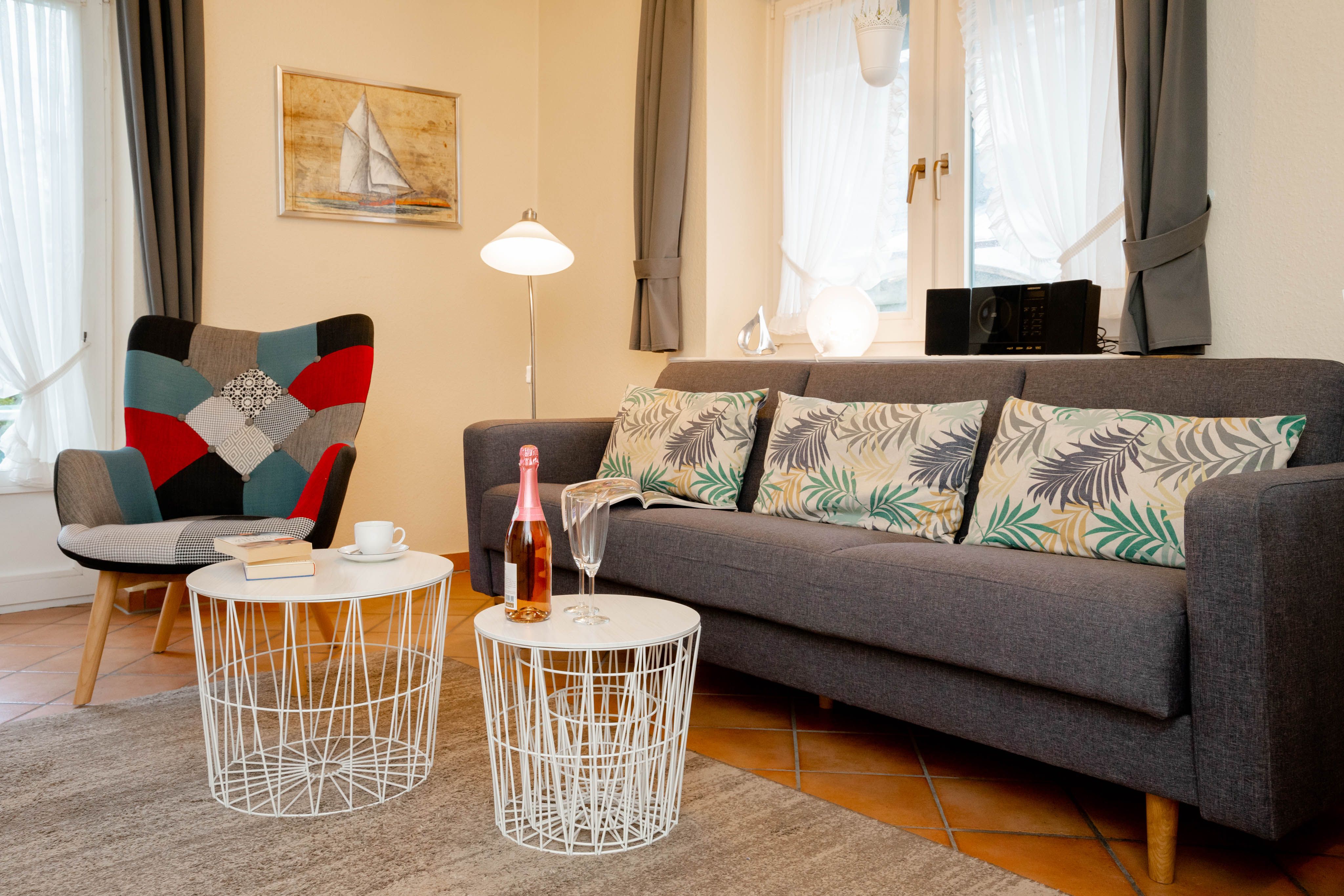 Willkommen im "Boernhüs", einer gemütlichen Zwei-Zimmer-Wohnung in ruhiger Lage von Tinum. Sie liegt ebenerdig in einem Doppelhaus (Einheit unten links), hat eine eigene Terrasse mit dem für die Insel so typischen Strandkorb, der einen manchmal die Sonne schon im T-shirt genießen lässt, wenn andere noch lange Winterjacke tragen. Diese Wohnung ist mit vier Sternen und für zwei Personen klassifiziert.