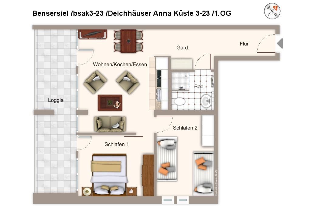 Die 57 m² große 3-Zimmer Ferienwohnung ist für bis zu 5 Personen mit Familienhund geeignet. Besonders hervorzuheben ist der großzügige und überdachte Balkon, ähnlich einer Loggia, in sonniger West-Lage. Hier lässt sich bis zum Abend das wohltuende Meeresklima und die Sonne genießen.
