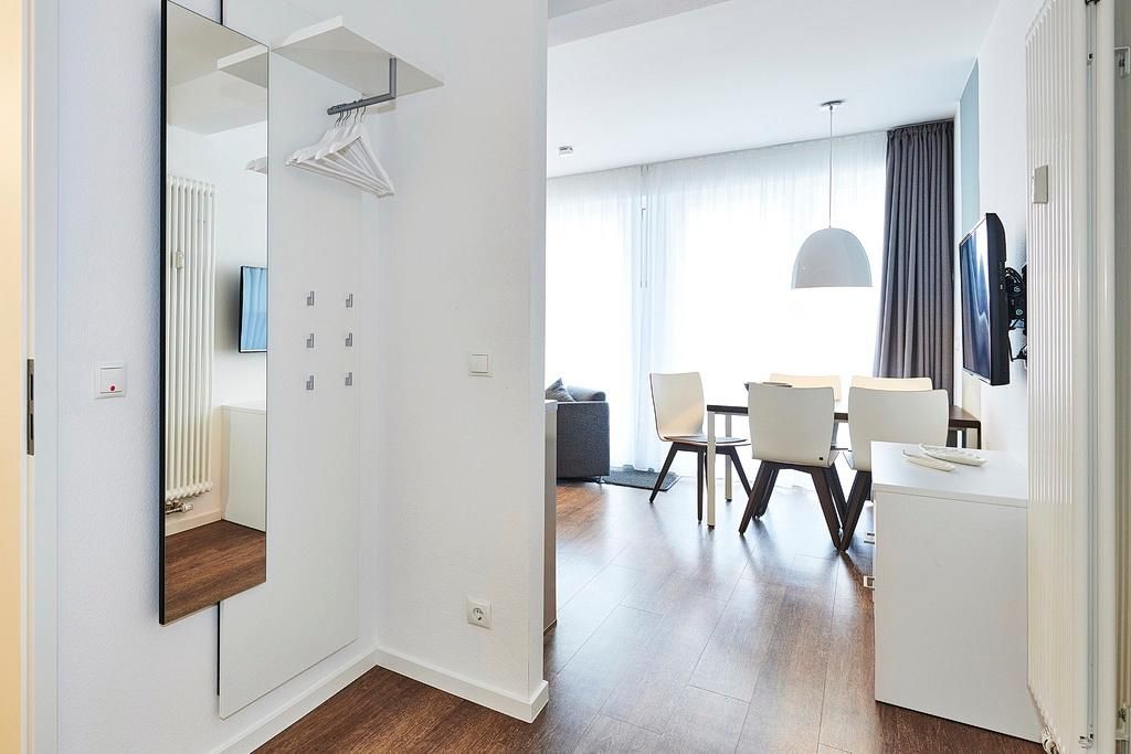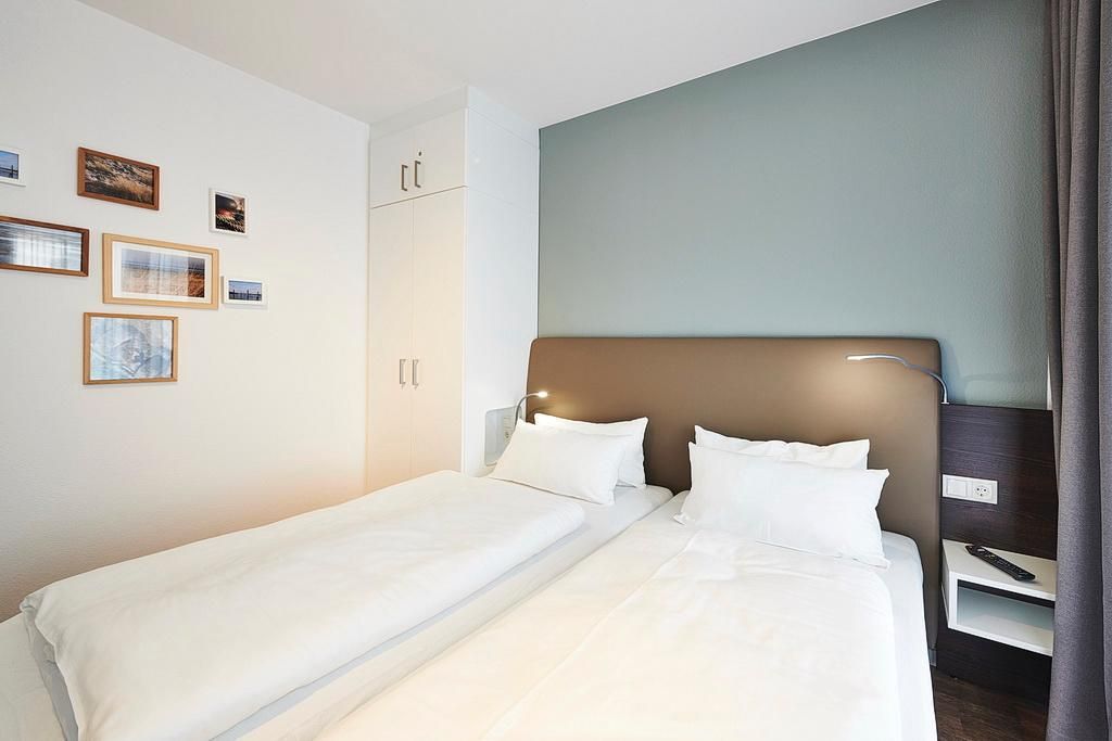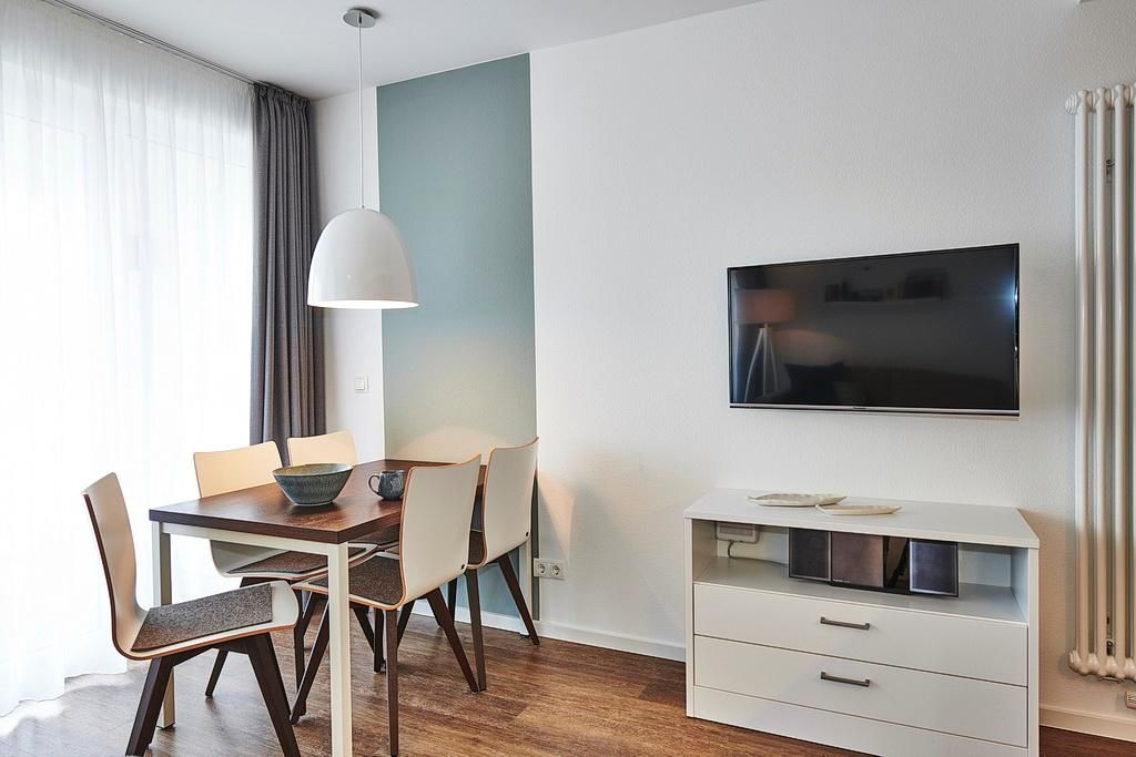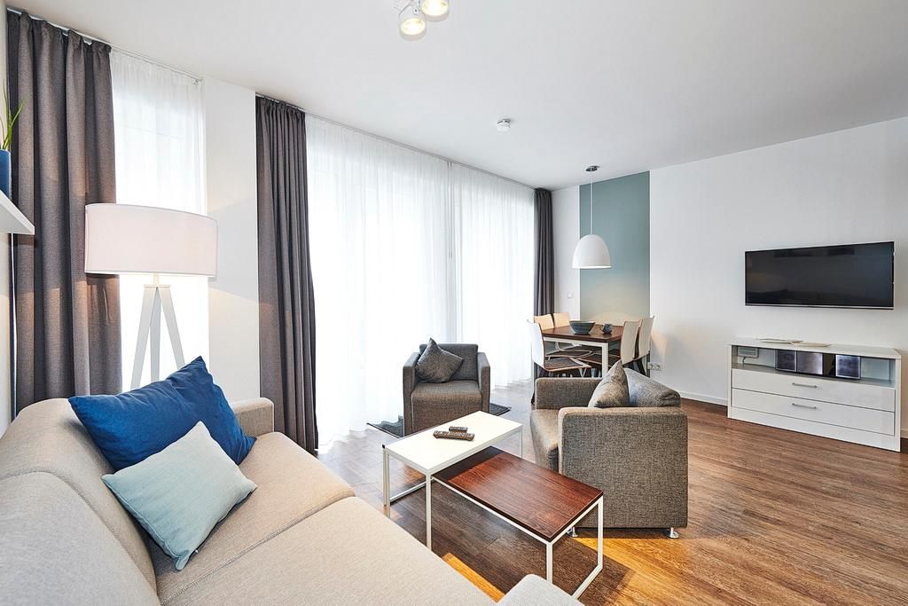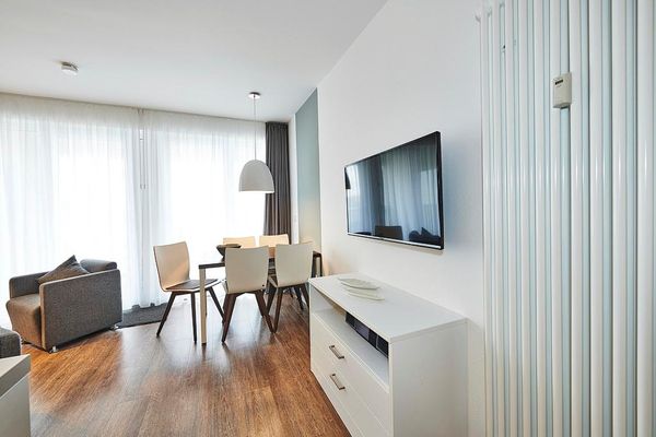 Das geschmackvoll eingerichtete Nichtraucher-Apartment verfügt über kostenfreies WLAN. Der Wohnbereich bietet eine voll ausgestattete offene Küchenzeile mit Geschirrspüler, Gefrierfach, Kaffeemaschine, Toaster, Wasserkocher und Mikrowelle mit Backfunktion sowie einen großen Flatscreen-TV und ein Radio. Das Apartment verfügt über einen Esstisch für 5 Personen und einen behaglichen Sitzbereich. Zwei separate Schlafzimmer mit jeweils einem Doppelbett stehen euch zur Verfügung. Eines davon verfügt zudem über einen eigenen Flatscreen-TV. Im stilvollen Badezimmer befinden sich eine große begehbare Dusche sowie ein Waschtisch mit Föhn und Kosmetikspiegel. Nach einem erlebnisreichen Urlaubstag entspannt ihr auf dem überdachten und mit Gartenmöbeln für 5 Personen ausgestatteten Balkon. Der Balkon ist vom Wohnbereich und vom Hauptschlafzimmer aus zugänglich.
