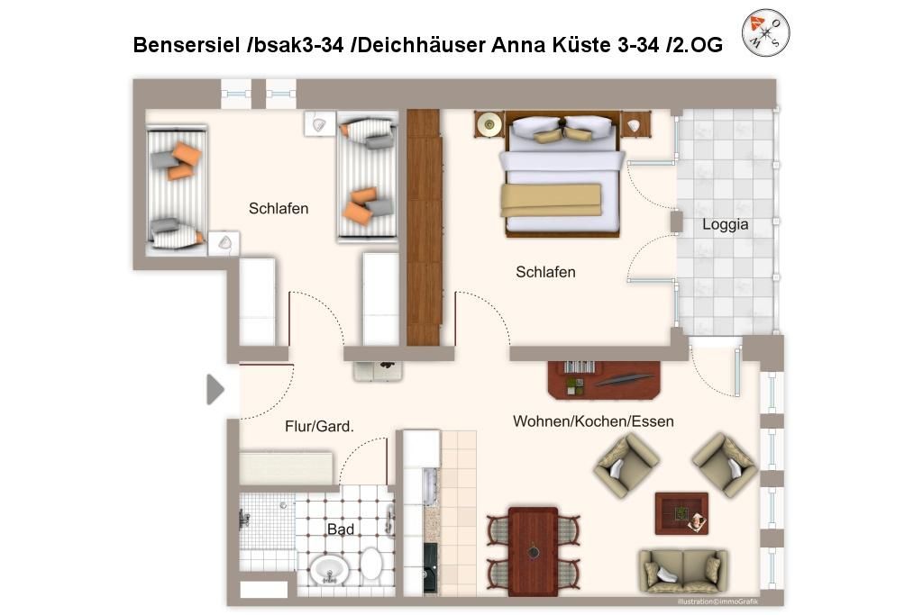 Die moderne und helle Ferienwohnung befindet sich im zweiten Obergeschoss des Deichhauses 3, im Herzen von Bensersiel, nur 500 Meter vom Sandstrand und der Nordsee entfernt. In der unmittelbaren Umgebung findet ihr zahlreiche Einkaufsmöglichkeiten, Restaurants und Cafés; auch die Nordseetherme, das Meerwasserfreibad mit großer Wasserrutsche und der Sportthemenpark sind fußläufig gut erreichbar. Unser Tipp: Macht einen Tagesausflug nach Langeoog - die knapp einstündige Fährverbindung zwischen Bensersiel und der autofreien Insel verkehrt mehrfach täglich. Der Fähranleger liegt nur einen kleinen Spaziergang (ca. 1 km) von den Deichhäusern entfernt.