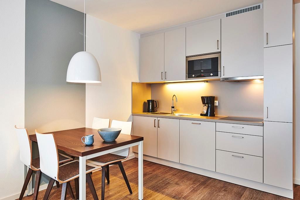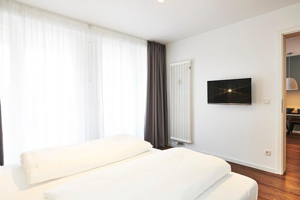 Das geschmackvoll eingerichtete Nichtraucher-Apartment verfügt über kostenfreies WLAN. Der Wohnbereich bietet eine voll ausgestattete offene Küchenzeile mit Geschirrspüler, Gefrierfach, Kaffeemaschine, Toaster, Wasserkocher und Mikrowelle mit Backfunktion sowie einen großen Flatscreen-TV und ein Radio. Das Apartment verfügt über einen Esstisch für 4 Personen und einen behaglichen Sitzbereich. Zwei separate Schlafzimmer stehen euch zur Verfügung. Eines davon verfügt über ein Doppelbett und einen eigenen Flatscreen-TV, ein weiteres über zwei Einzelbetten. Ein Kinderbett kann gegen Entgelt aufgestellt werden. Im stilvollen Badezimmer befinden sich eine große begehbare Dusche sowie ein Waschtisch mit Föhn und Kosmetikspiegel. Nach einem erlebnisreichen Urlaubstag entspannt ihr auf dem überdachten und mit Gartenmöbeln für 4 Personen ausgestatteten Balkon. Der Balkon ist vom Wohnbereich und vom Hauptschlafzimmer aus zugänglich.